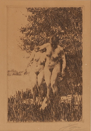 JONATHAN BAIRD. Pine trees by the lake, etching, signed.