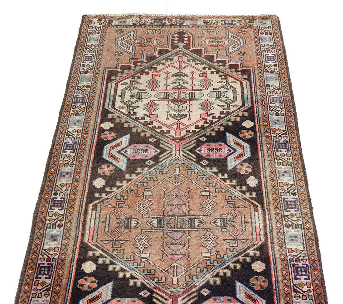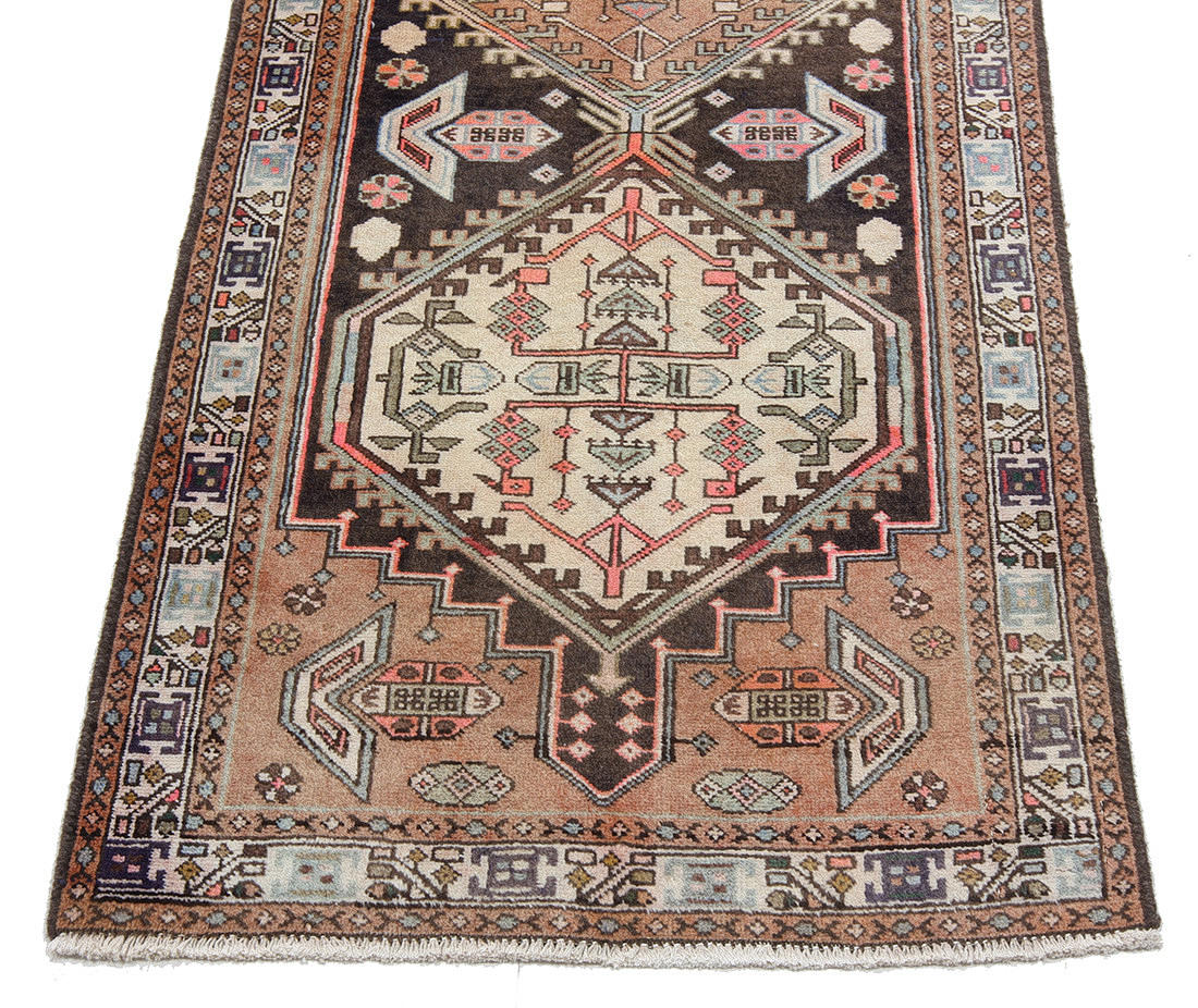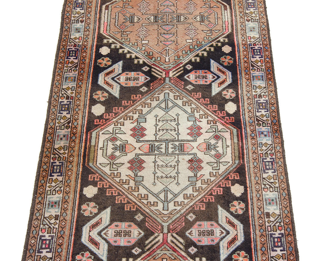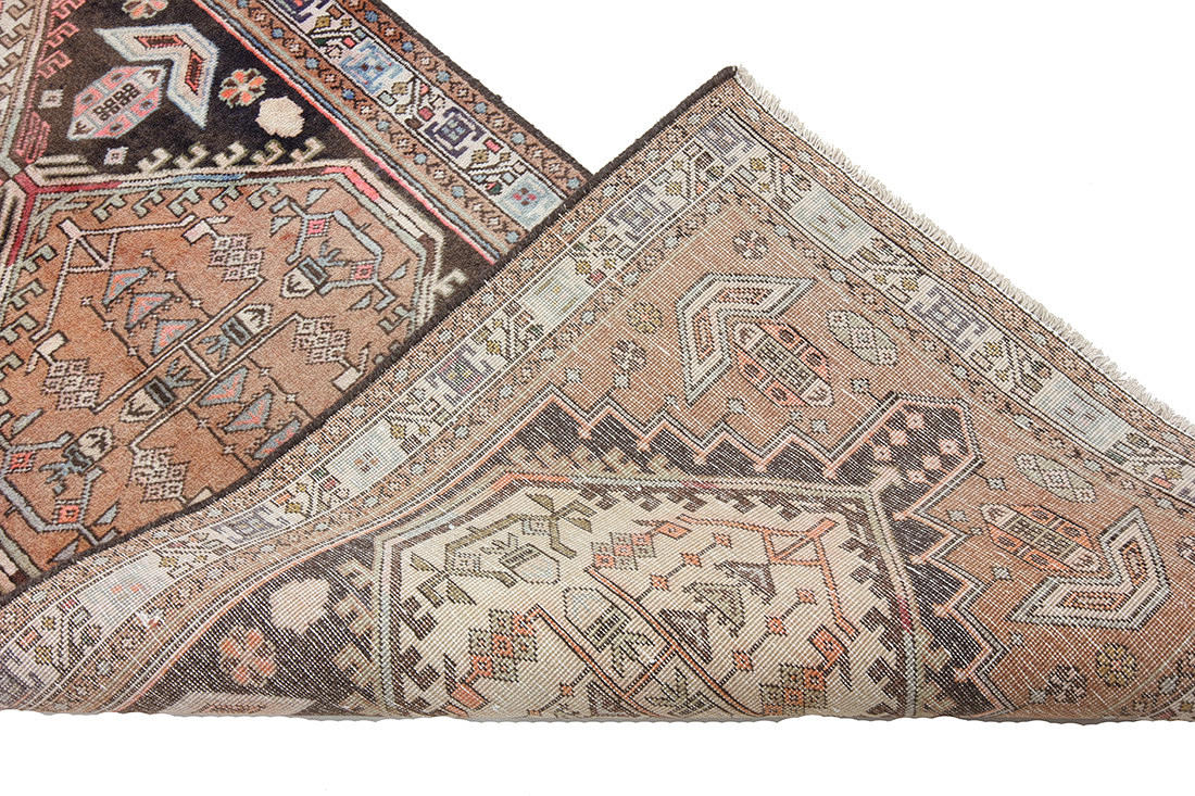 Hand-knotted Persian rug in wool on cotton warp. Geometric medallion pattern mainly in earth tones.
