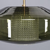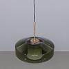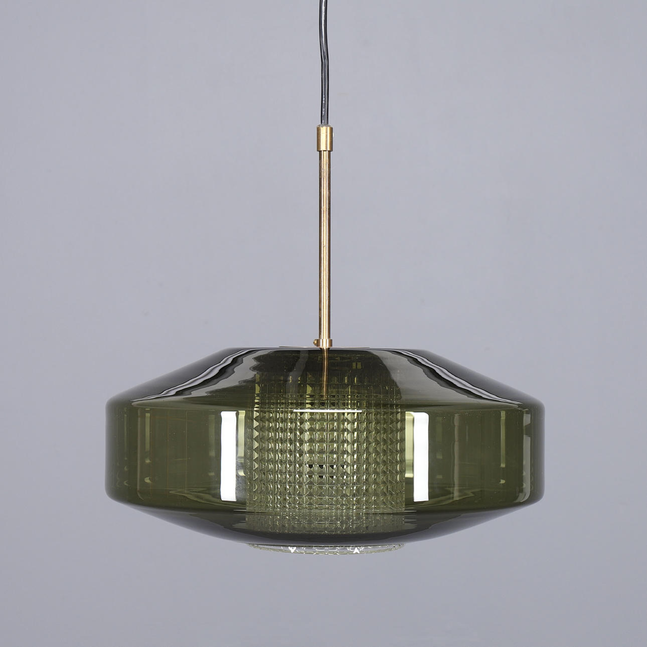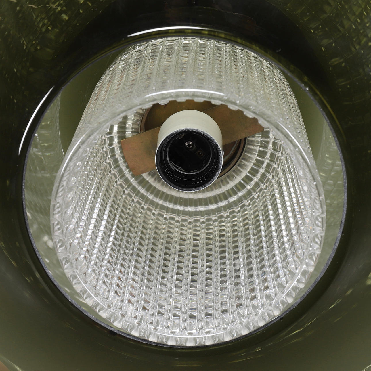 Shade in green glass, inner dome in clear glass, frame in brass, diameter approx. 40 cm.