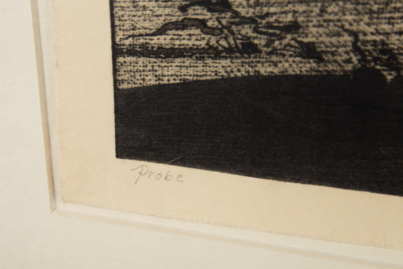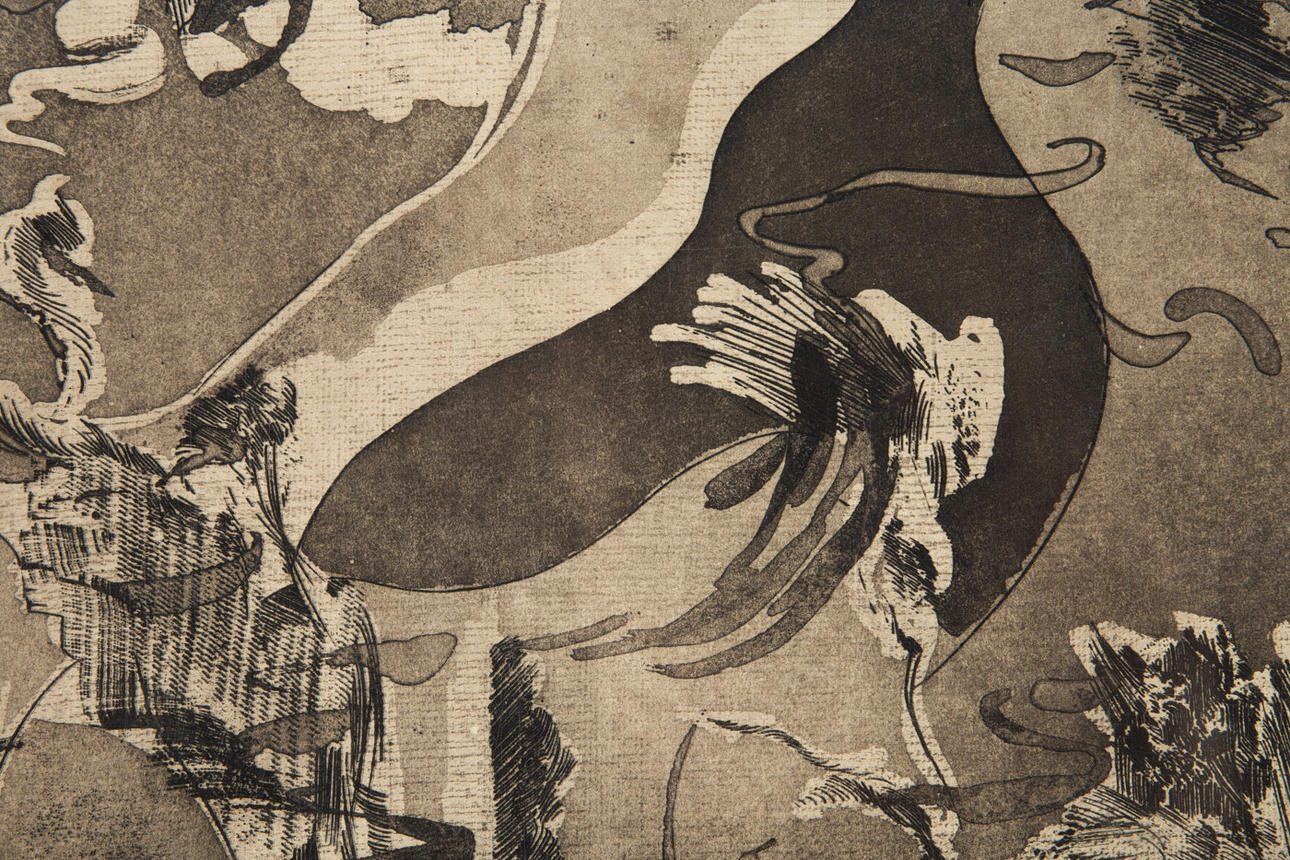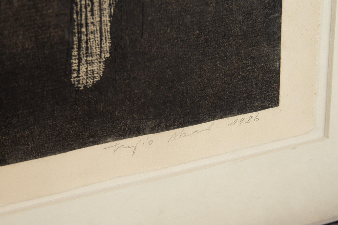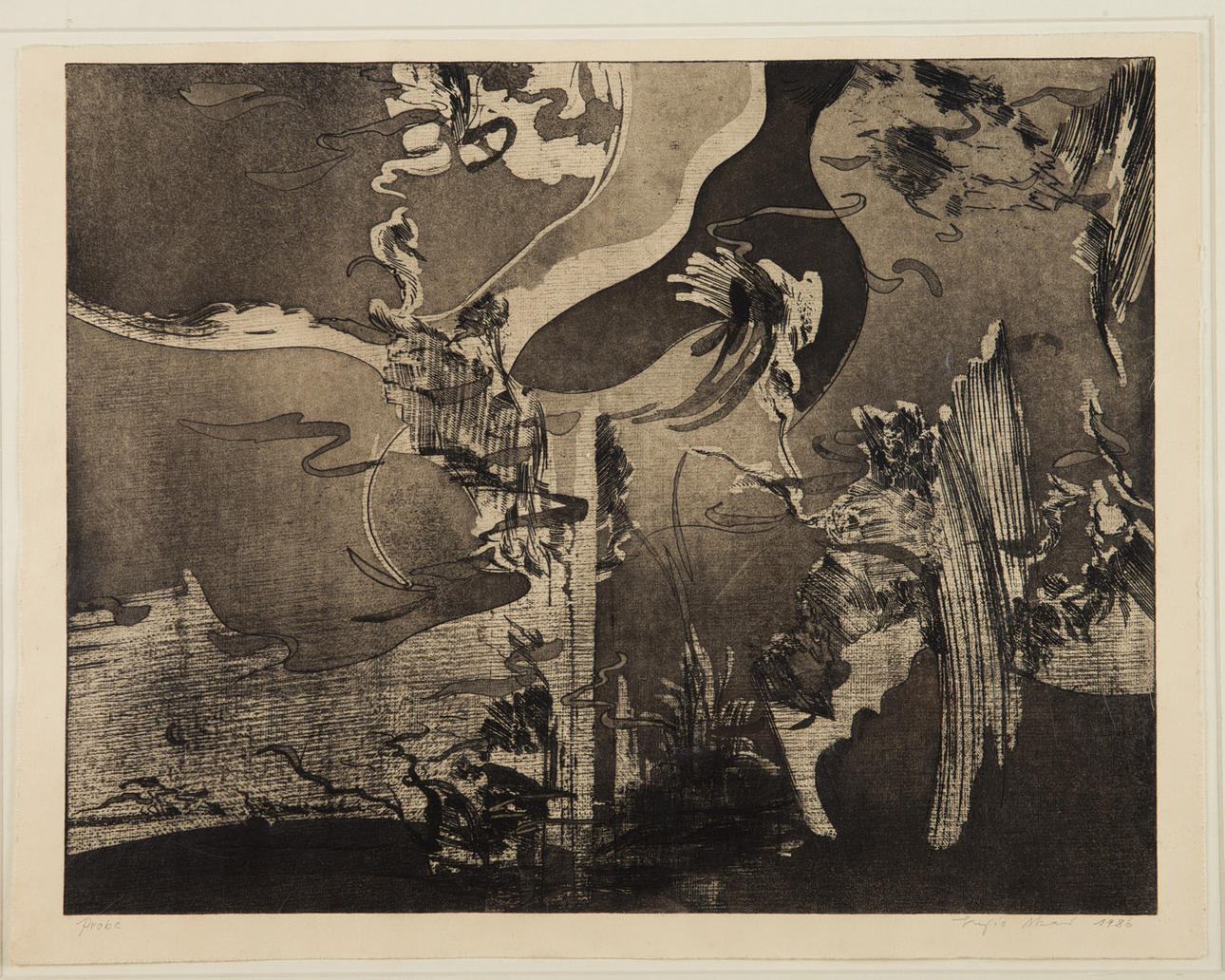 Fujio Akai (b. 1945 in Pandang), etching, abstract composition, 1986. Abstract composition in gray and black, signed and dated lower right, inscribed as sample lower left, 48.5x37cm (66.5x47.5cm).