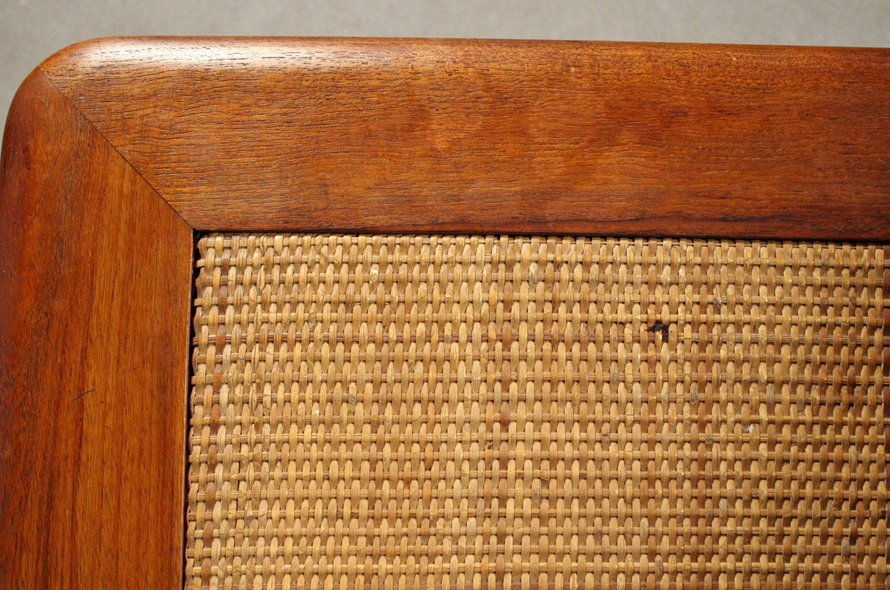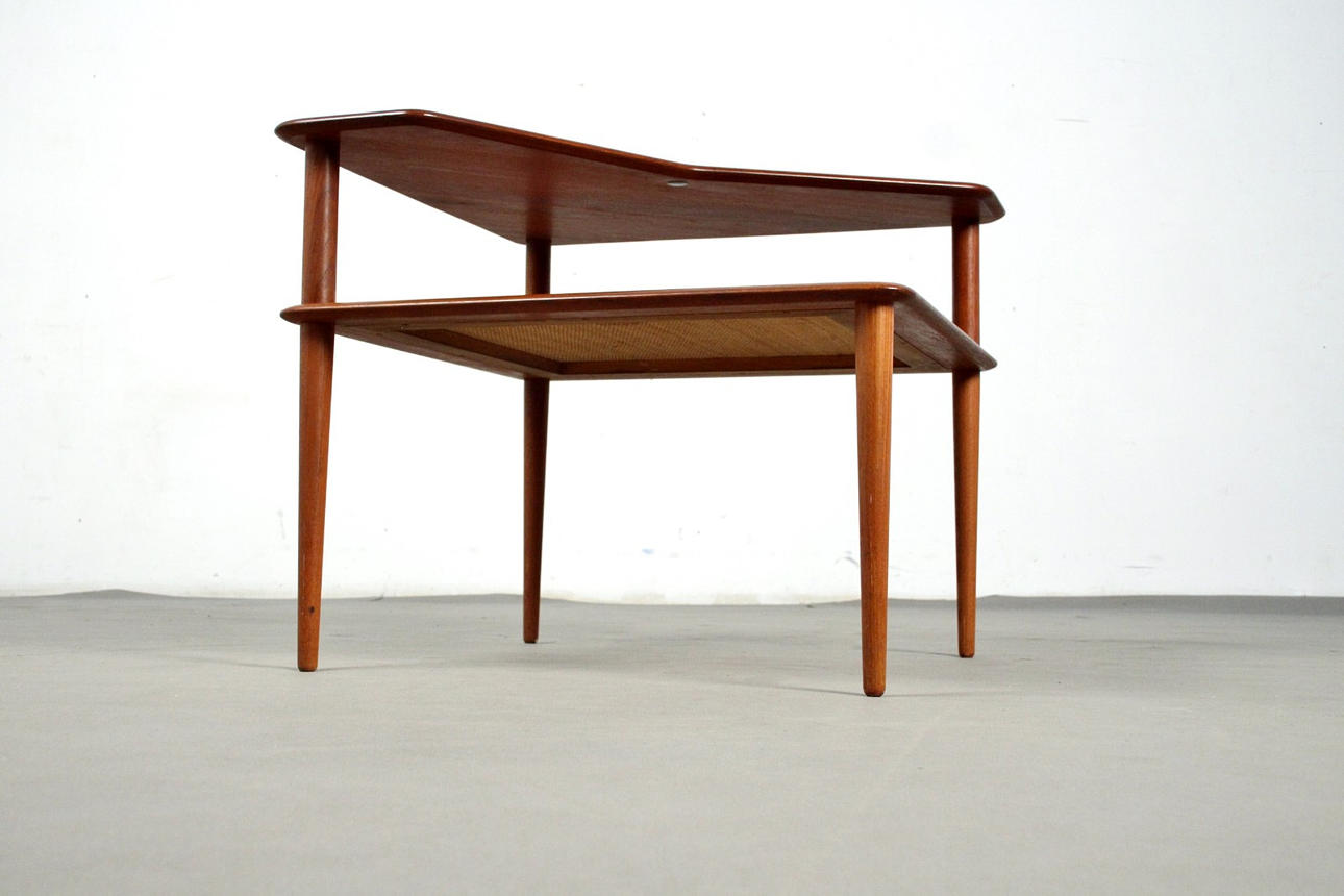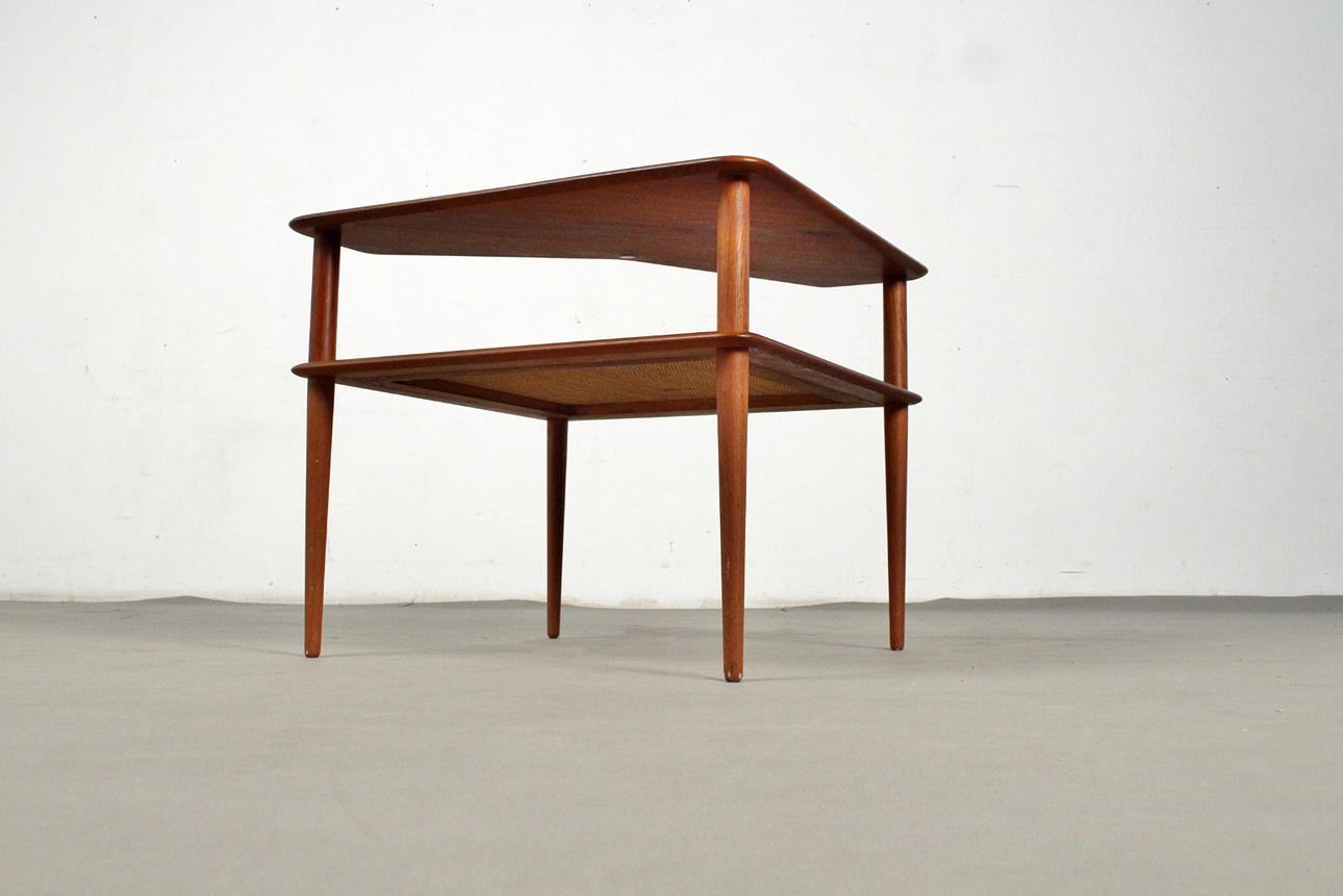 Corner table for the Minerva group / coffee table, model FD-519, Danish design from 1956 by Peter Hvidt + Orla Mølgaard Nielsen for France & Daverkosen. Marked with metal plaque and stamp. Solid teak construction with tabletop in teak veneer and wickerwork.