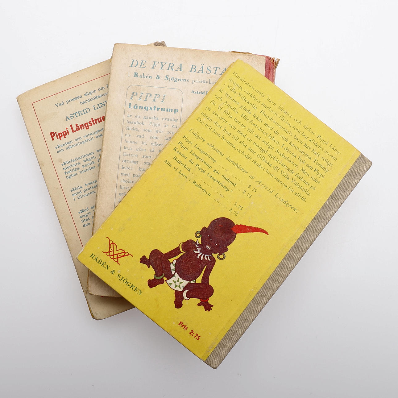 Lindgren, Astrid, Swedish writer, (1907-2002). Three jobs. 1. Pippi Longstocking boards. Illustrated by Ingrid Nyman. Rabén & Sjögren, Stockholm, 1946. First edition, second printing. Small 8vo in the publisher's illustrated cloth spine binding. 192 p. 2. Pippi Longstocking in the South Sea. Illustrated by Ingrid Nyman. Rabén & Sjögren, Stockholm, 1948. 2nd edition, 51st millennium. Small 8vo in the publisher's illustrated cloth spine binding. 130 p. 3. Pippi Longstocking. Illustrated by Ingrid Nyman. Rabén & Sjögren, Stockholm, 1946. 2nd edition, 26th millennium. Small 8vo in the publisher's illustrated cloth spine binding.176 p.