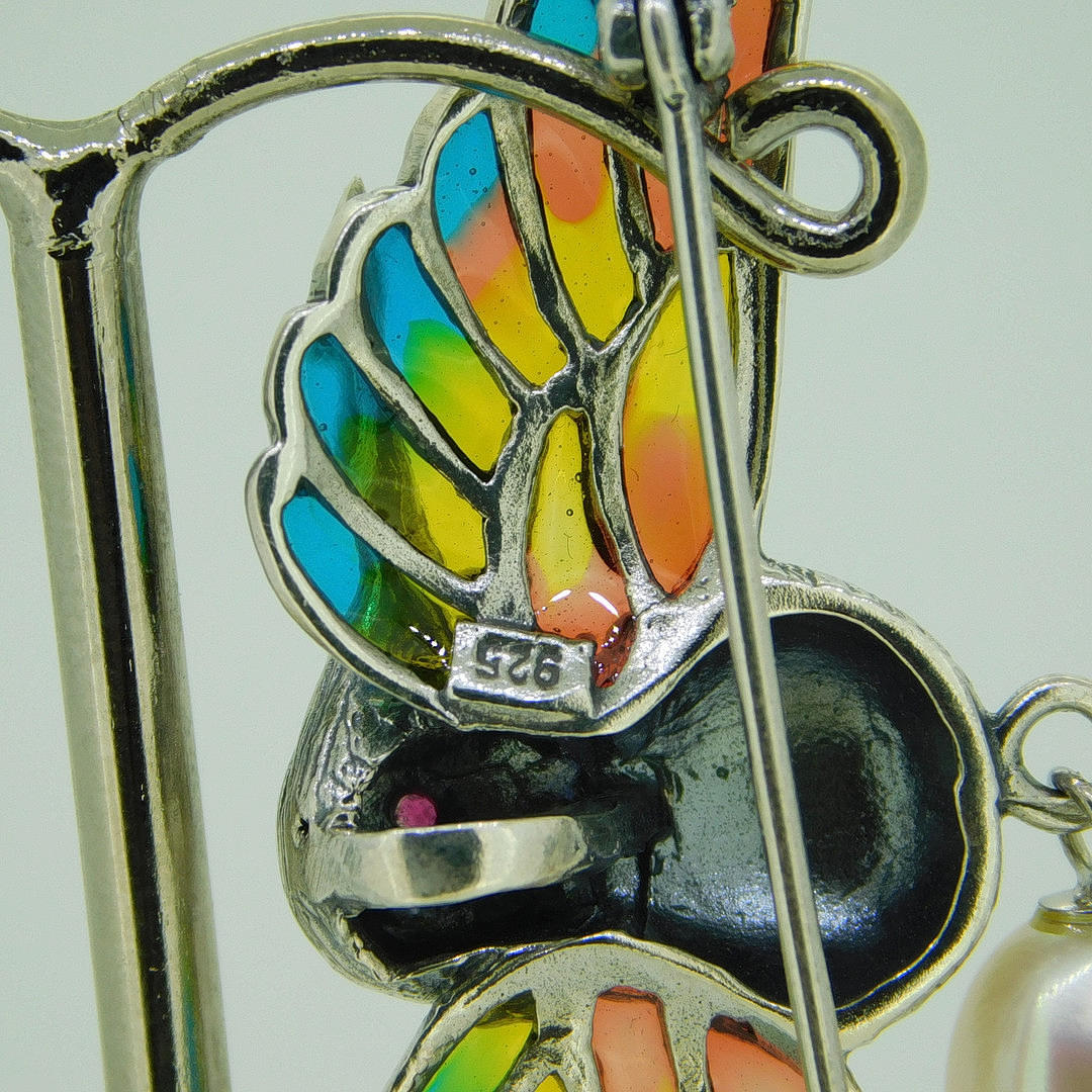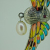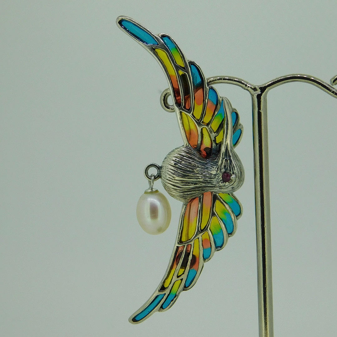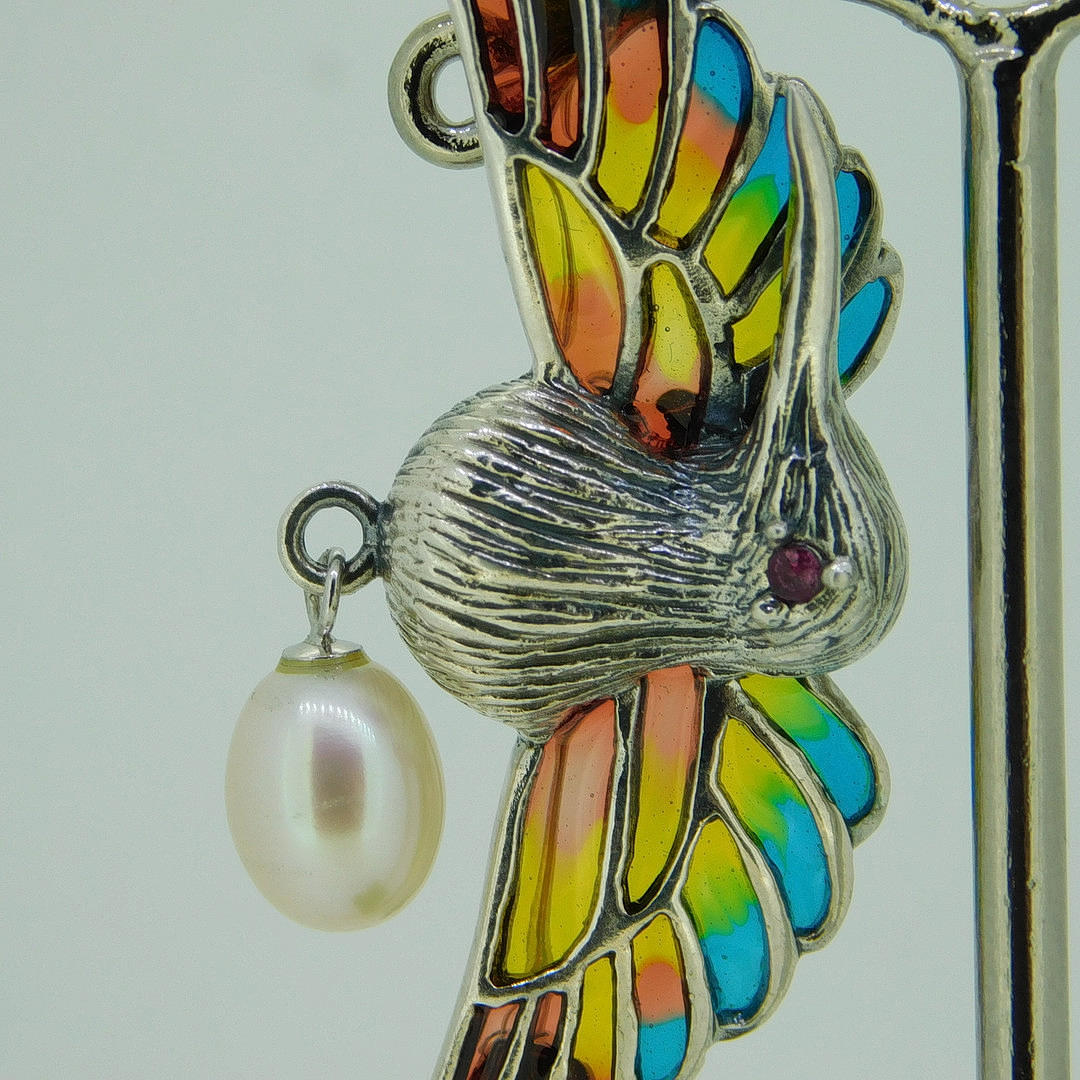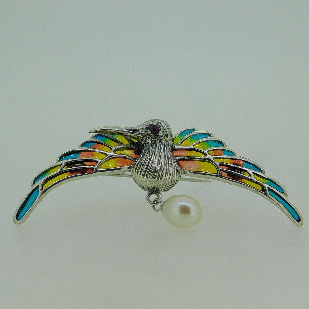 A suspended pearl is set underneath the hummingbird. The wings are inlaid with coloured enamel and the bird has a round-cut ruby eye.