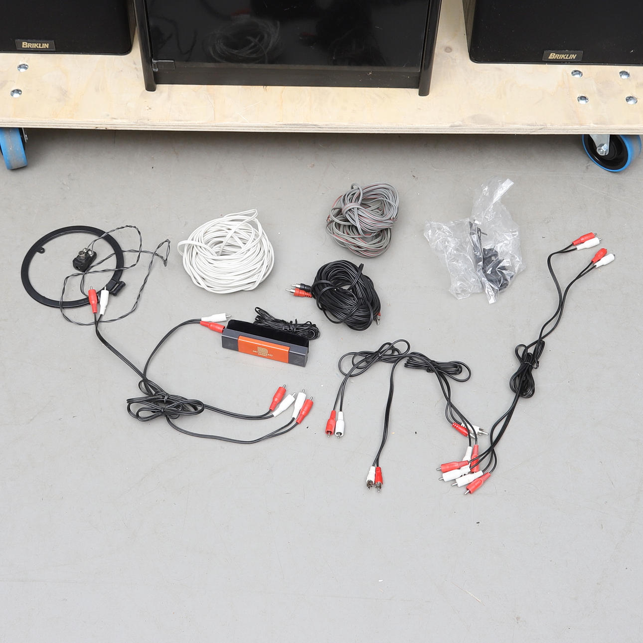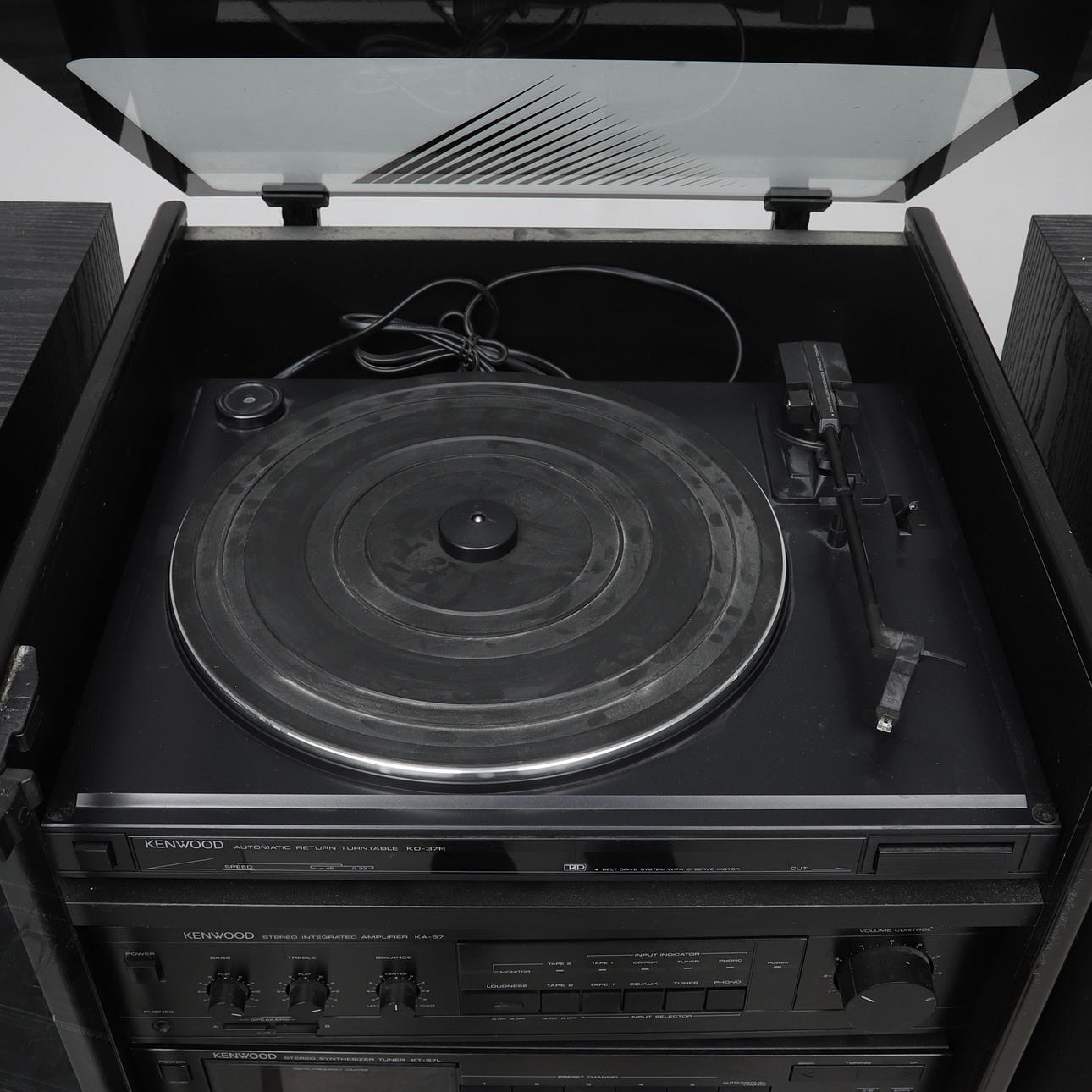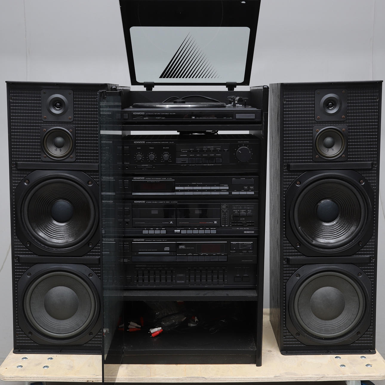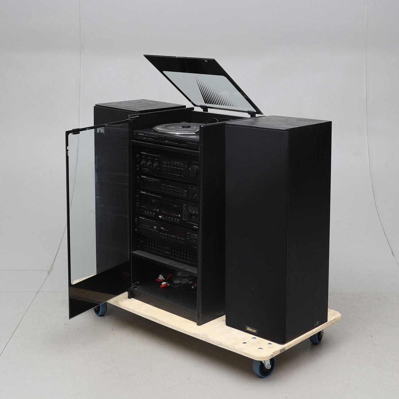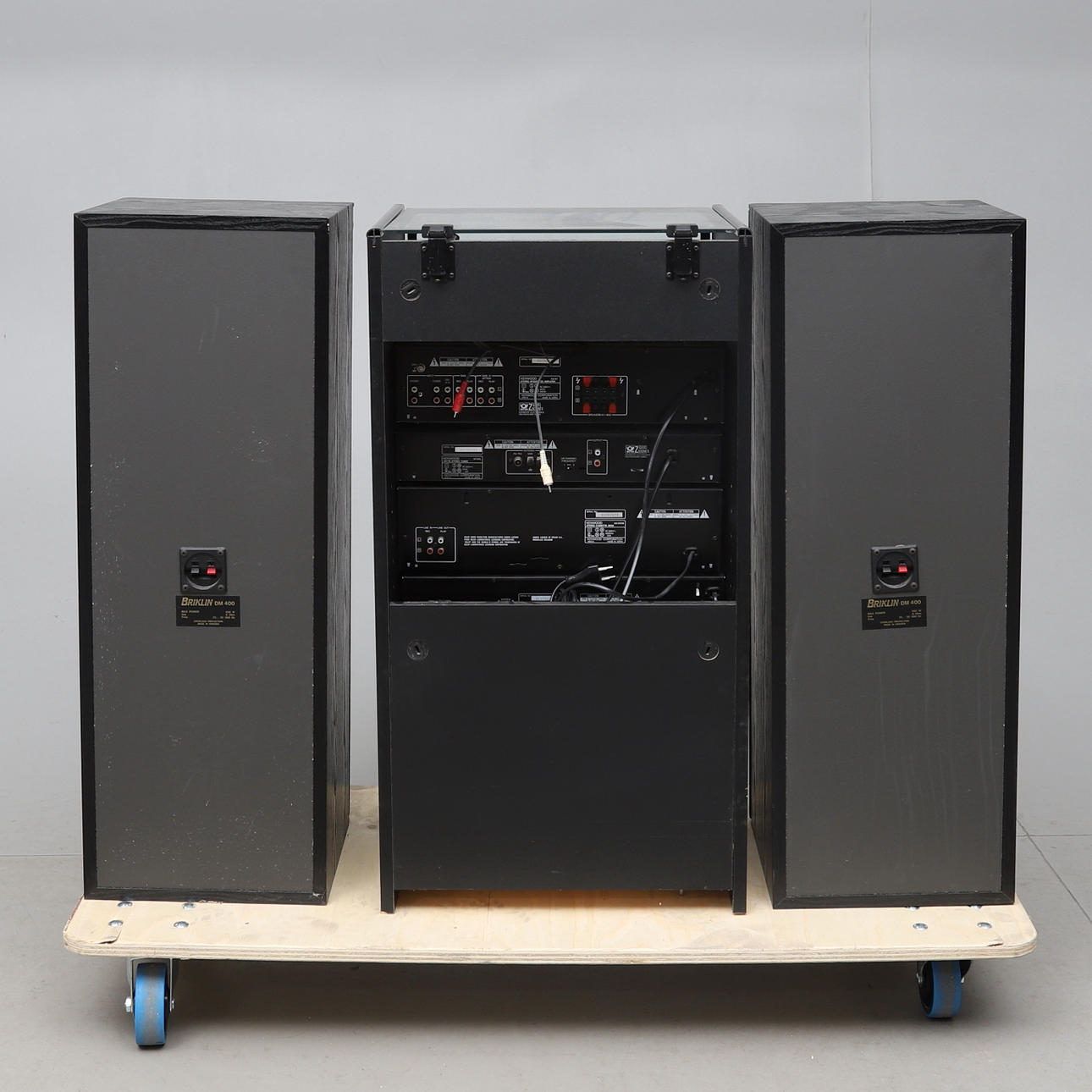 Record player, CD player, tape player, amplifier, graphic equalizer and tuner. Two speakers and cabinets from Briklin. Cabinet height approx. 87 cm.