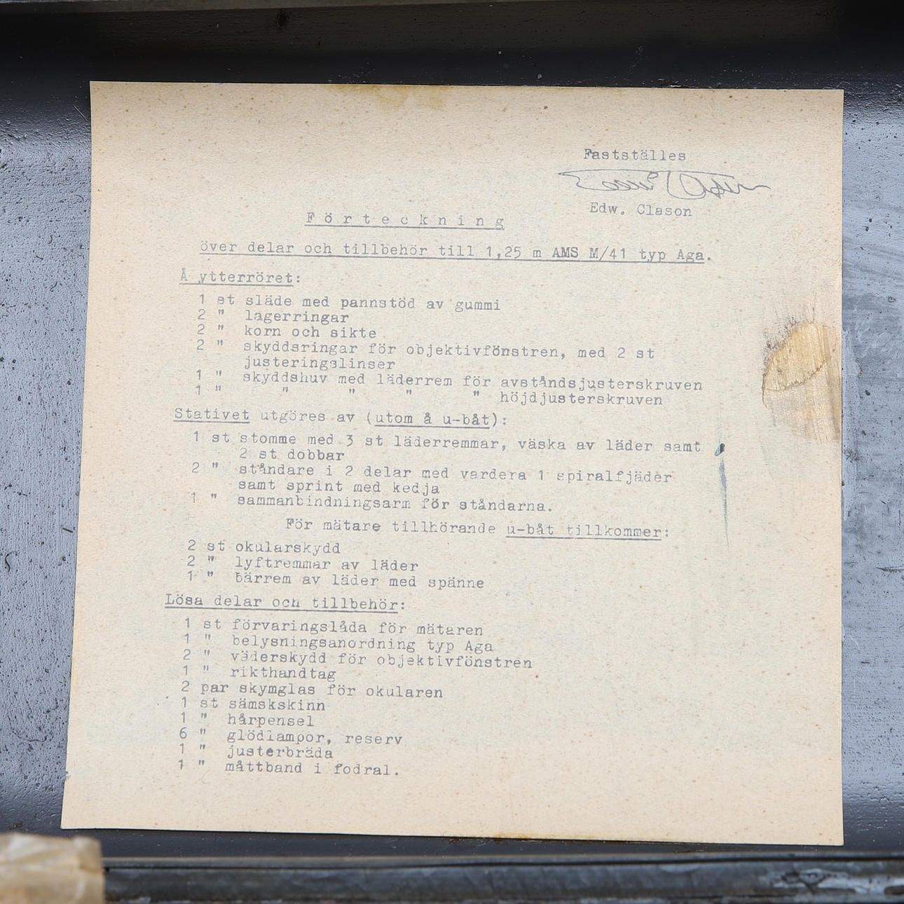 Signed "AGA-Baltic Lidingö Adjustment distance 17 m", as well as "1.25m. AMS w/41 F= 11.8x No. 282".