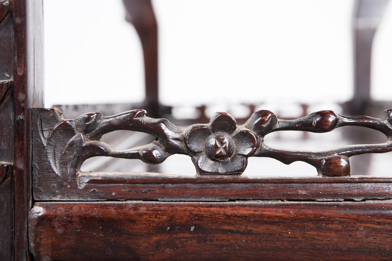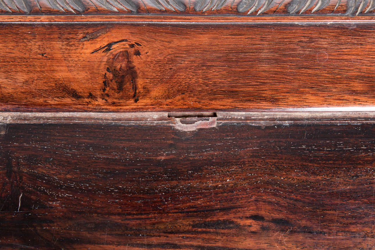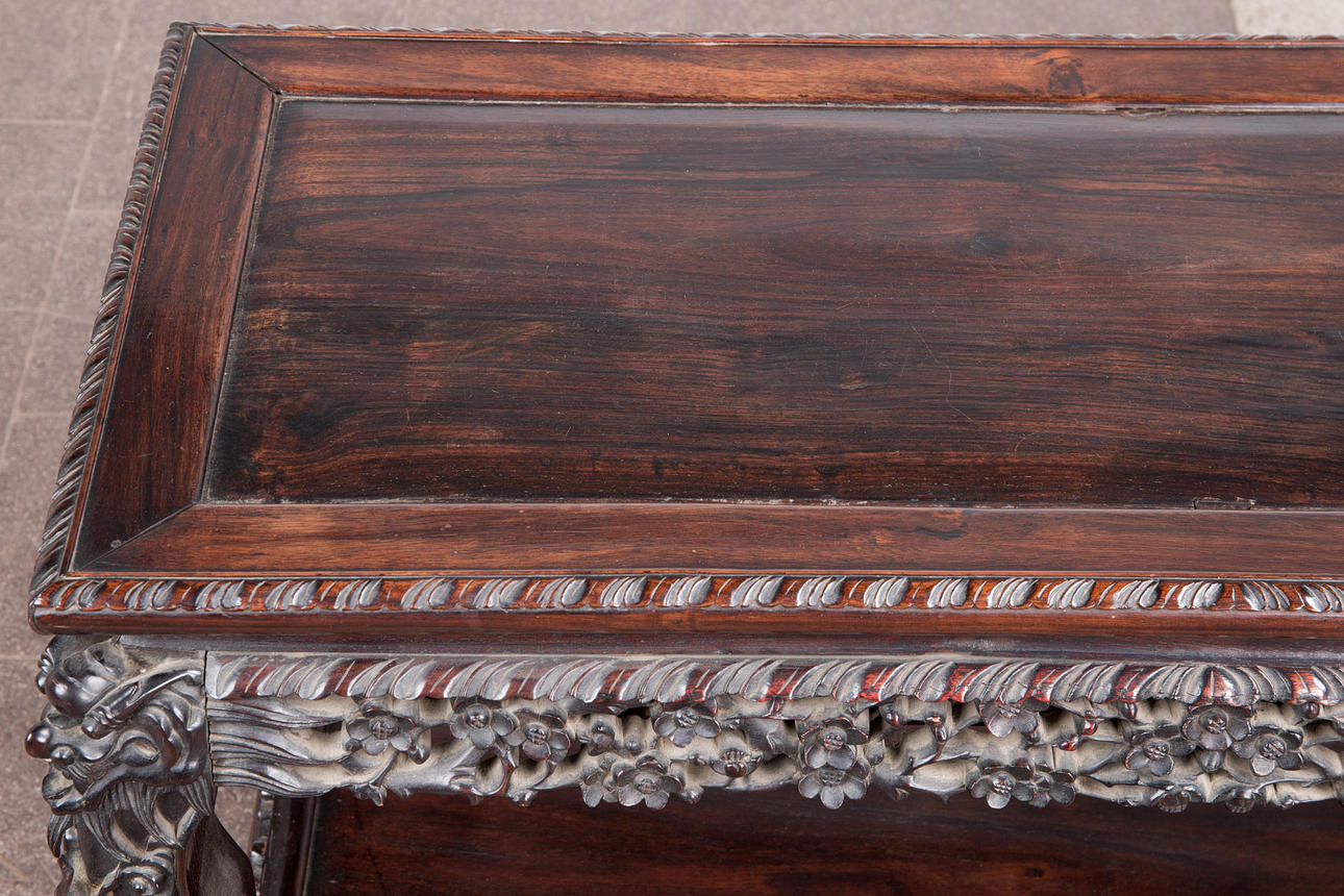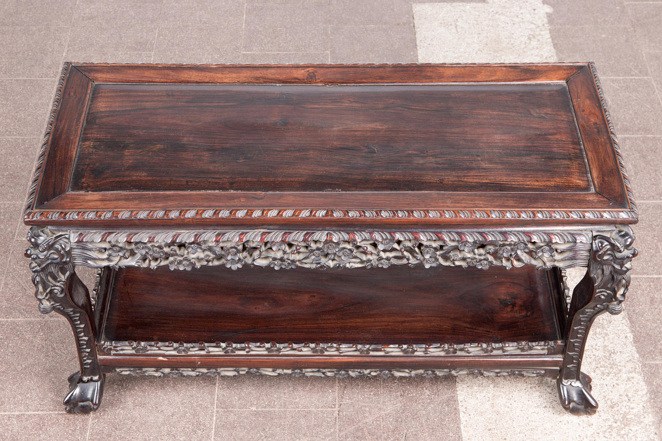 Table / coffee table, Macassar ebony, China, around 1920. Macassar ebony coffee table with a loosely attached rectangular top and paw feet decorated with ornamental and floral carvings, H.56cm, L.106cm, W.45cm.