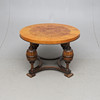 Veneered with elm, elm root and birch. Cut and turned decor. Coupled leg position. Diameter approx. 90. Height 62 cm.