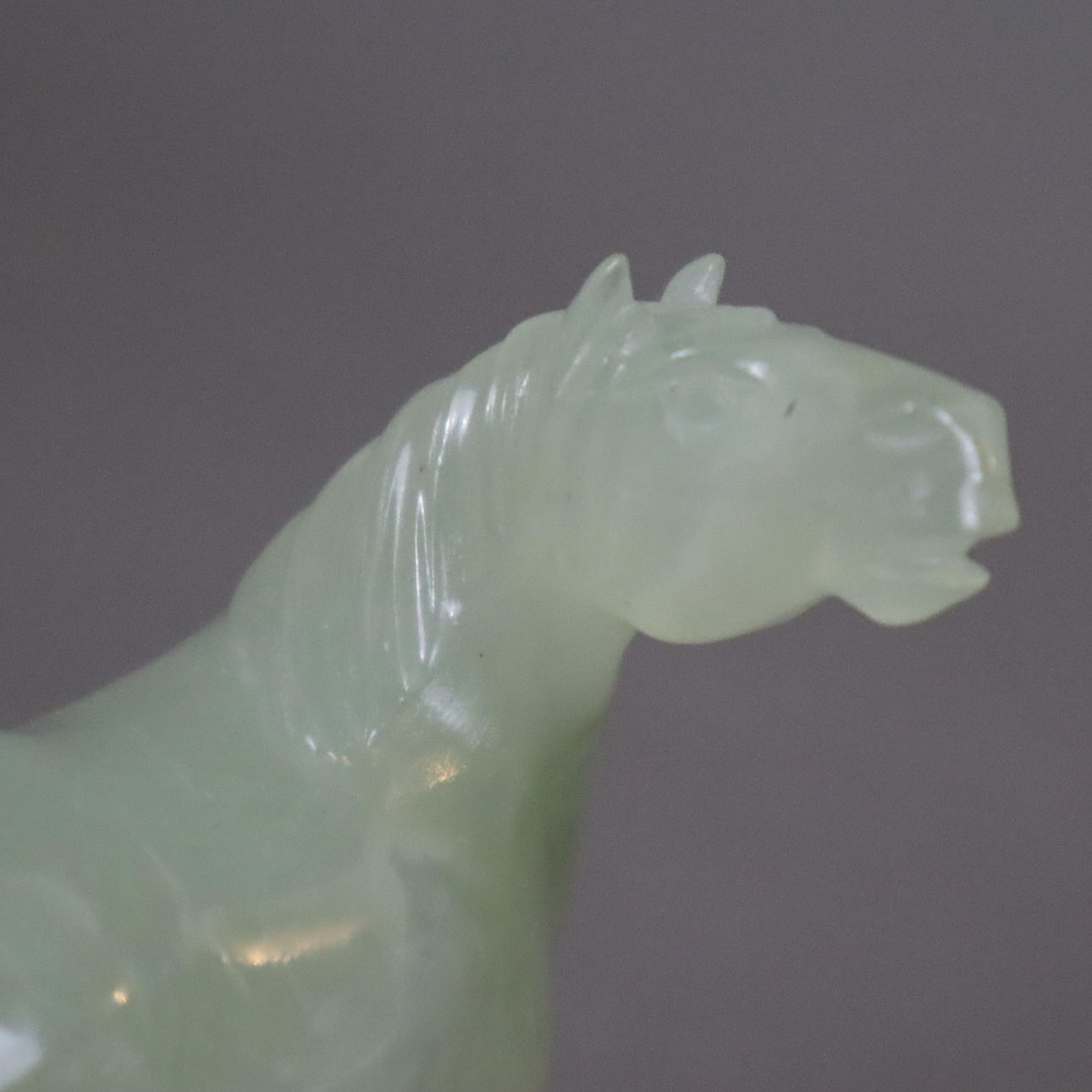 probably the eight horses of Wang Mu, small horses carved in the round in different postures, celadon green jade of different quality, some with anthracite-coloured inclusions, each on a separate, partly pierced lacquer base, H. without base approx. 5-7.5 cm.