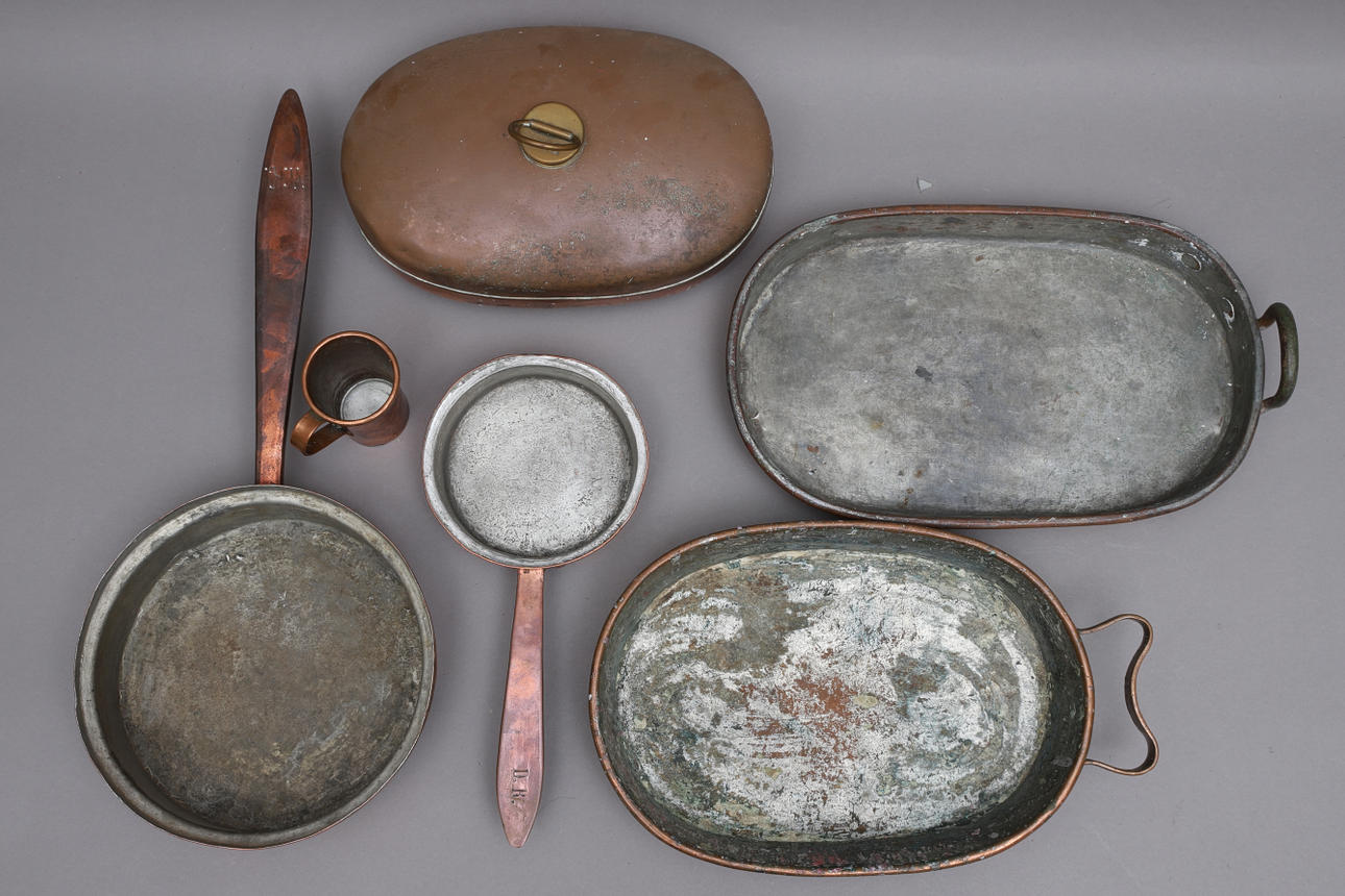 1877558. COPPER OBJECTS, 6 parts, i.a. bed warmer.