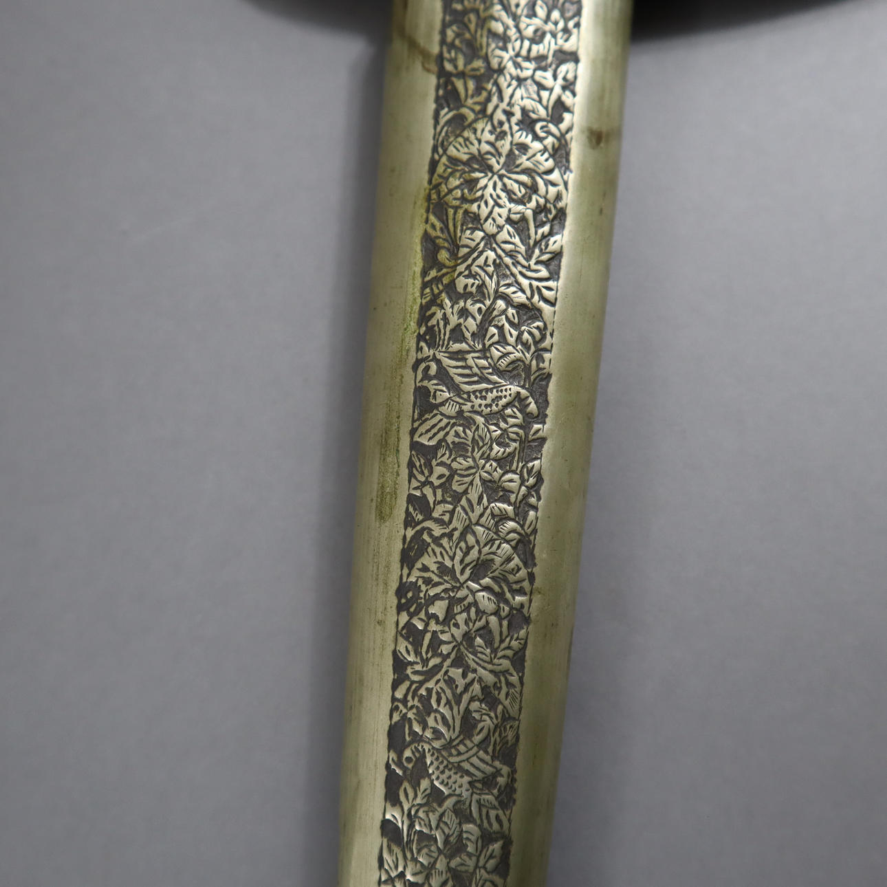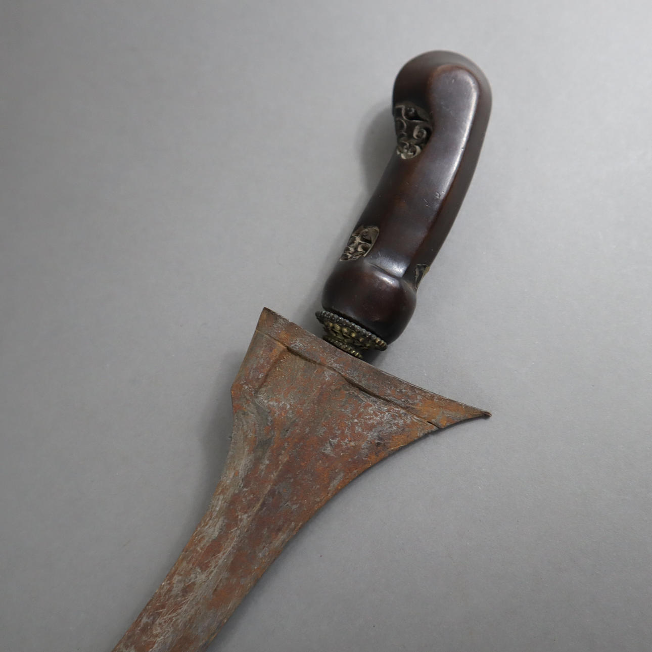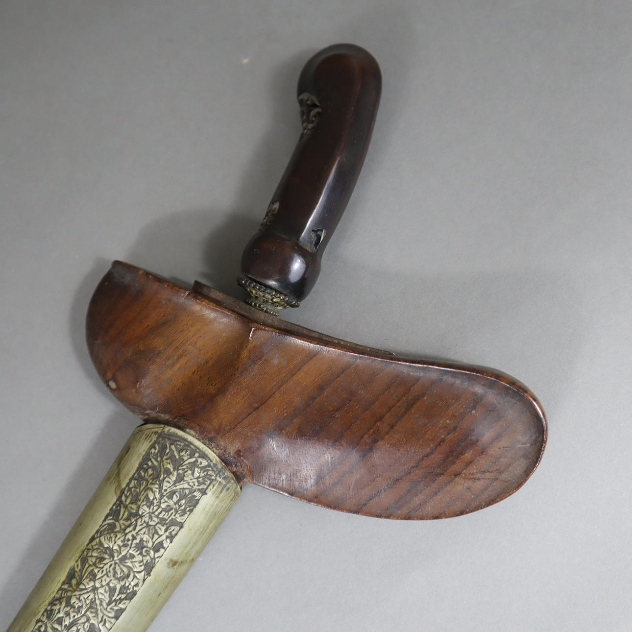 Straight blade/Dapur Bener made of steel with pamor, ornamentally carved wooden handle, Warangka made of wood of the Gayaman type, wooden sheath set in sheet metal with floral relief decoration (pendok), Kris length approx. 43.5 (blade up to approx. 36cm) , total length with sheath ca.47cm.