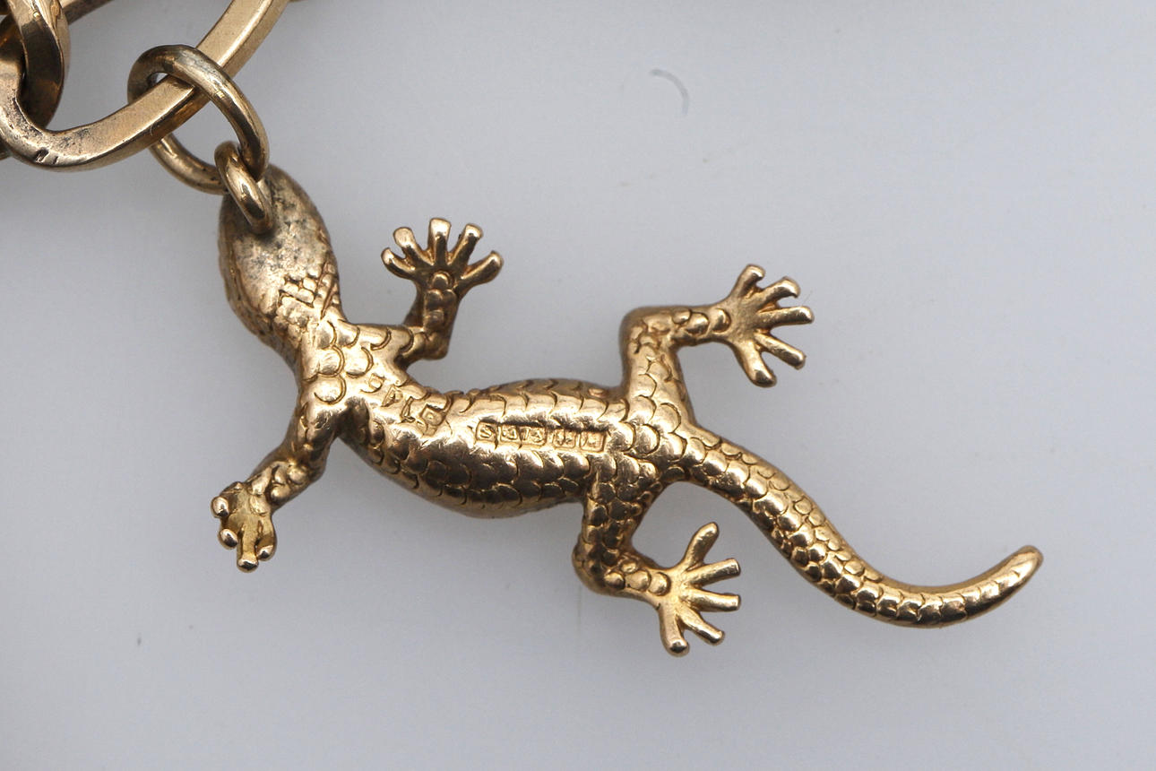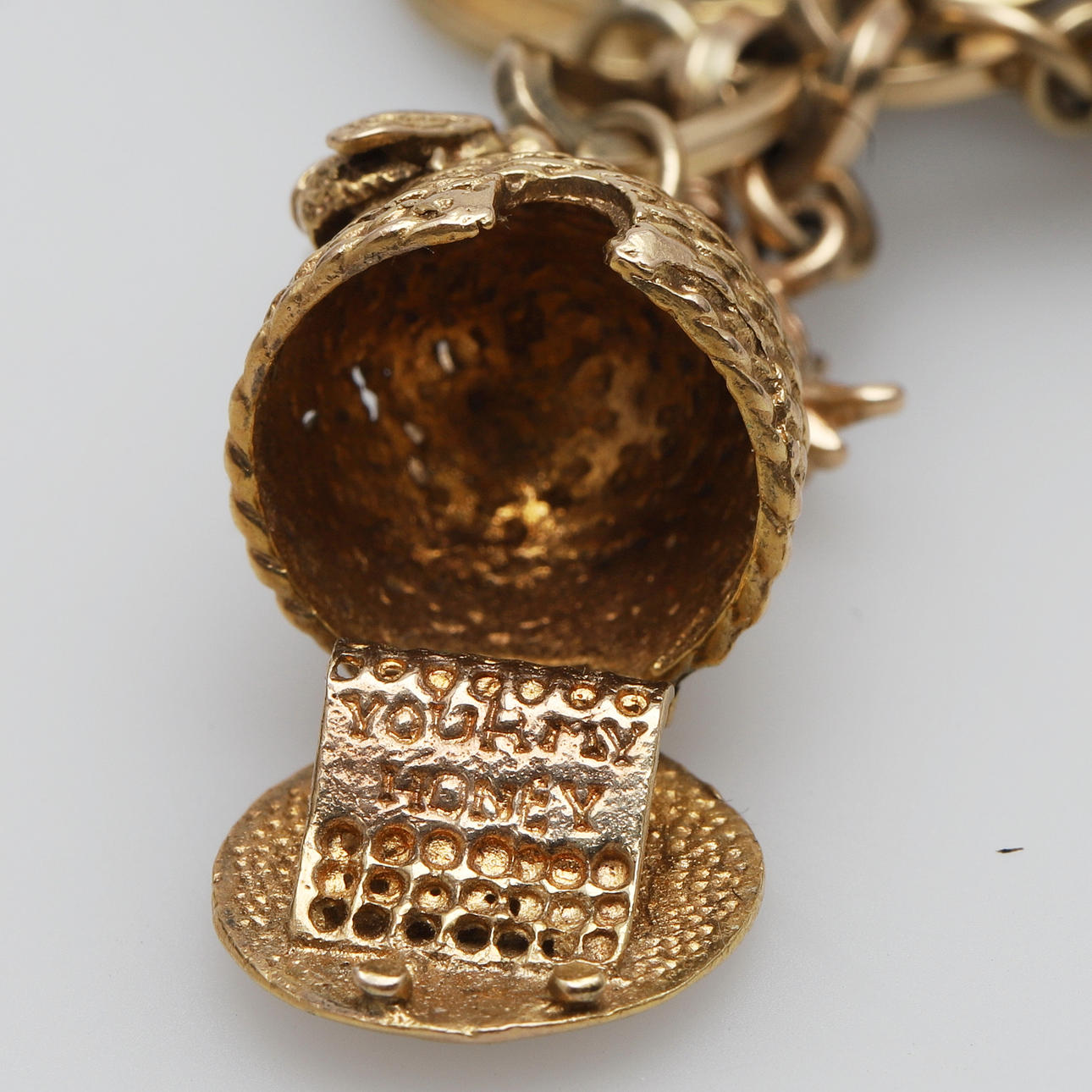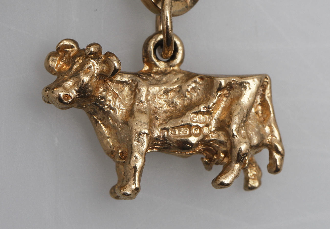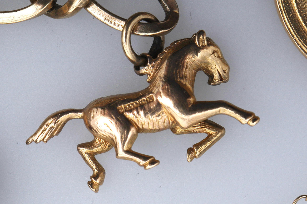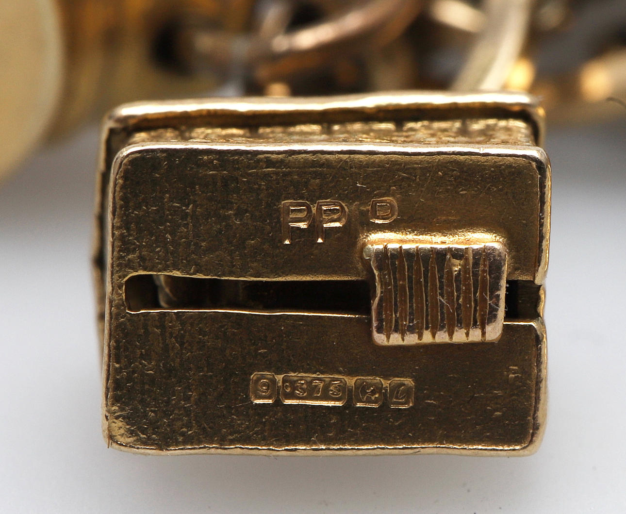 the 9 carat twisted open curb link bracelet with bolt ring clasp, hung a variety of various hallmarked nine carat and charms,