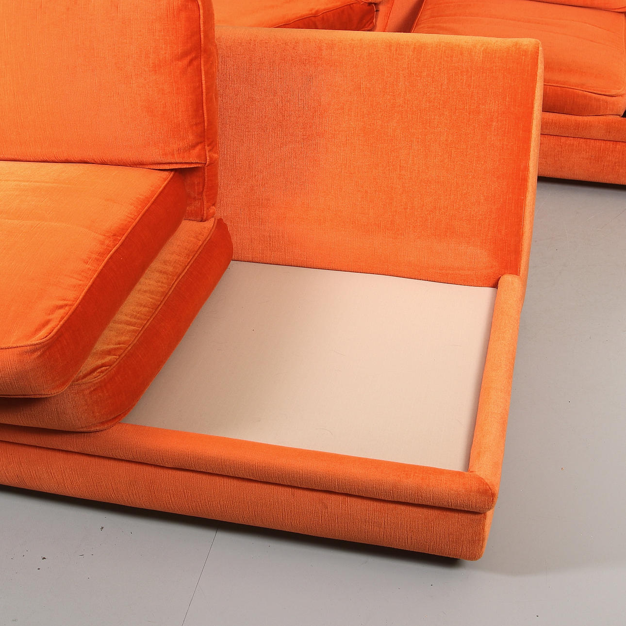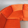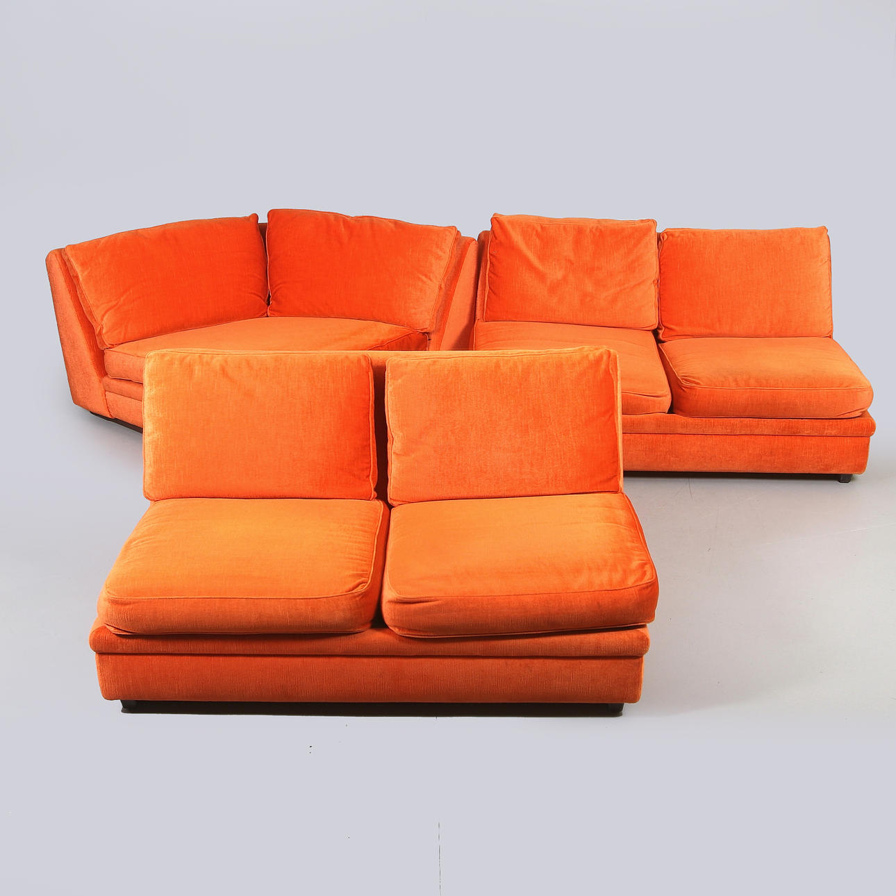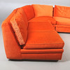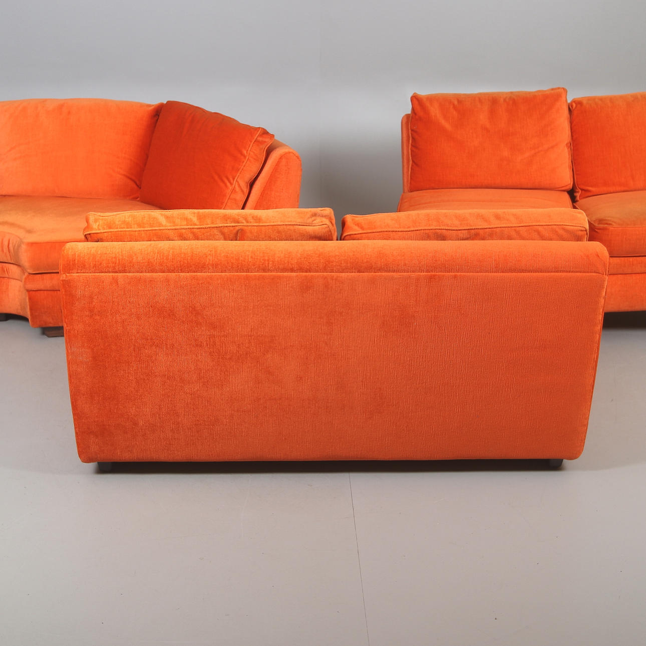 2 length sections and 1 corner section, covered in orange plush, seat height approx. 36 cm, seat sections 2 seat length approx. 130 cm each, corner section length approx. 150 cm.
