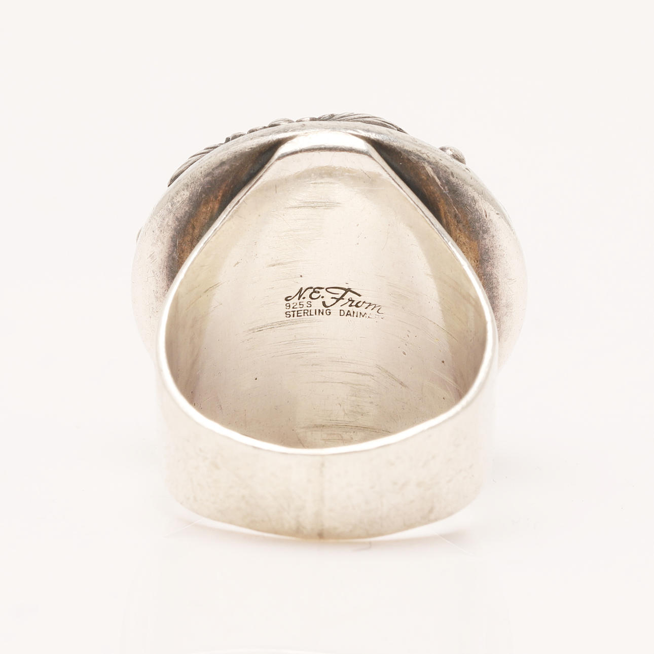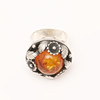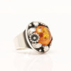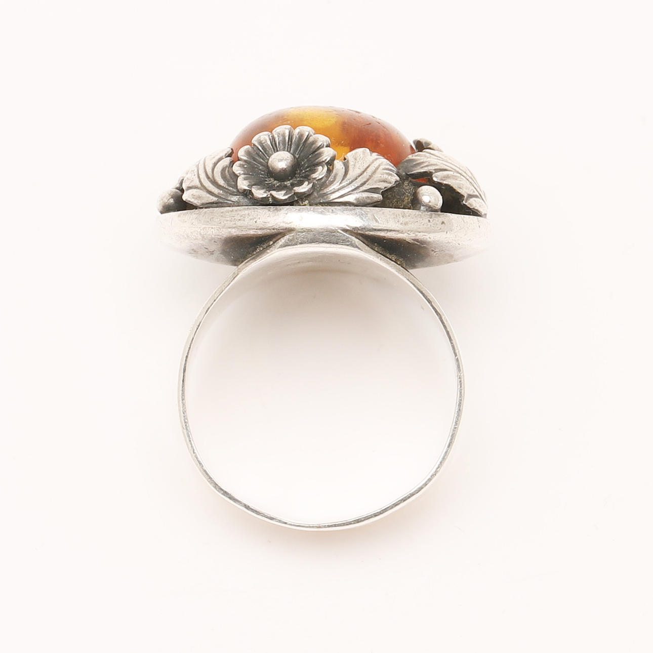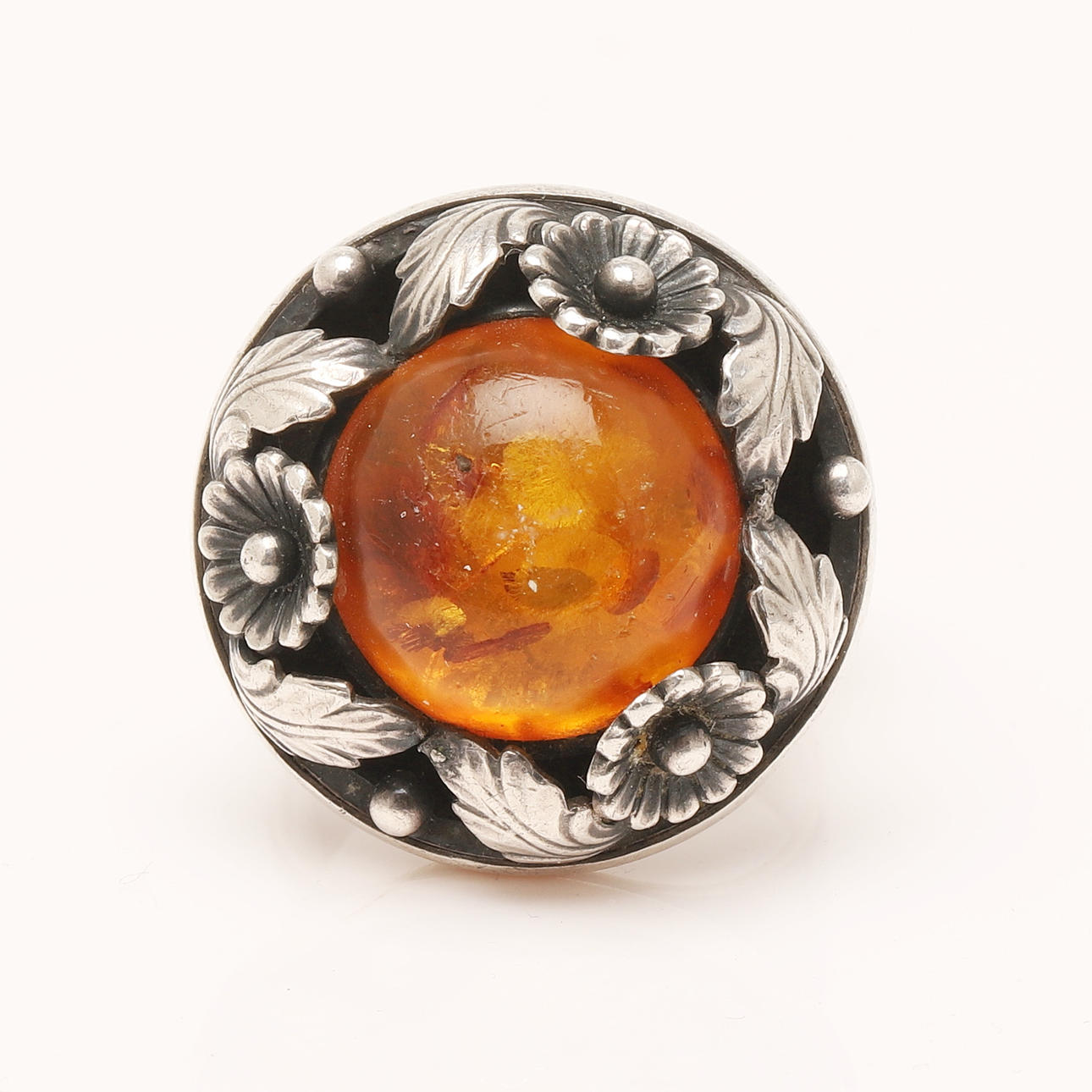 Niels Erik From, ring made of 925 silver, ring head decorated with flowers and leaves and set with an amber cabochon, ring size: approx. 60, B.24.5mm, stamped, weight: 13.60g.