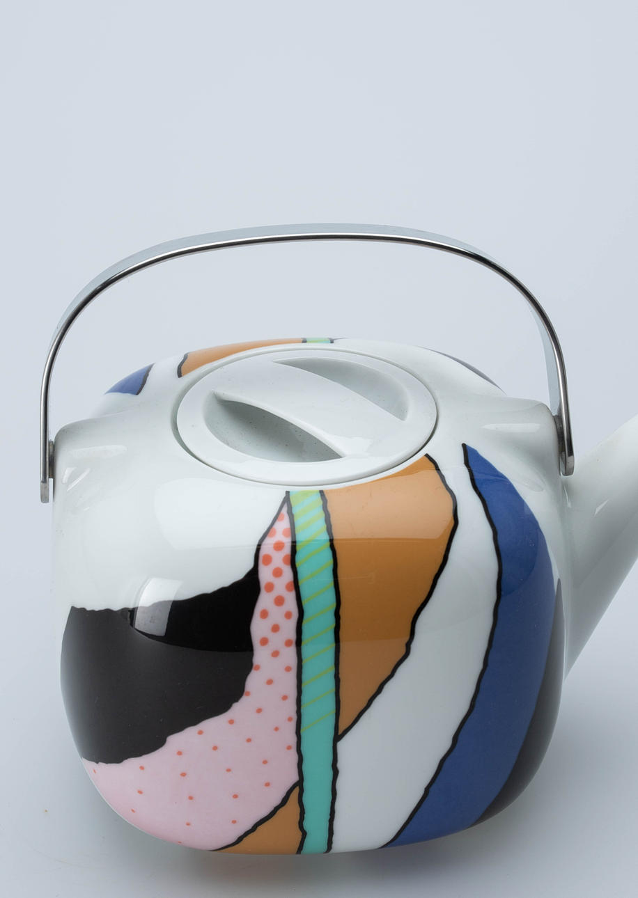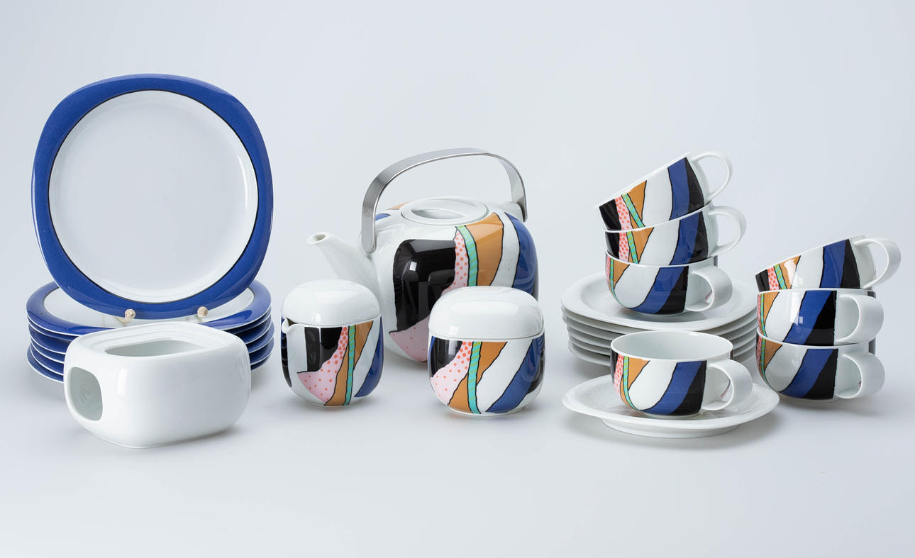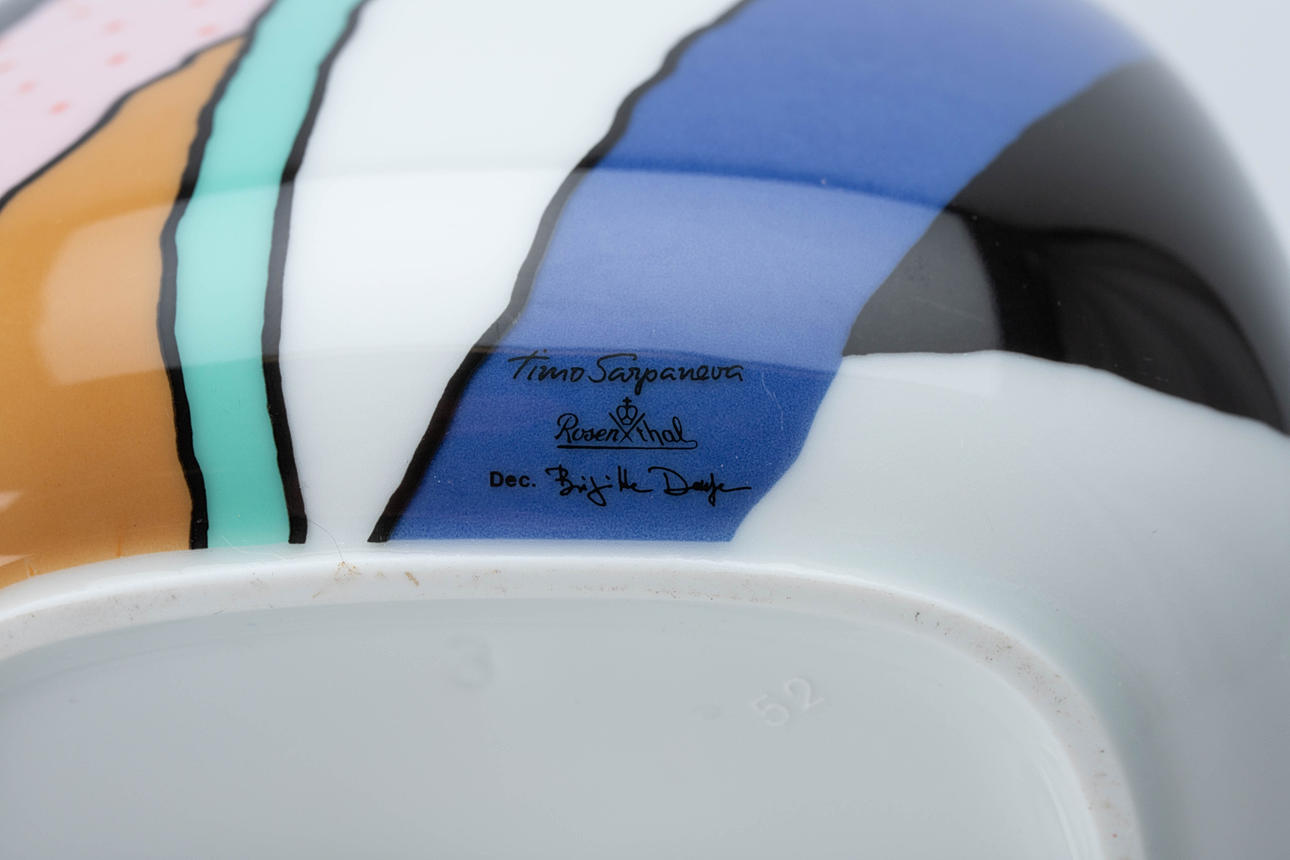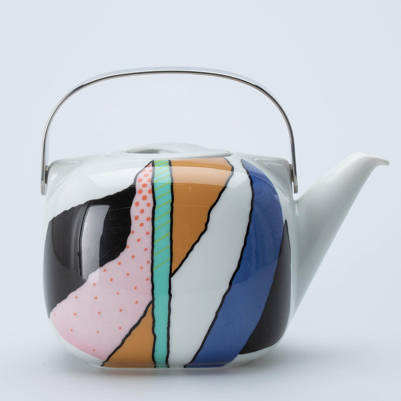 White porcelain with geometric, colored decor. Design by Timo Sarpaneva (1926 - 2006) for Rosenthal around 1976. Various underglaze green company stamps. 25 pieces, consisting of 1 small Teapot, 1 cream jug with lid, 1 sugar bowl with lid, 7 teacups and 7 saucers, 7 cake plates and 1 rechaud.