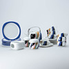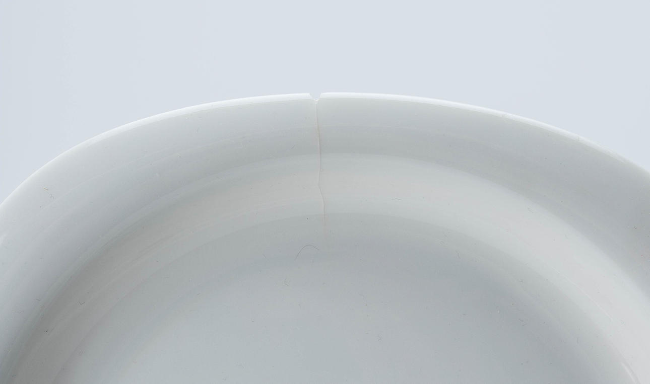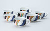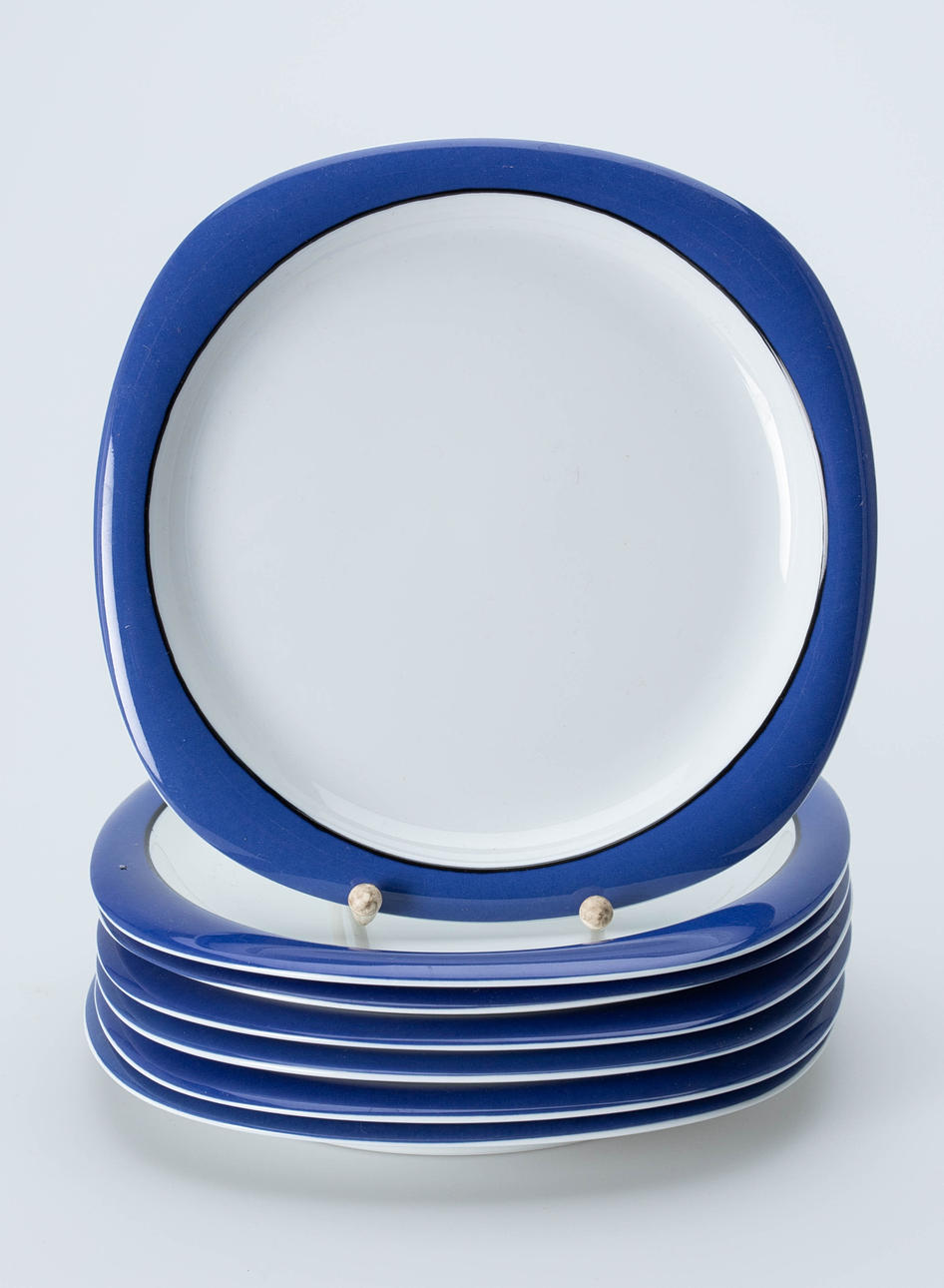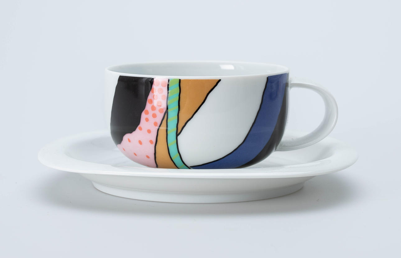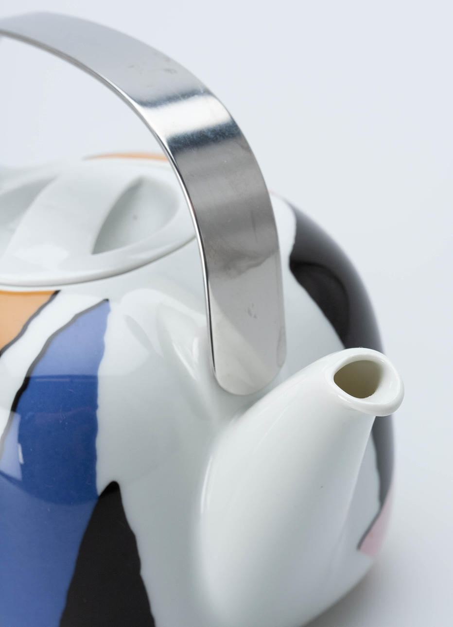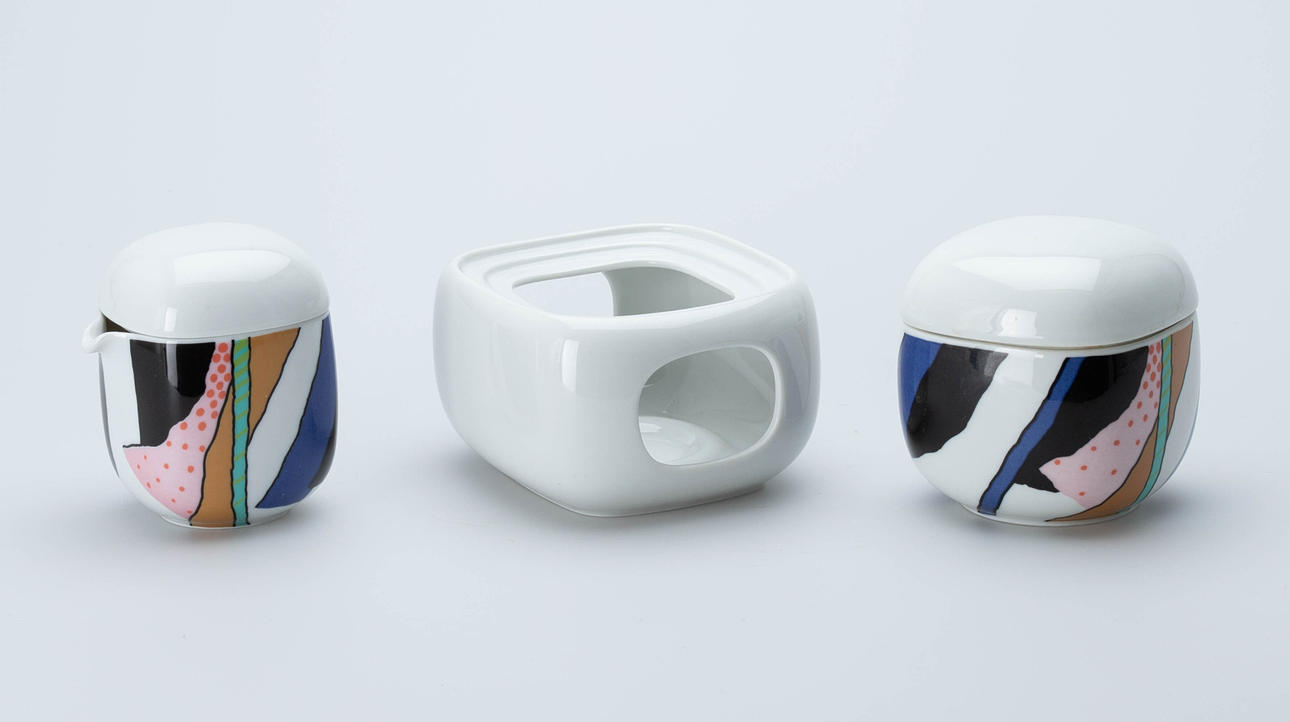 White porcelain with geometric, colored decor. Design by Timo Sarpaneva (1926 - 2006) for Rosenthal around 1976. Various underglaze green company stamps. 25 pieces, consisting of 1 small Teapot, 1 cream jug with lid, 1 sugar bowl with lid, 7 teacups and 7 saucers, 7 cake plates and 1 rechaud.