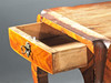 Table in two parts that was used in several different ways, dressing table, bedside table or as a table to carry out chores at, such as sewing and writing. The table has storage with a long lockable drawer in the lower part. On the upper part there are two fold-out side compartments, a fold-out support for reading, and on its back a smaller box. Veneered with walnut, Masur birch and jacaranda.