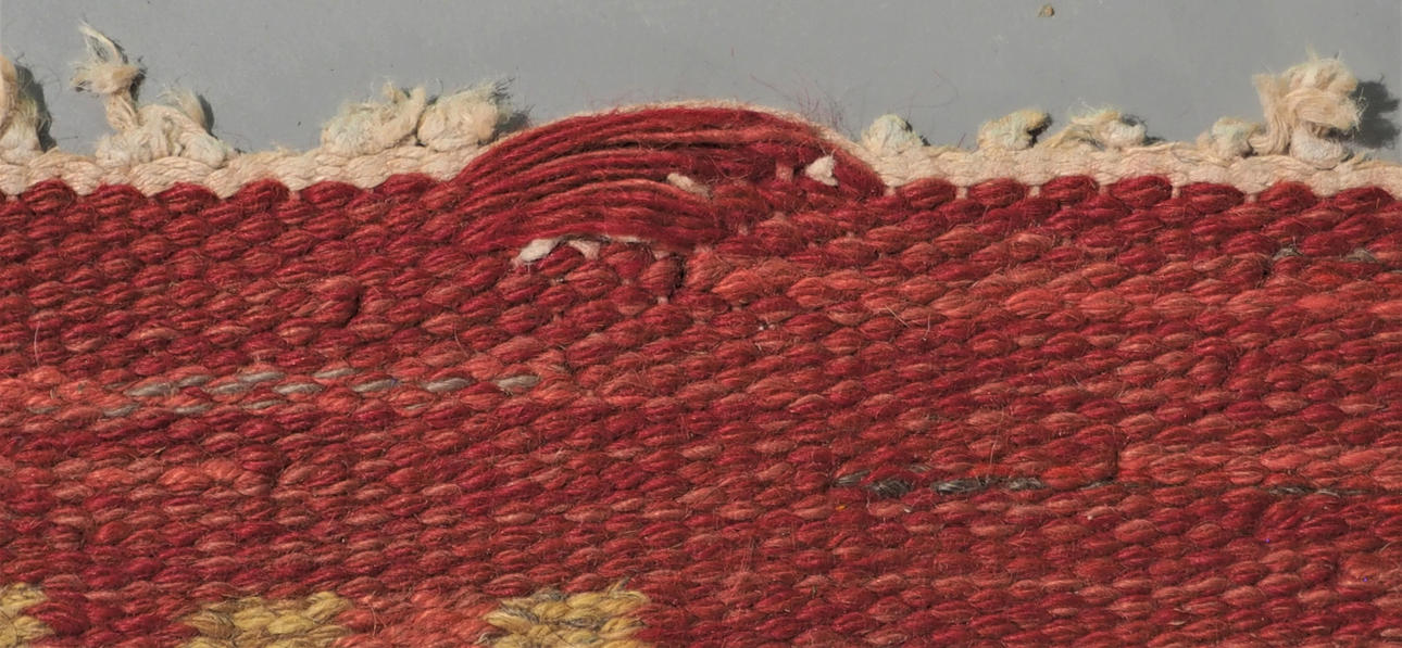 The overall impression is good, no visible damage or stains, apart from a damage to the French edge. Fringe largely gone. See picture.