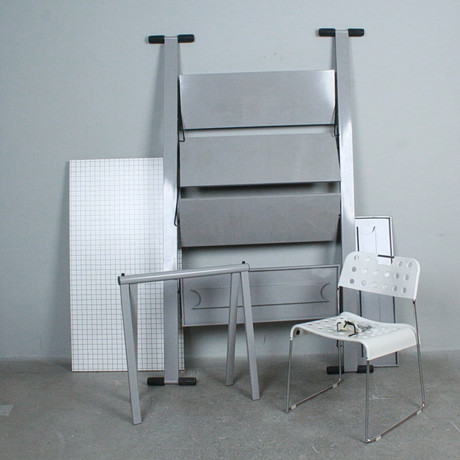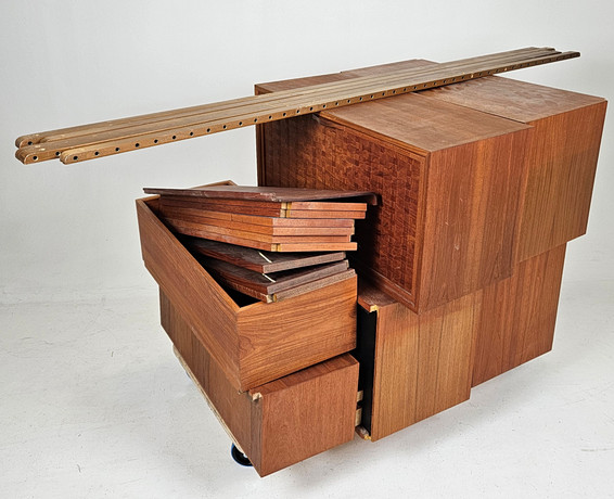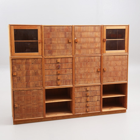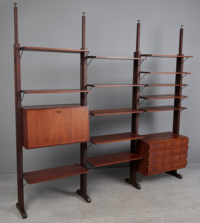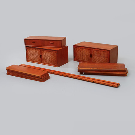 Designed 1955, Sweden. Teak veneered and black coated steel wire. 2 cupboards HxWxD: 42x78x30, 3 shelves 58x30cm, 3 shelves 58x20cm, 1 shelf 78x30cm, 2 newspaper racks. 2 keys available.
