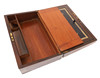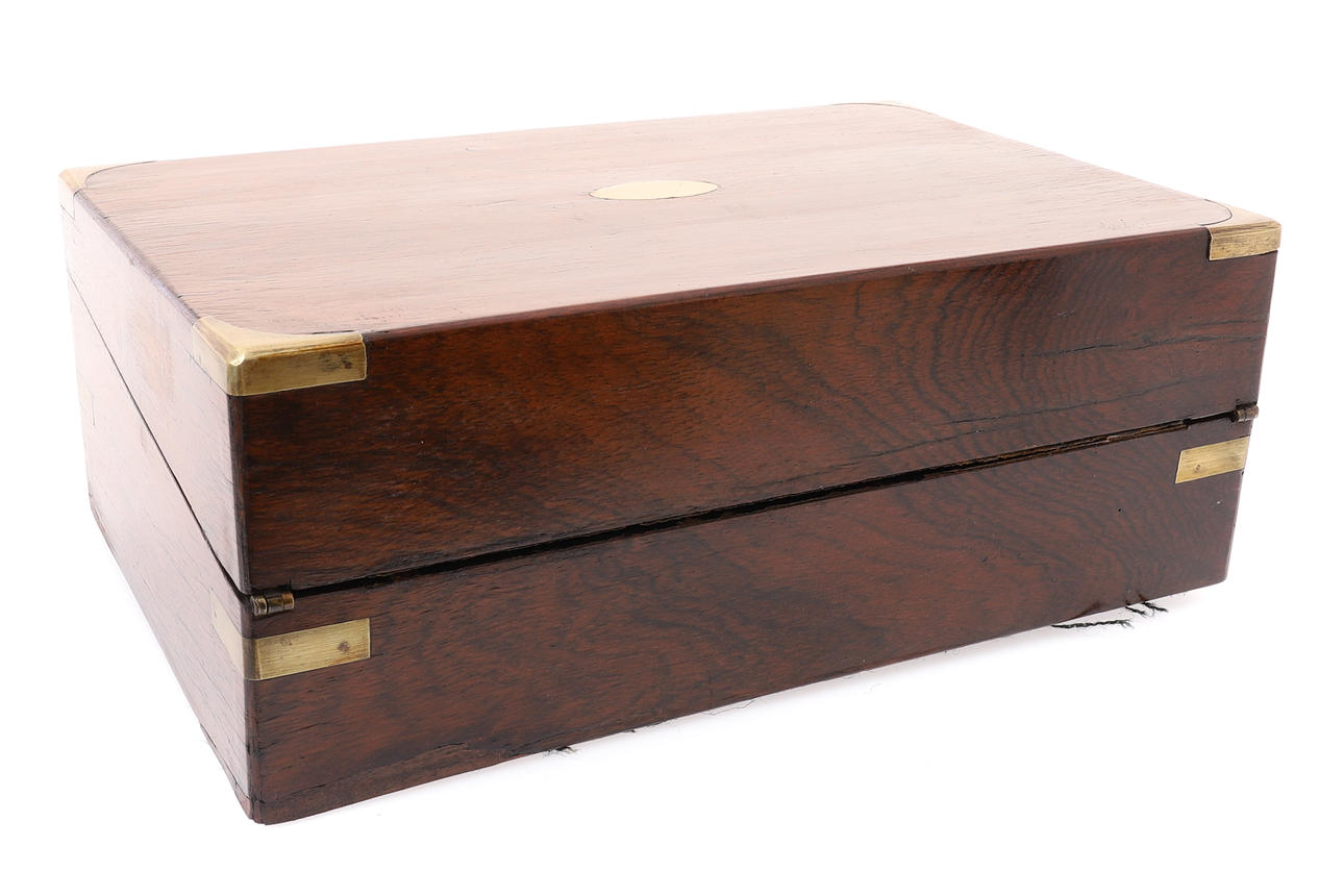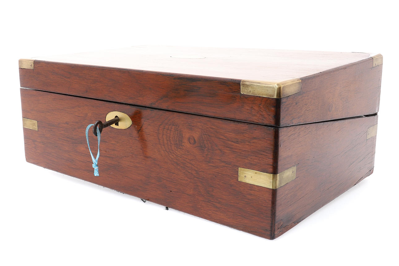 restored, with inset gilt tooled writing surface, 35cm wide x 22.5cm deep x 13cm high.