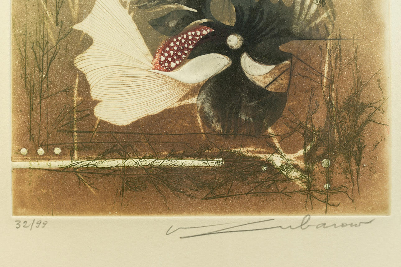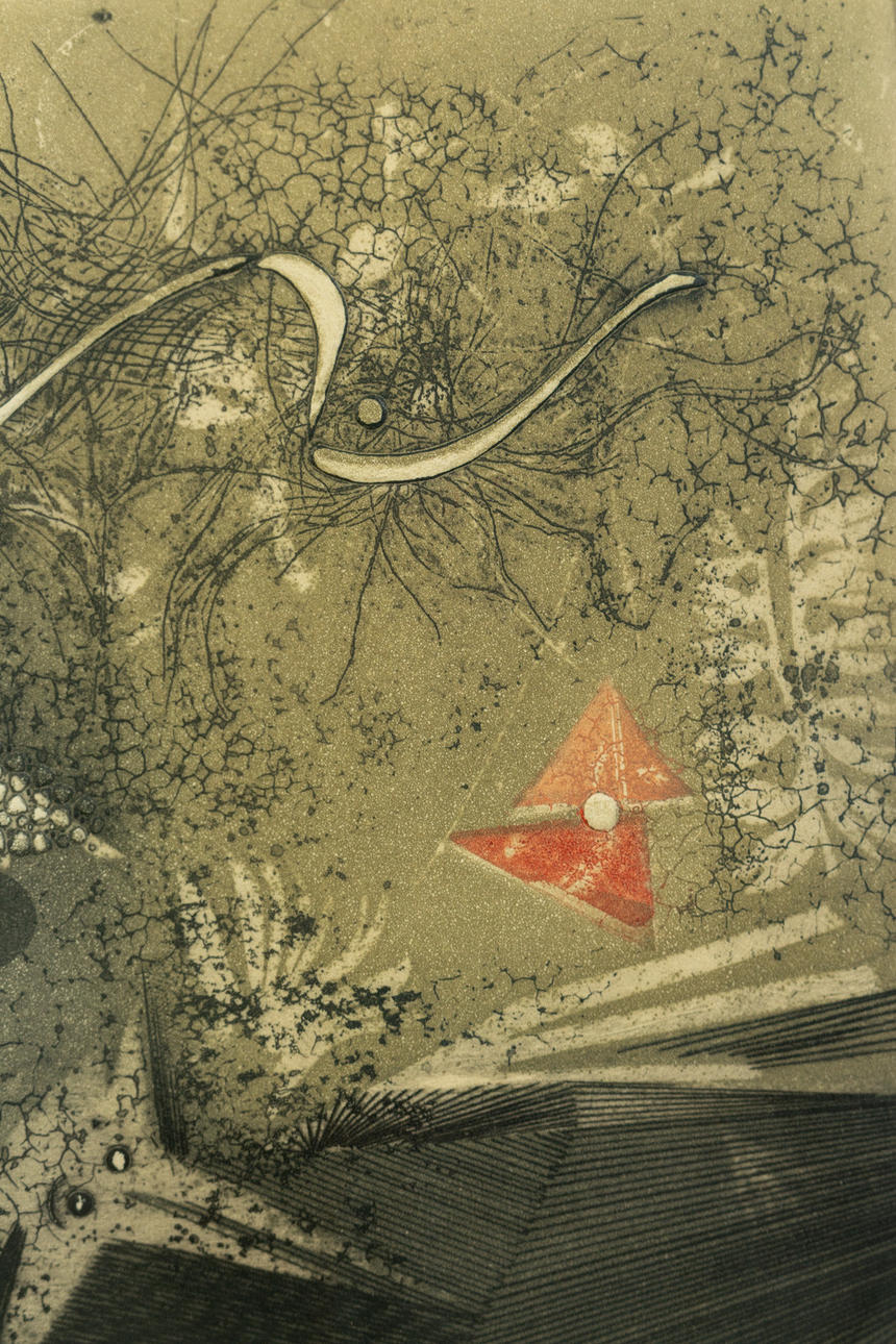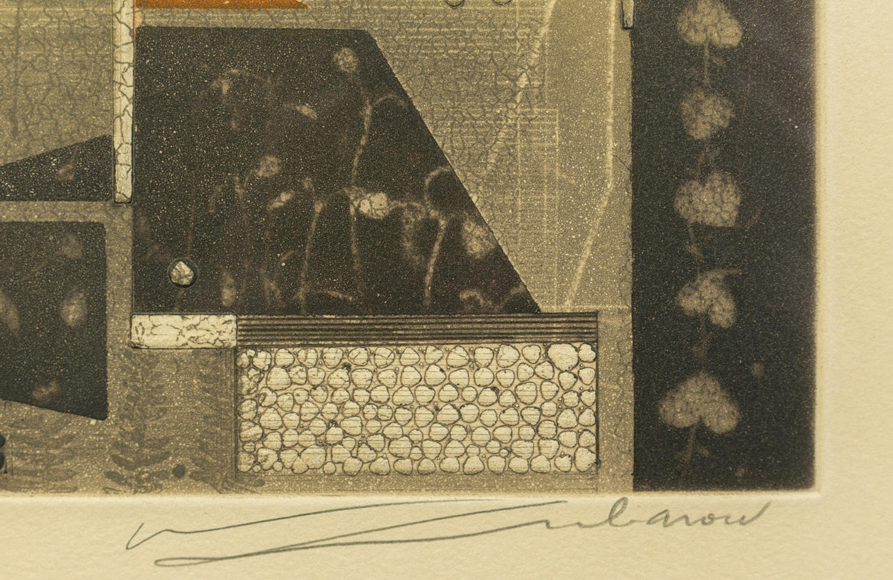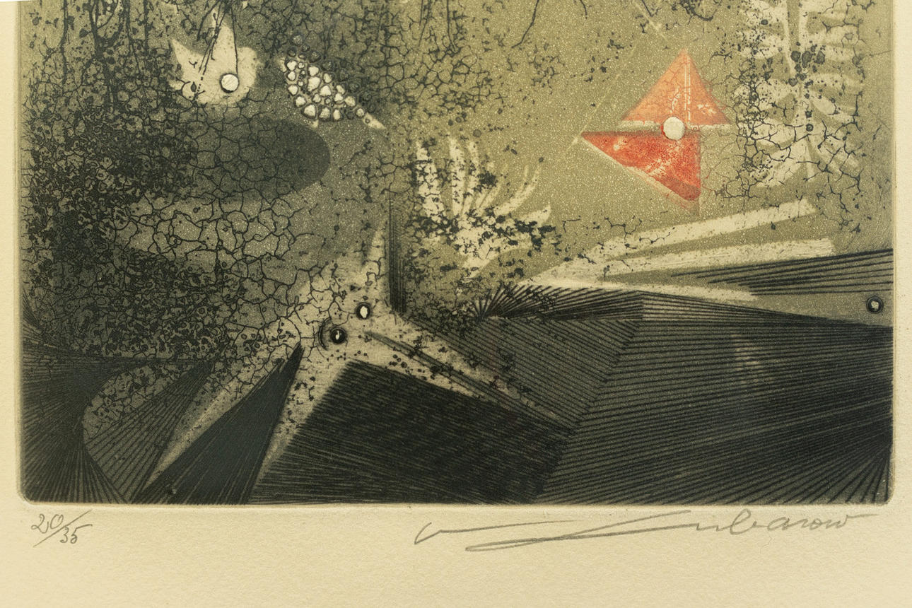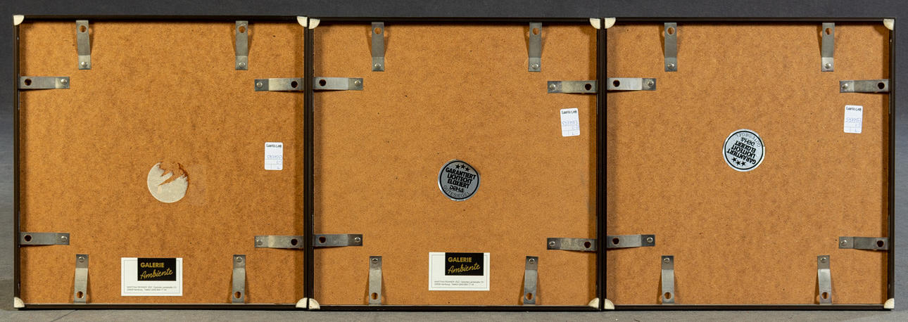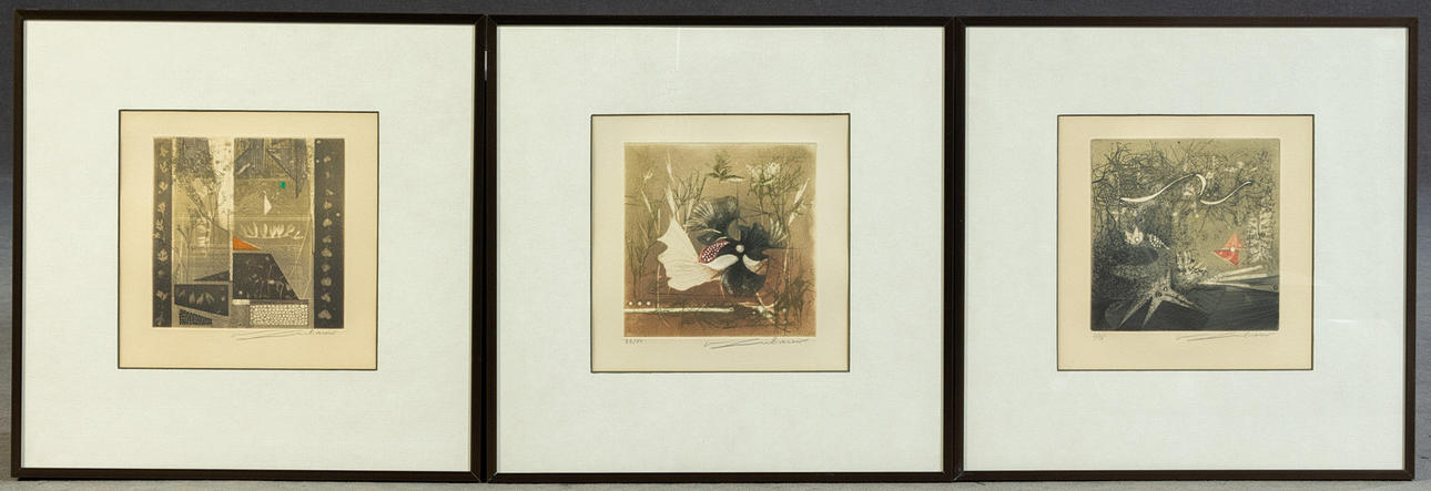 Renee Lubarov (b. 1923), various compositions, aquatint etchings, 1970s, all signed, two sheets additionally numbered, one each from 35 and 99 copies, each approx. 17 x 17 cm, all framed behind passe-partout and glass, each with frame approx. 41x41cm. (3).