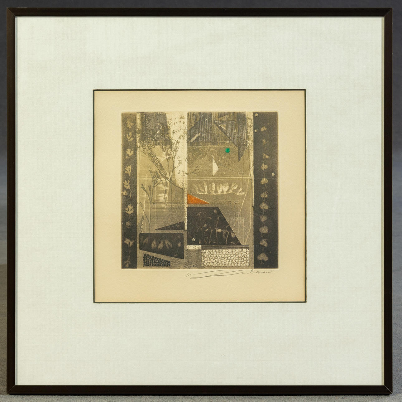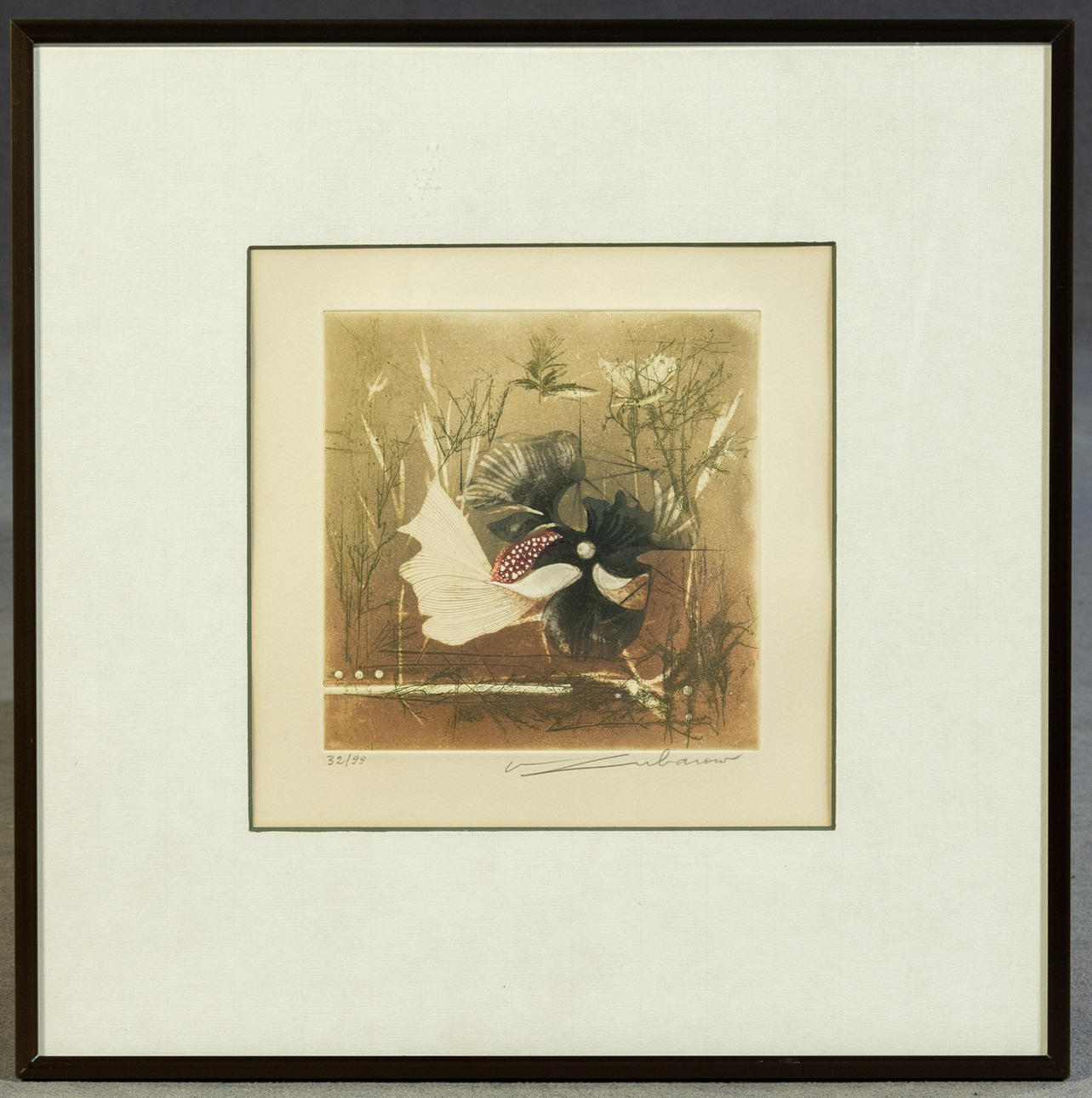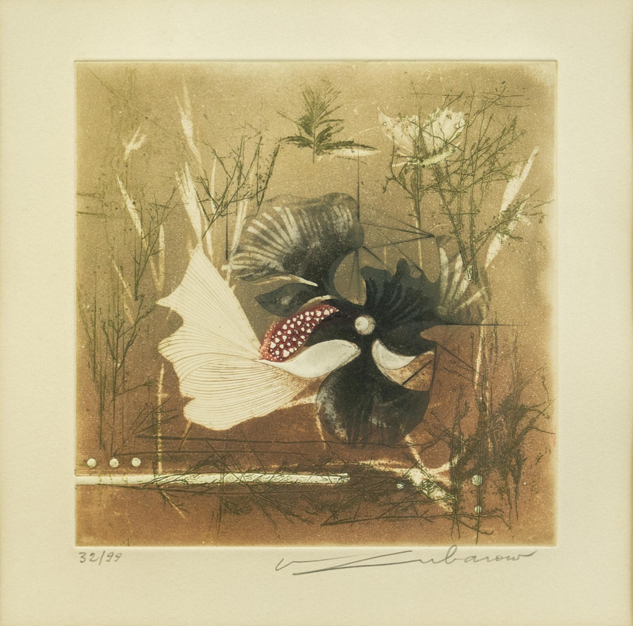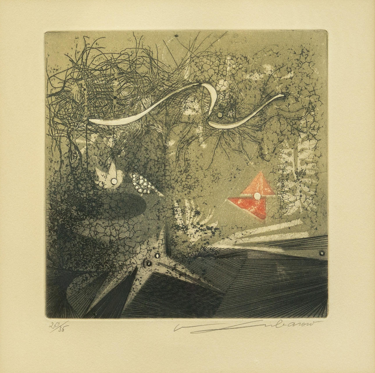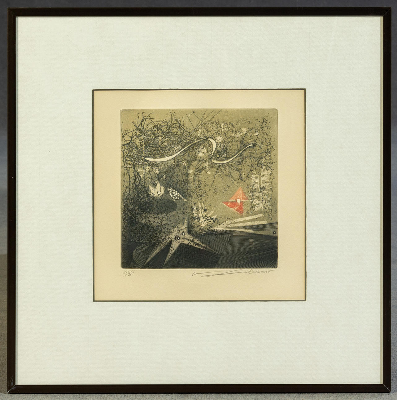 Renee Lubarov (b. 1923), various compositions, aquatint etchings, 1970s, all signed, two sheets additionally numbered, one each from 35 and 99 copies, each approx. 17 x 17 cm, all framed behind passe-partout and glass, each with frame approx. 41x41cm. (3).