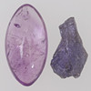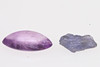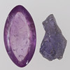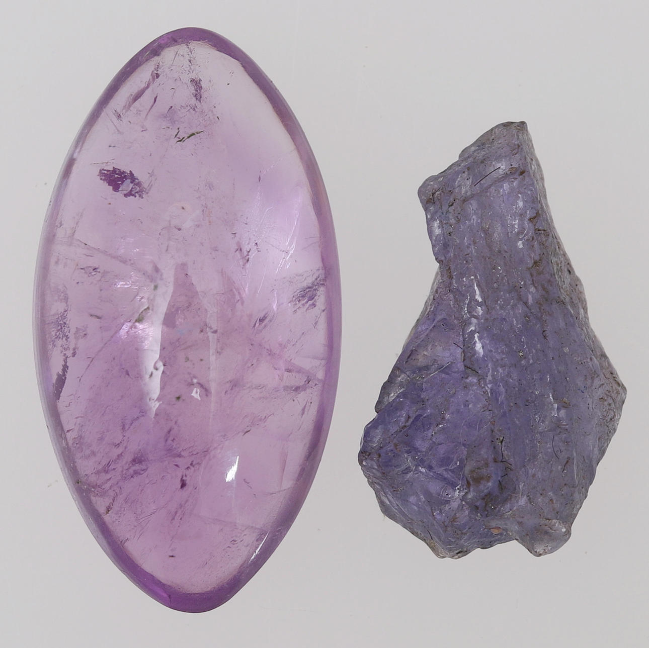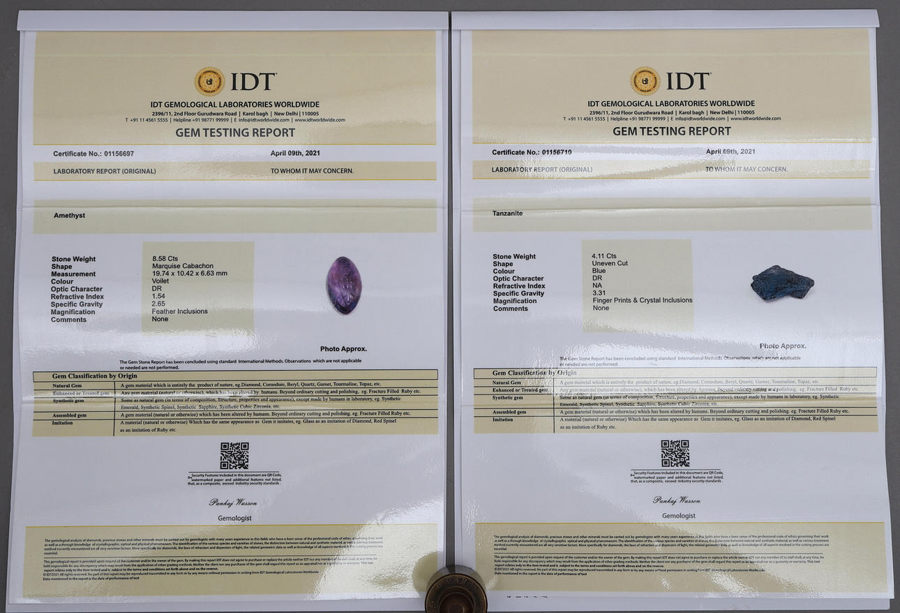 Tanzanite, raw, 4.11 ct, IDT, certificate number 01156710. Amethyst, marquise cabochon, 8.58 ct, IDT, certificate number 01156697.