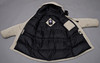 Stains from ink on the inside of a front pocket, red stain on one arm, Normal wear and tear, threads sticking out are present.