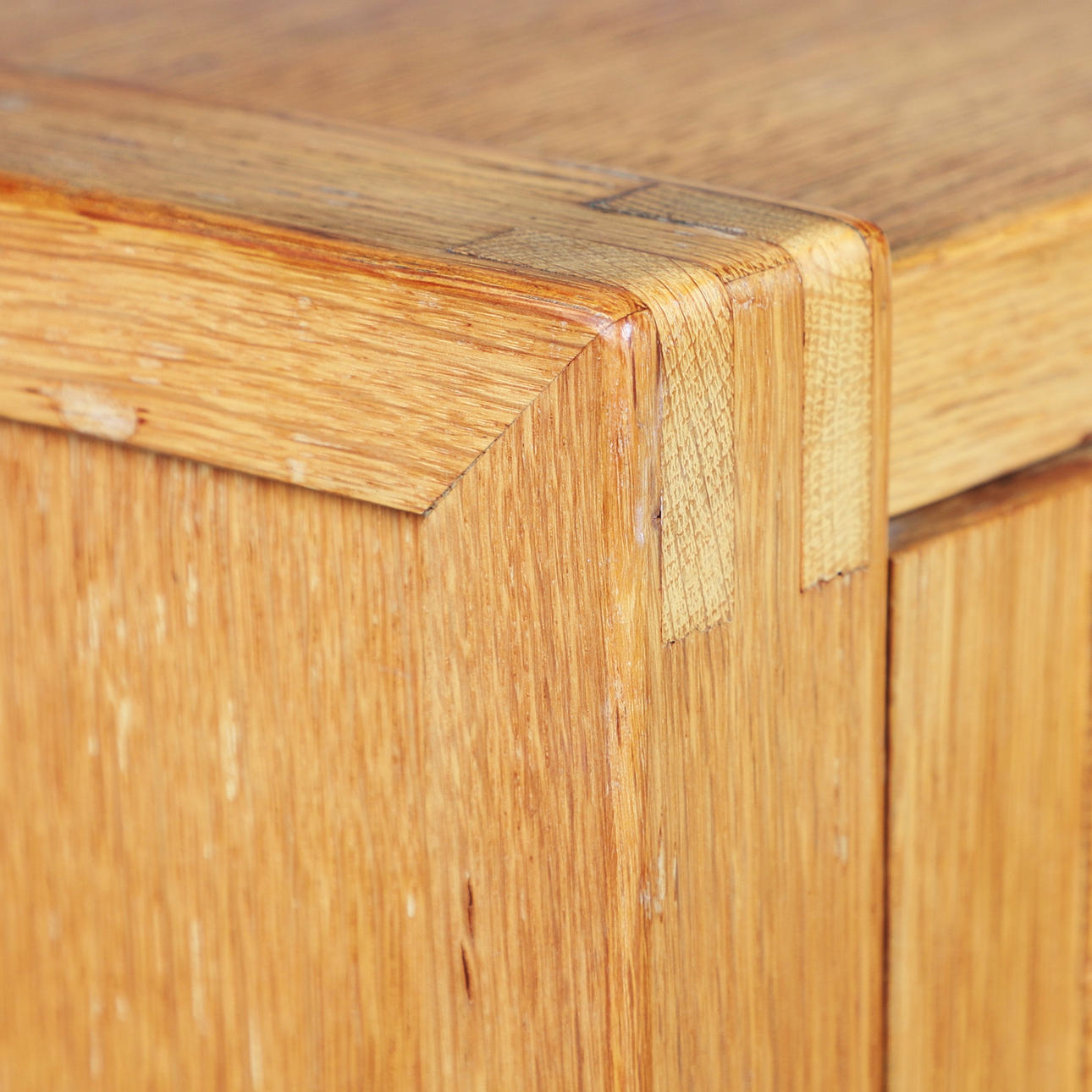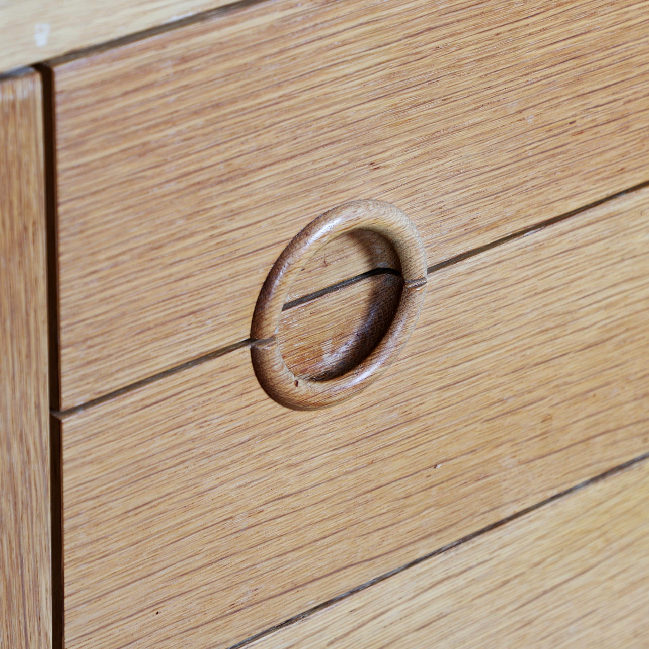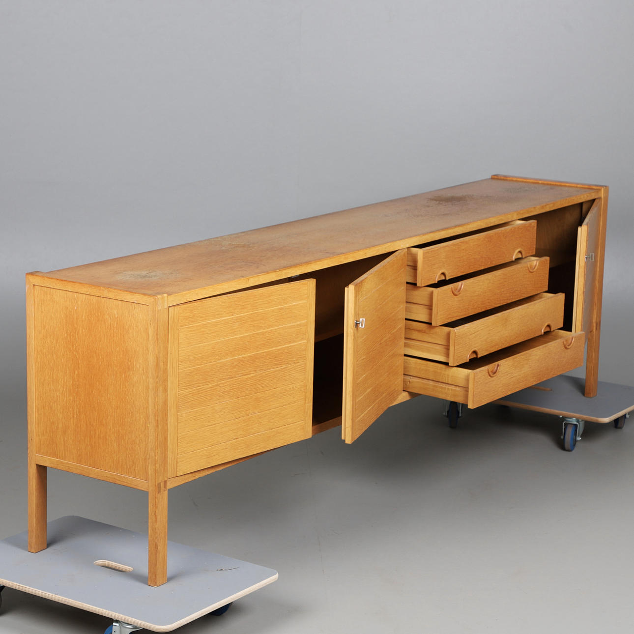 Musterring International, sideboard, oak, 1960s, Germany. Sideboard made of oak wood, with a lockable double door on the left, with a lockable door and four drawers on the right, equipped with shelves on the inside, labeled on the inside with the manufacturer's plaque, H.80cm, L.256cm, W.46cm.