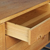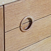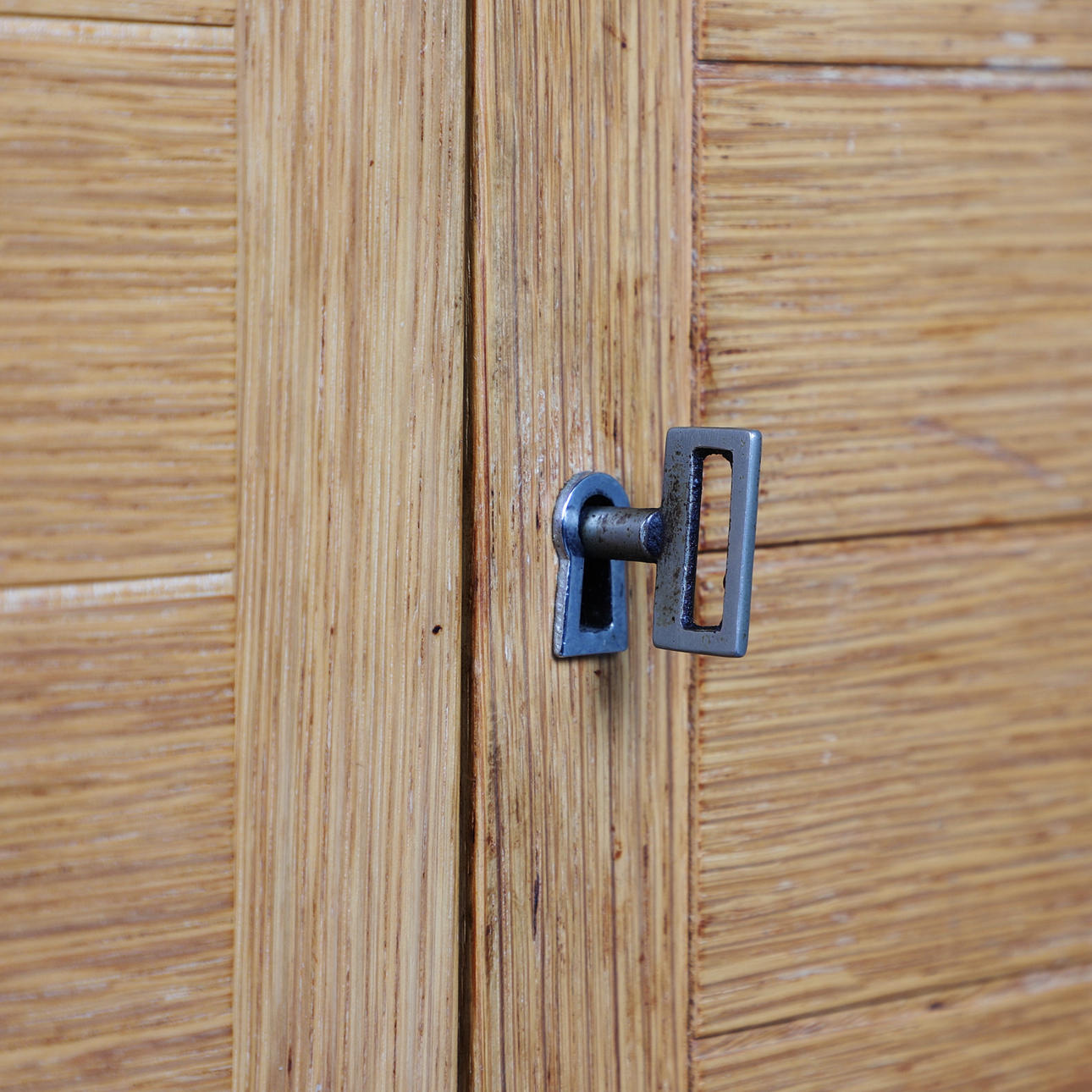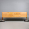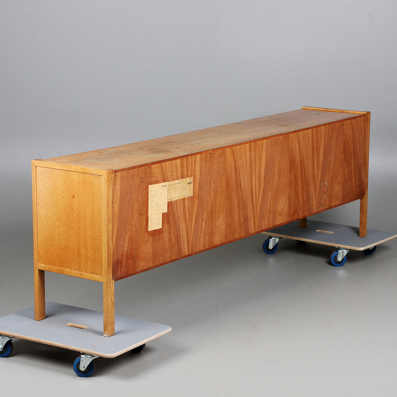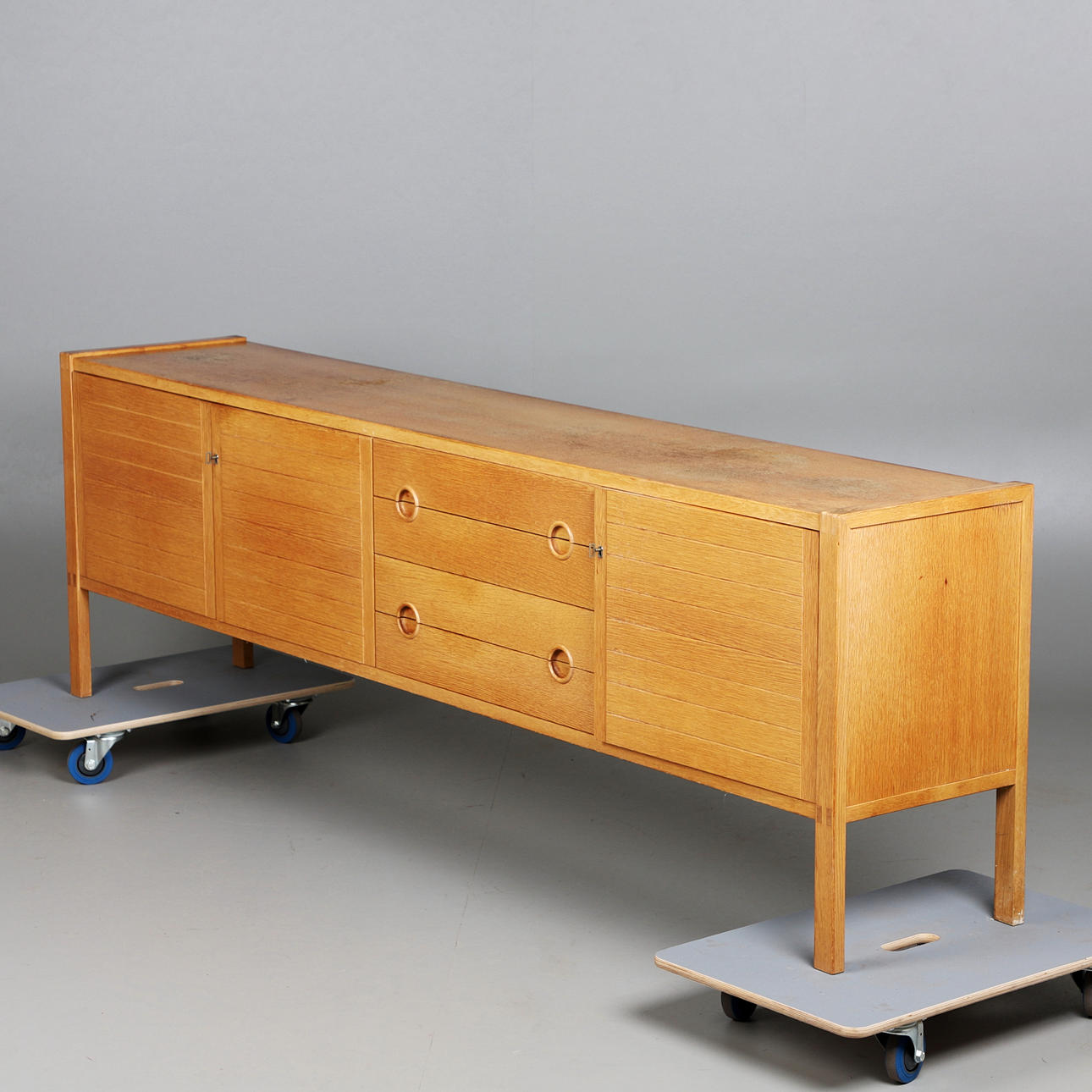 Musterring International, sideboard, oak, 1960s, Germany. Sideboard made of oak wood, with a lockable double door on the left, with a lockable door and four drawers on the right, equipped with shelves on the inside, labeled on the inside with the manufacturer's plaque, H.80cm, L.256cm, W.46cm.