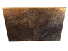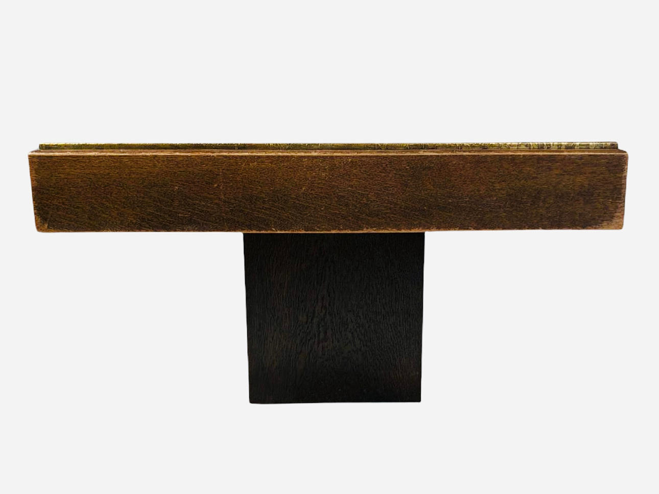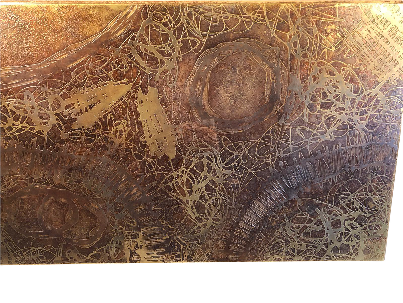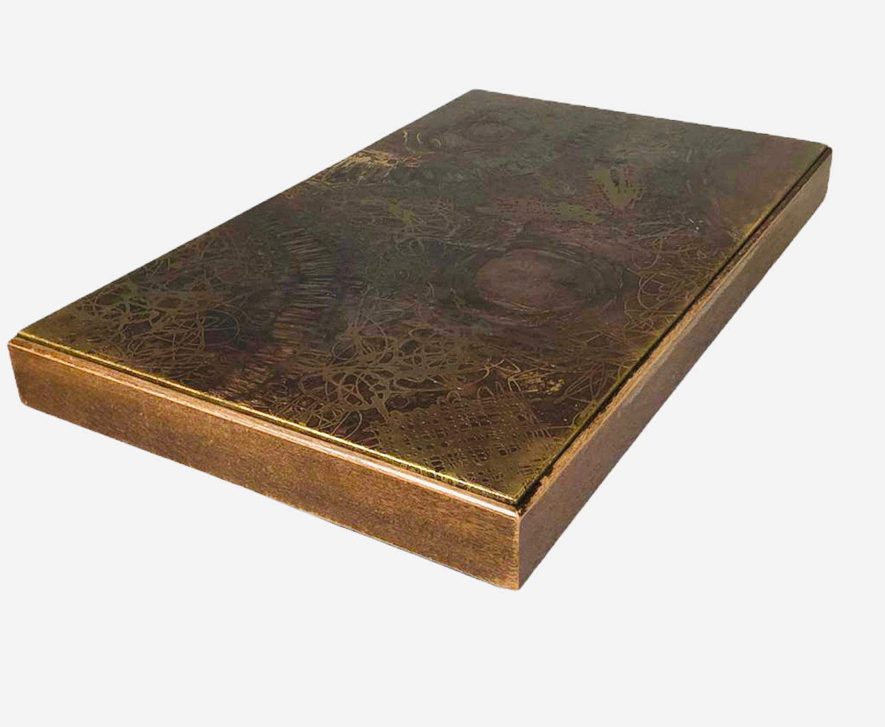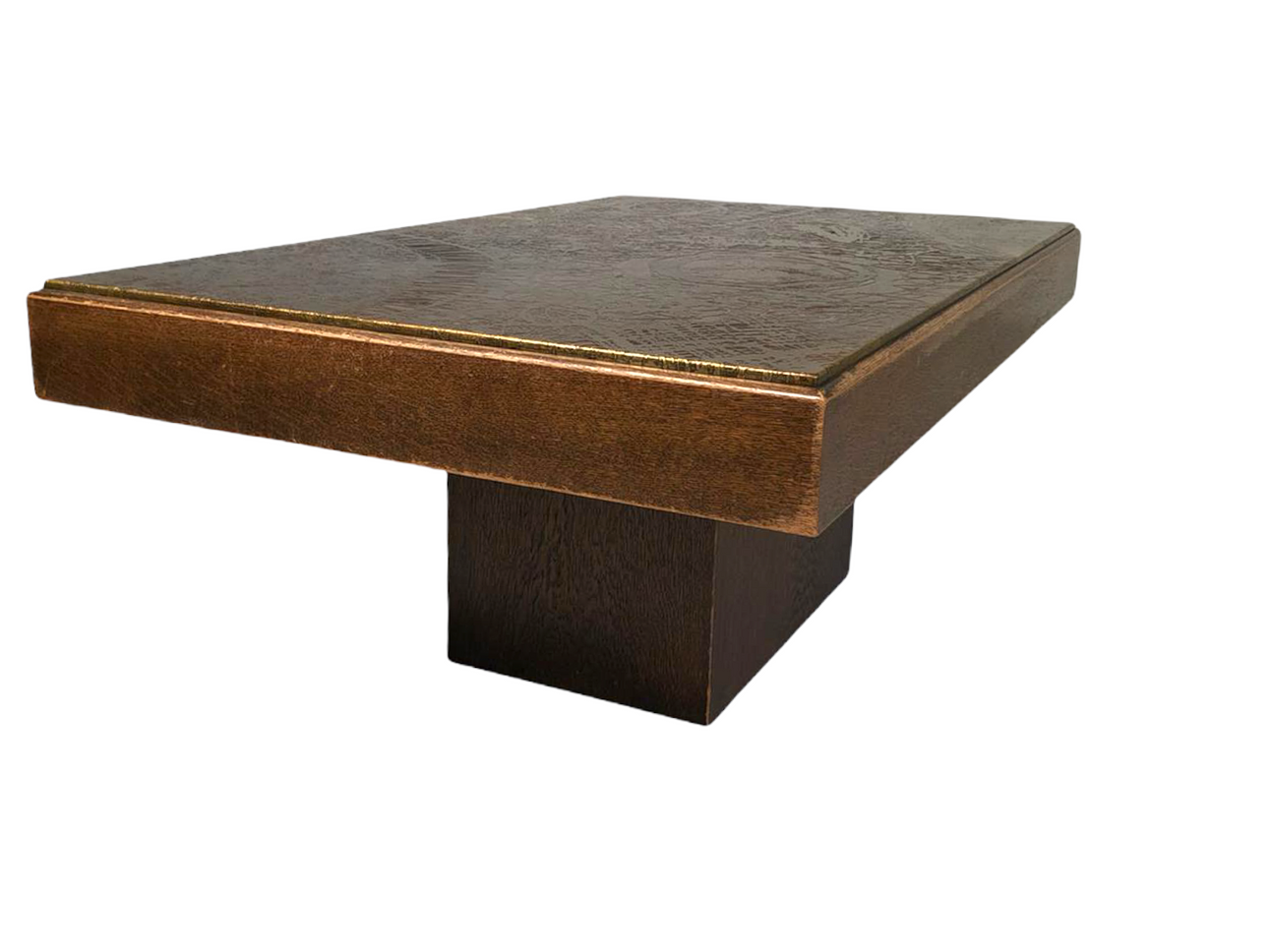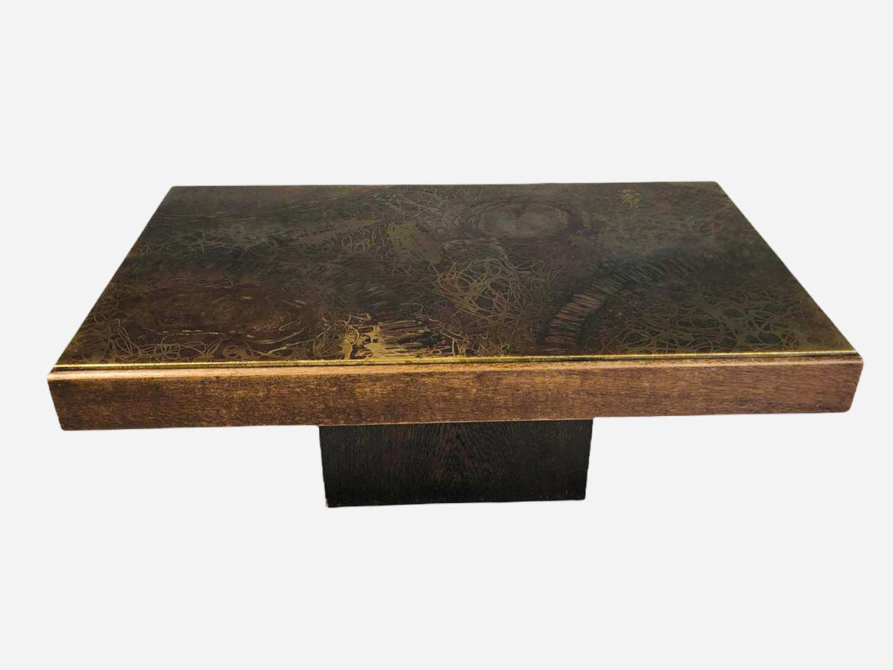 Table by Heinz Lilienthal, copper sheet, wood, 1970s. Design with a wooden block base and a rectangular wooden table top with etched copper sheet, H.50.5 cm, L.130cm, W.80cm.