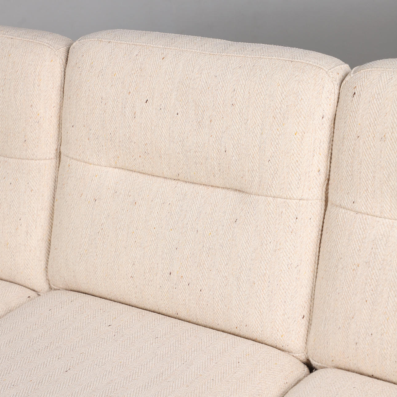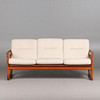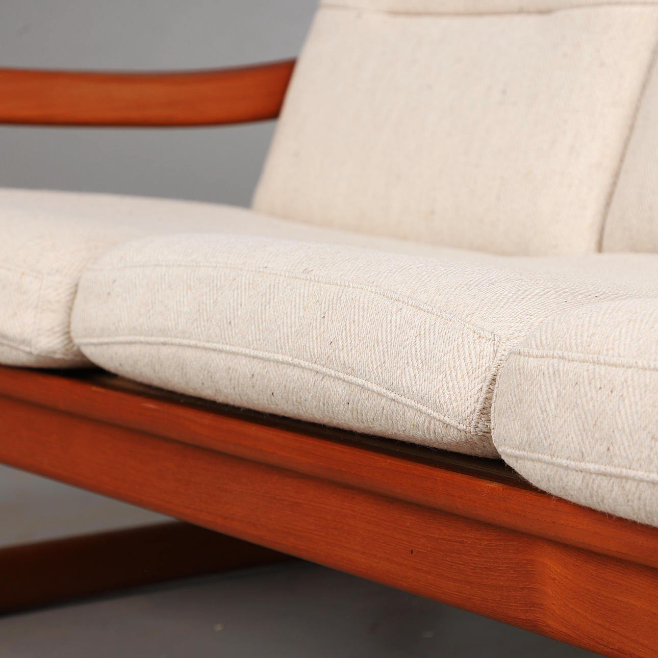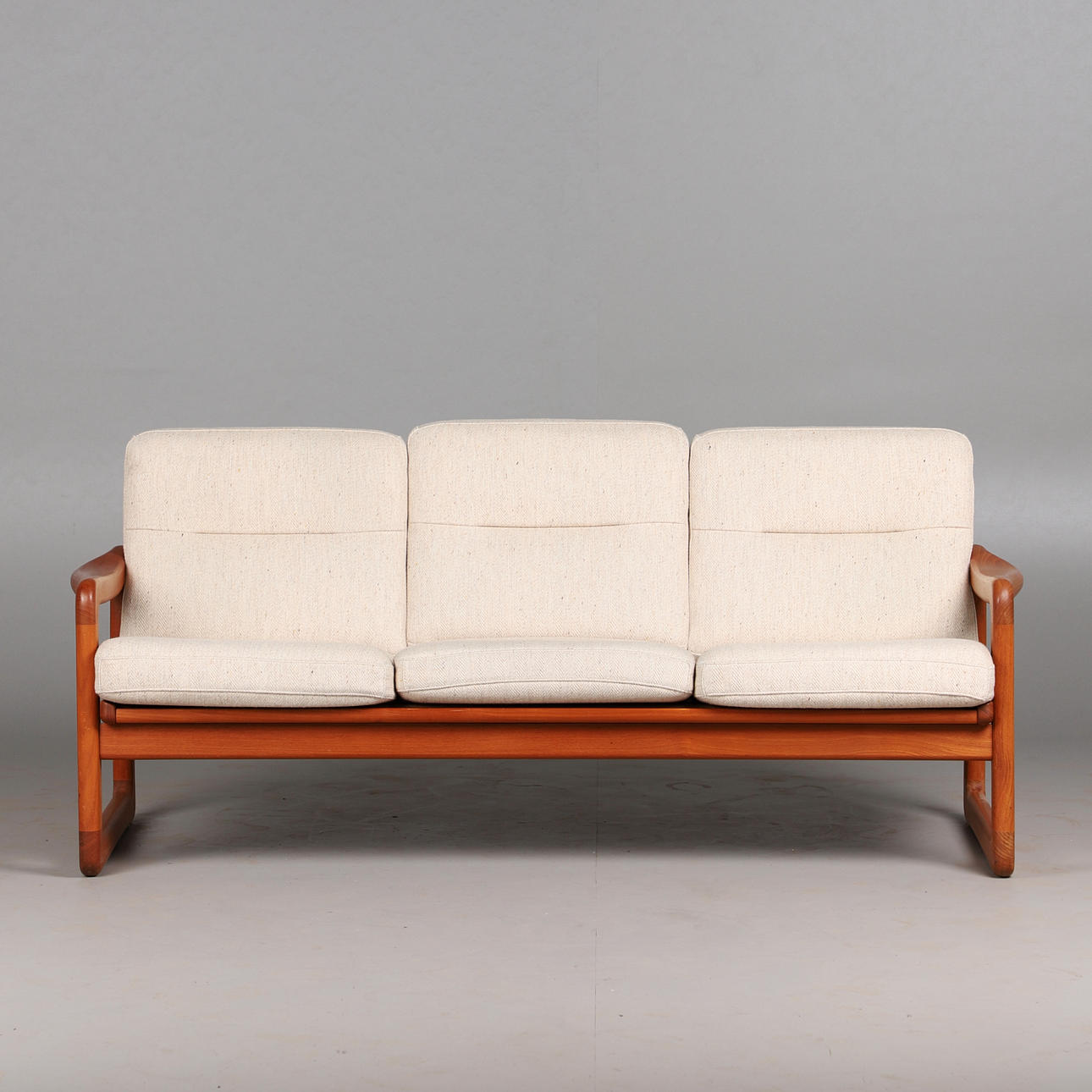Holstebro Møbelfabrik, sofa / couch, teak, wool, 1970s, Denmark. Three-seater sofa with a teak frame with armrests and sled base, loose cushions made of cream-colored mottled wool with button stitching, marked with manufacturer's label, H.77cm, seat height: 41cm, L.183cm, W.75cm.