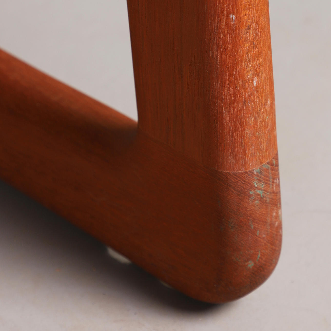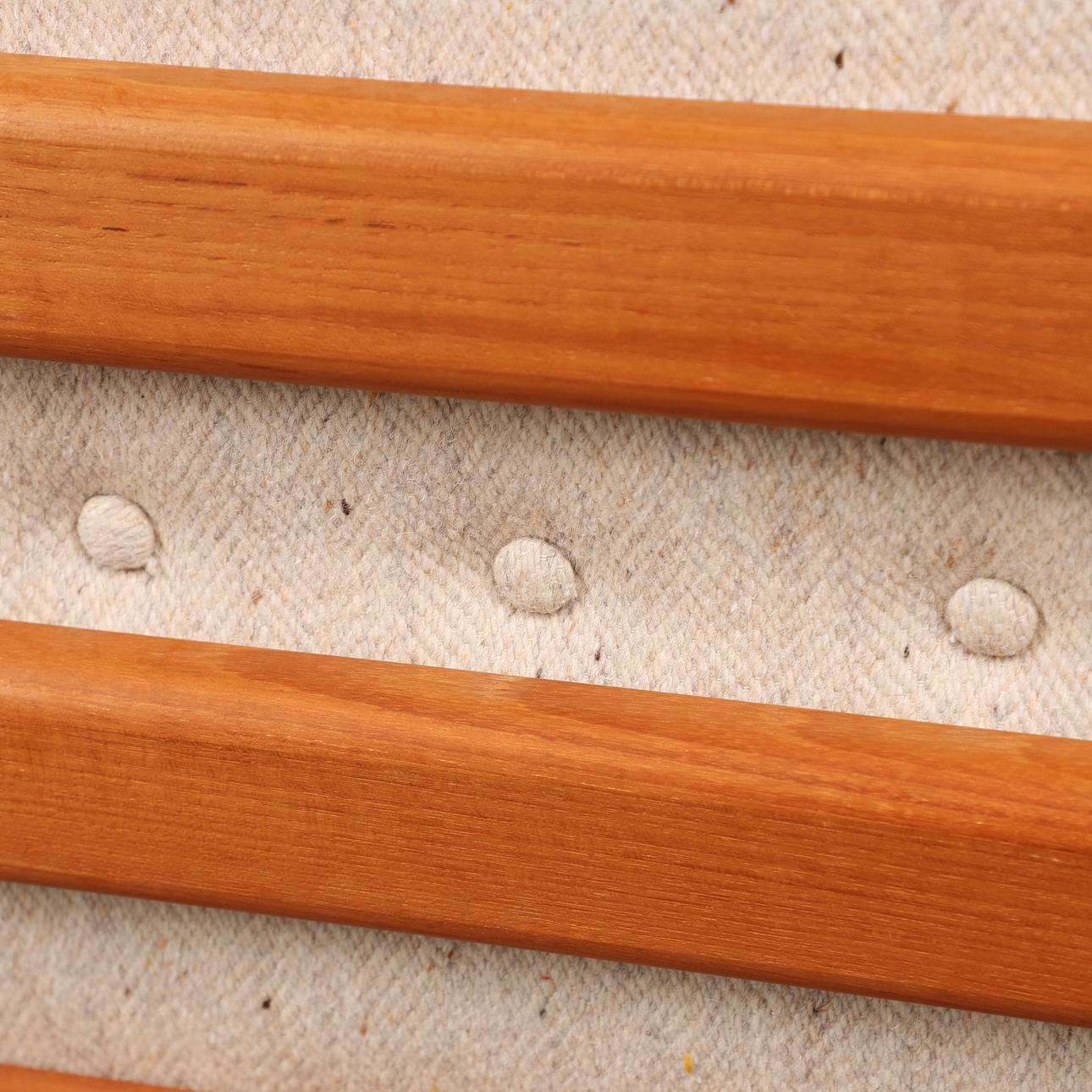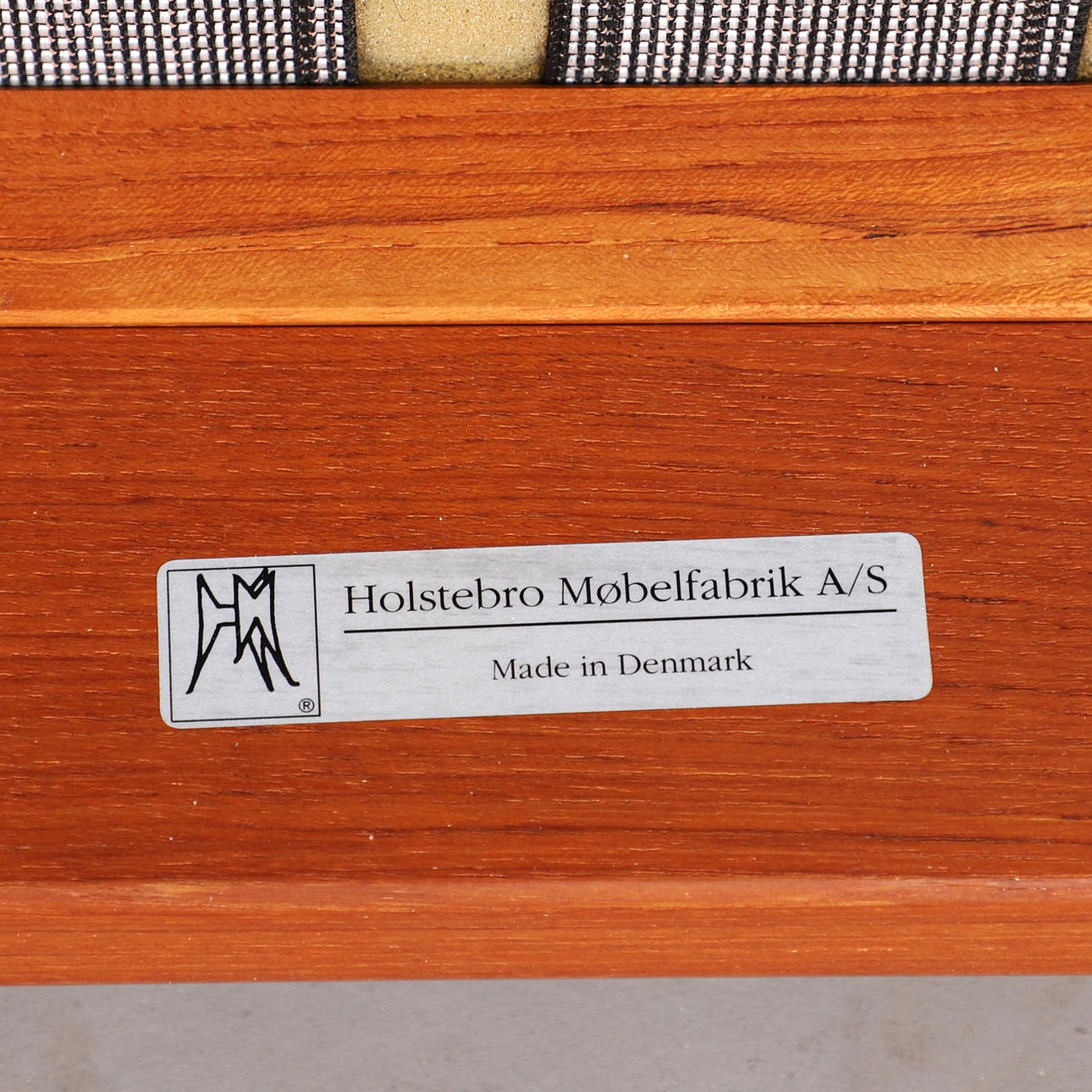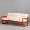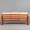 Holstebro Møbelfabrik, sofa / couch, teak, wool, 1970s, Denmark. Three-seater sofa with a teak frame with armrests and sled base, loose cushions made of cream-colored mottled wool with button stitching, marked with manufacturer's label, H.77cm, seat height: 41cm, L.183cm, W.75cm.
