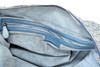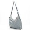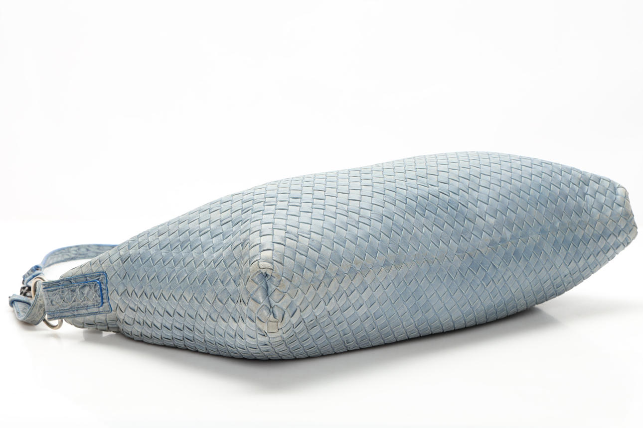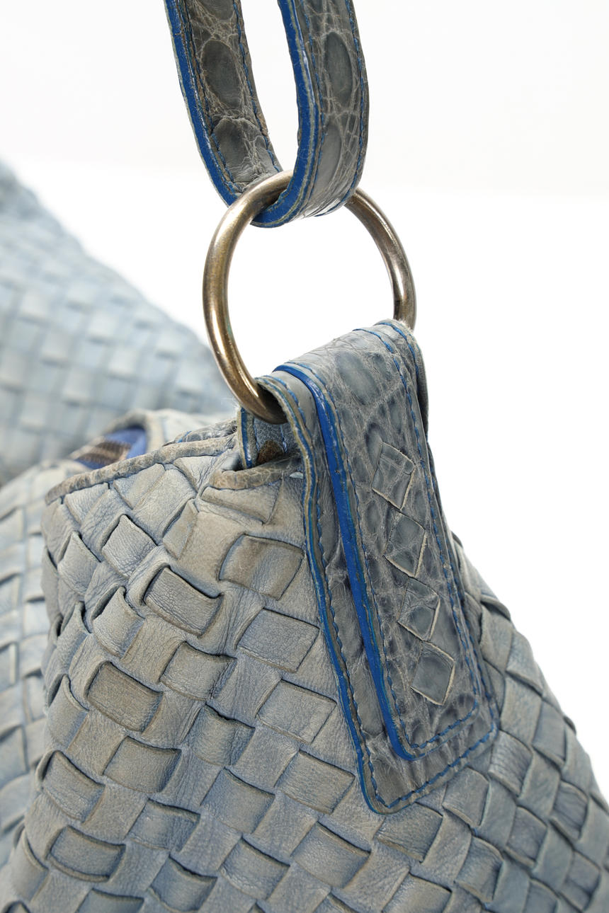Braided in blue nappa with details in croco-embossed leather. Buckles and housings in dark oxidized white metal. Interior in suede, a larger zipped side compartment and a smaller open one for a mobile phone.