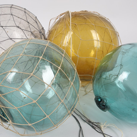 5 glass floats in net. 3 large and two small. A large stamped PCF and a small stamped M.