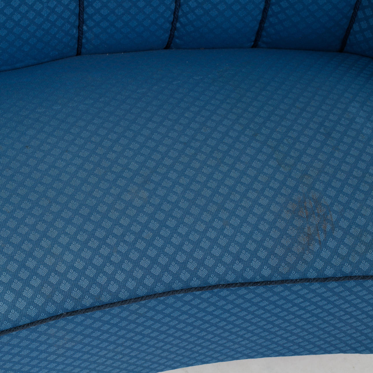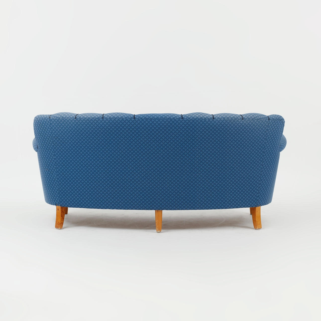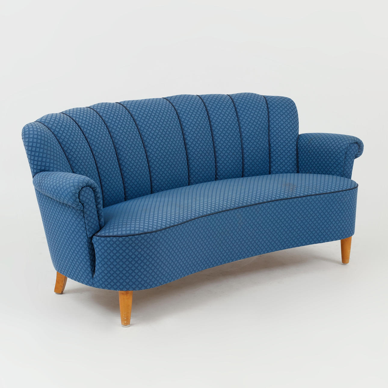 Blue small-patterned textile upholstery. On birch legs. Length approx. 182 cm, seat height approx. 42 cm, back height approx. 80 cm.