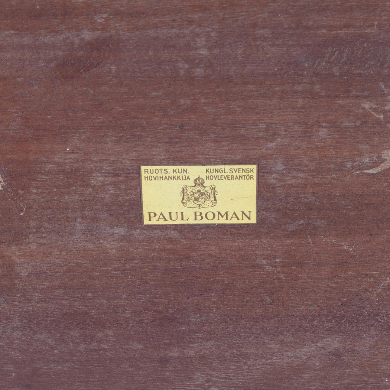 Mahogany veneered. Manufacturer's paper label "Paul Boman Ruots. Kun. Hovihankkija Kungl. Svensk hovleverantör" (Royal Warrant). 60 x60 cm, height 54 cm.
