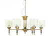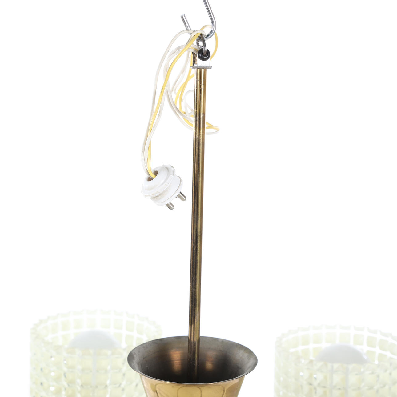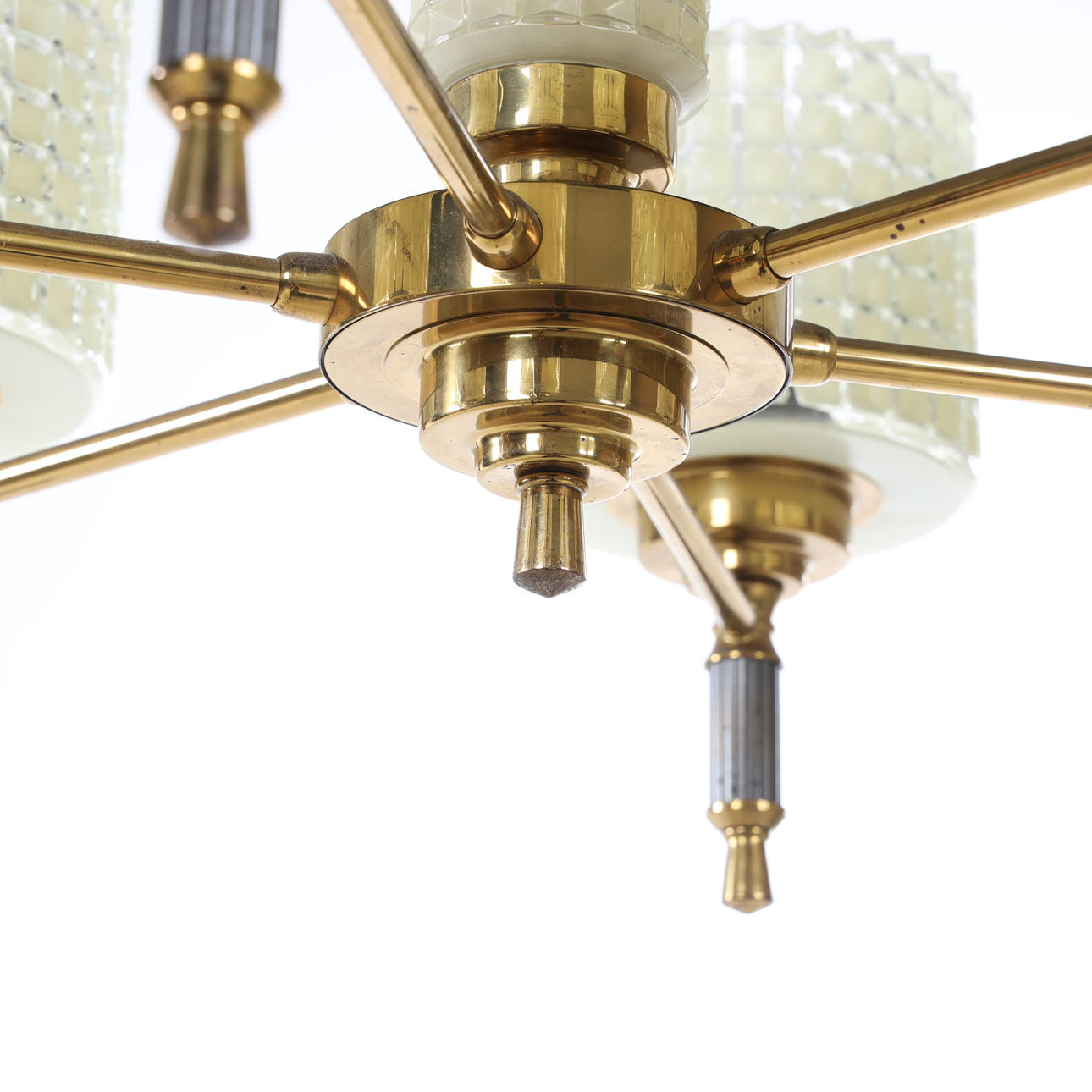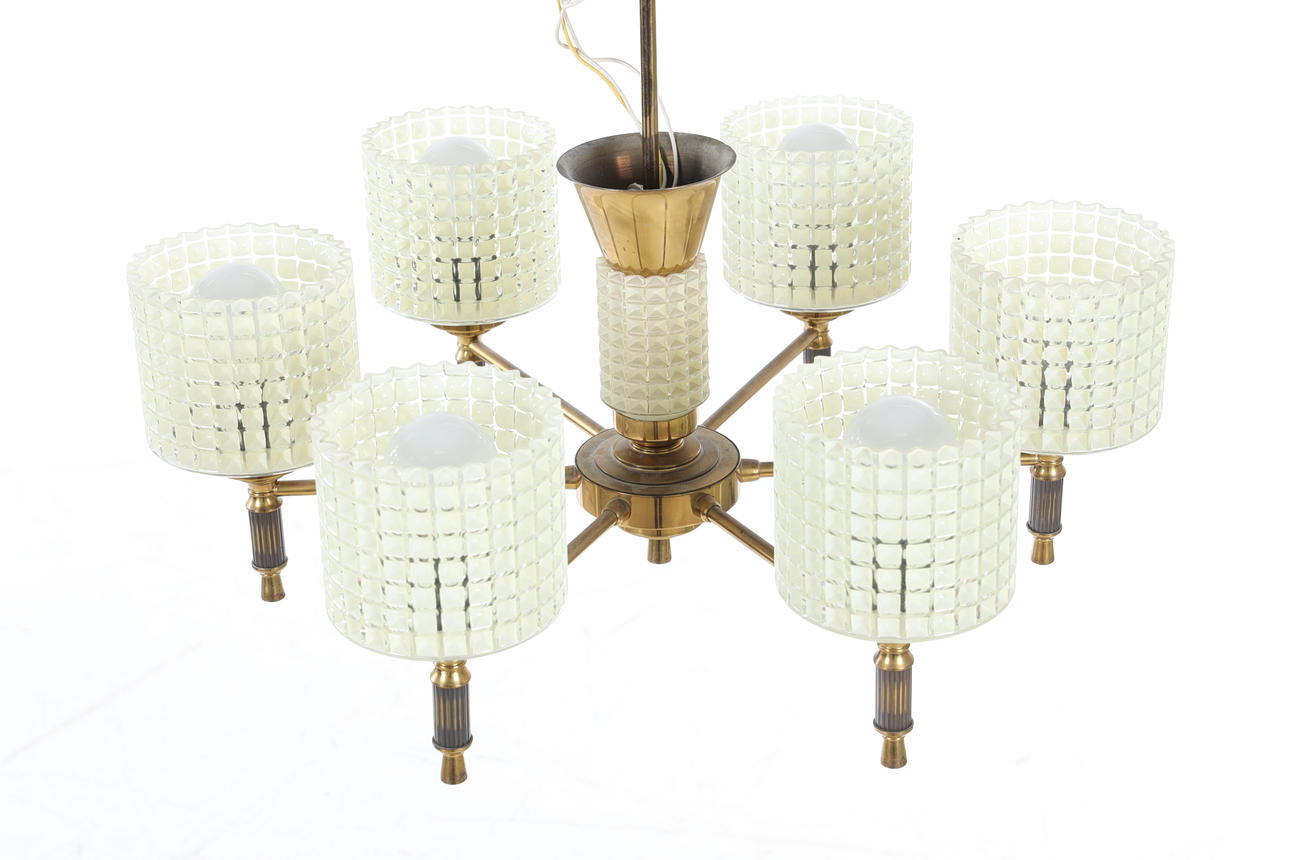 Brass frame, 6 candle arms with glass cups, total height approx. 52, diameter 60 cm.
