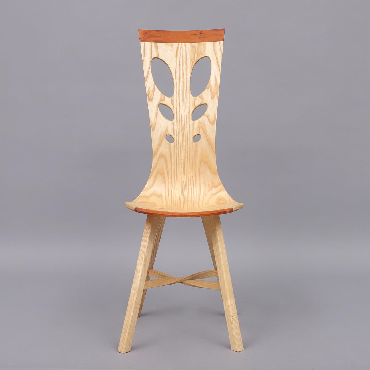 Chair in solid oiled ash, the seat with cross pieces in yew. On coupled leg position with openwork back. Designed and made by the furniture carpenter Calle Warfvinge. Supplied handwritten card with information from the carpenter. Signed and numbered 111.