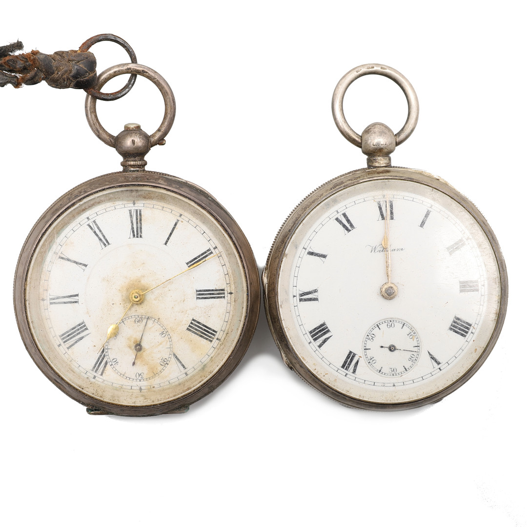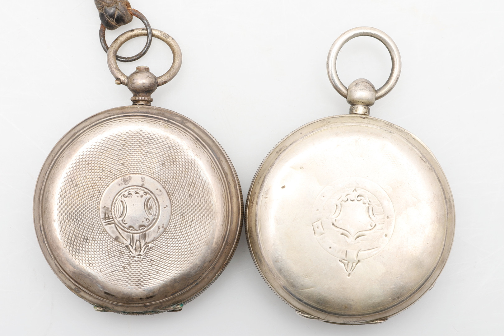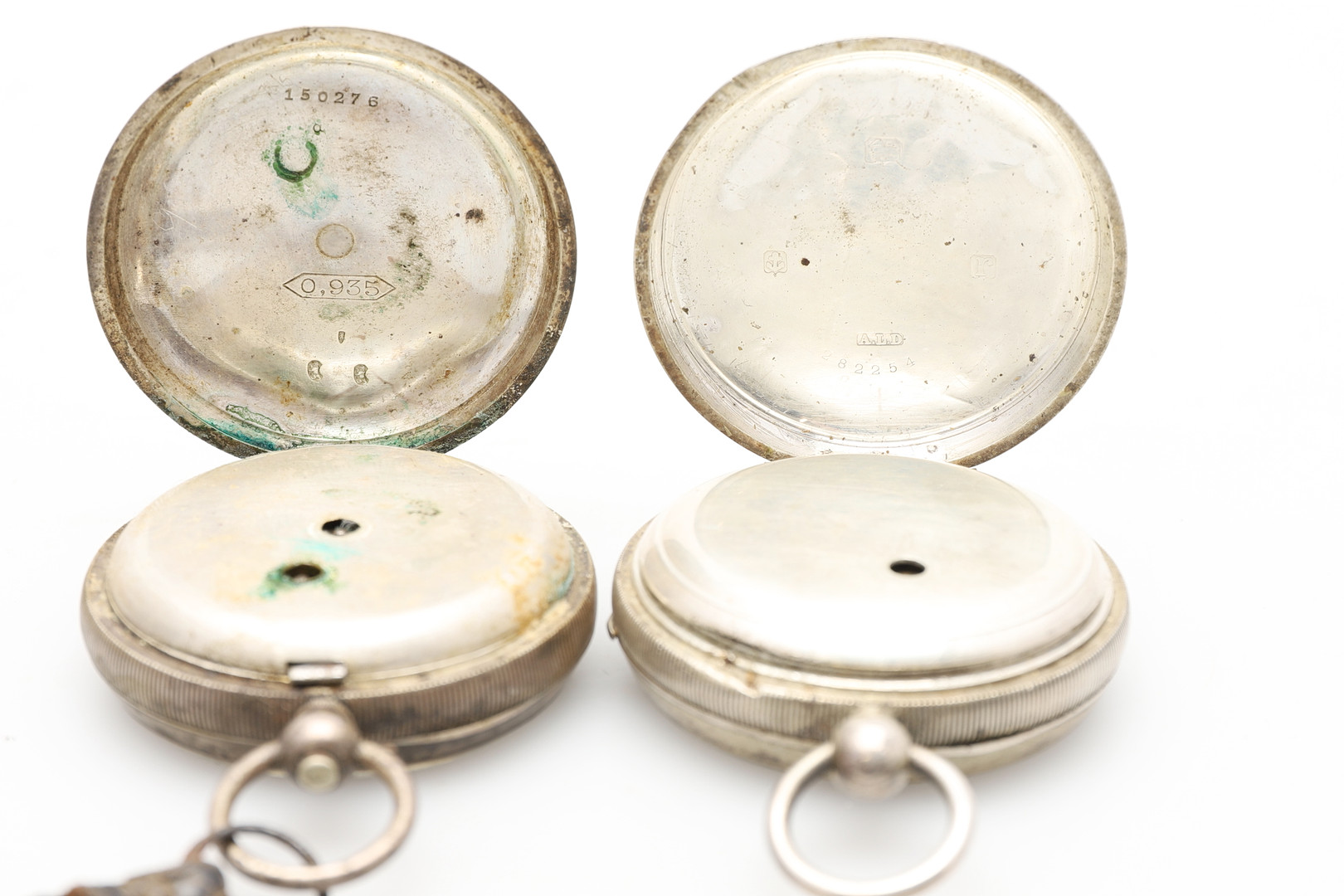 1948507. TWO SILVER CASED OPEN FACED POCKET WATCHES.