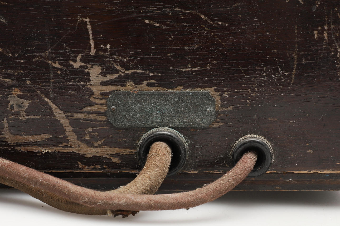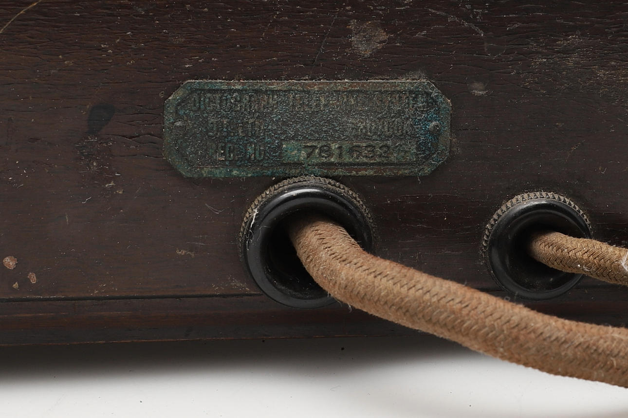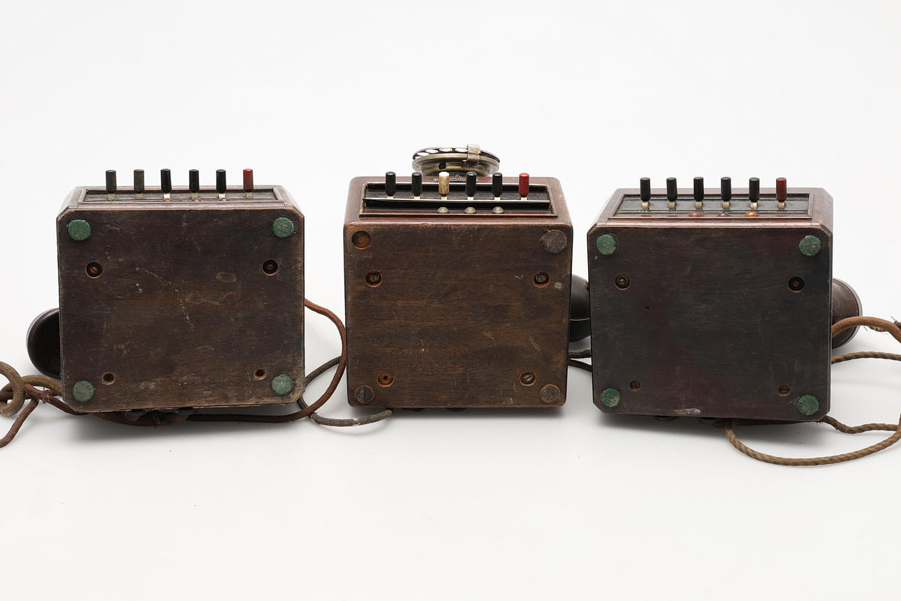 with Bakelite handles and cradles, on mahogany box bases, one with backplate with Reg. number 781632,
