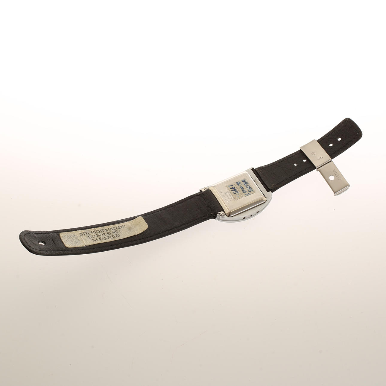 The world's first radio-controlled wristwatch. White metal, Quartz, mineral glass, leather strap, box. Residence number 26/0010011. Height about 44 mm, width about 33 mm.
