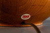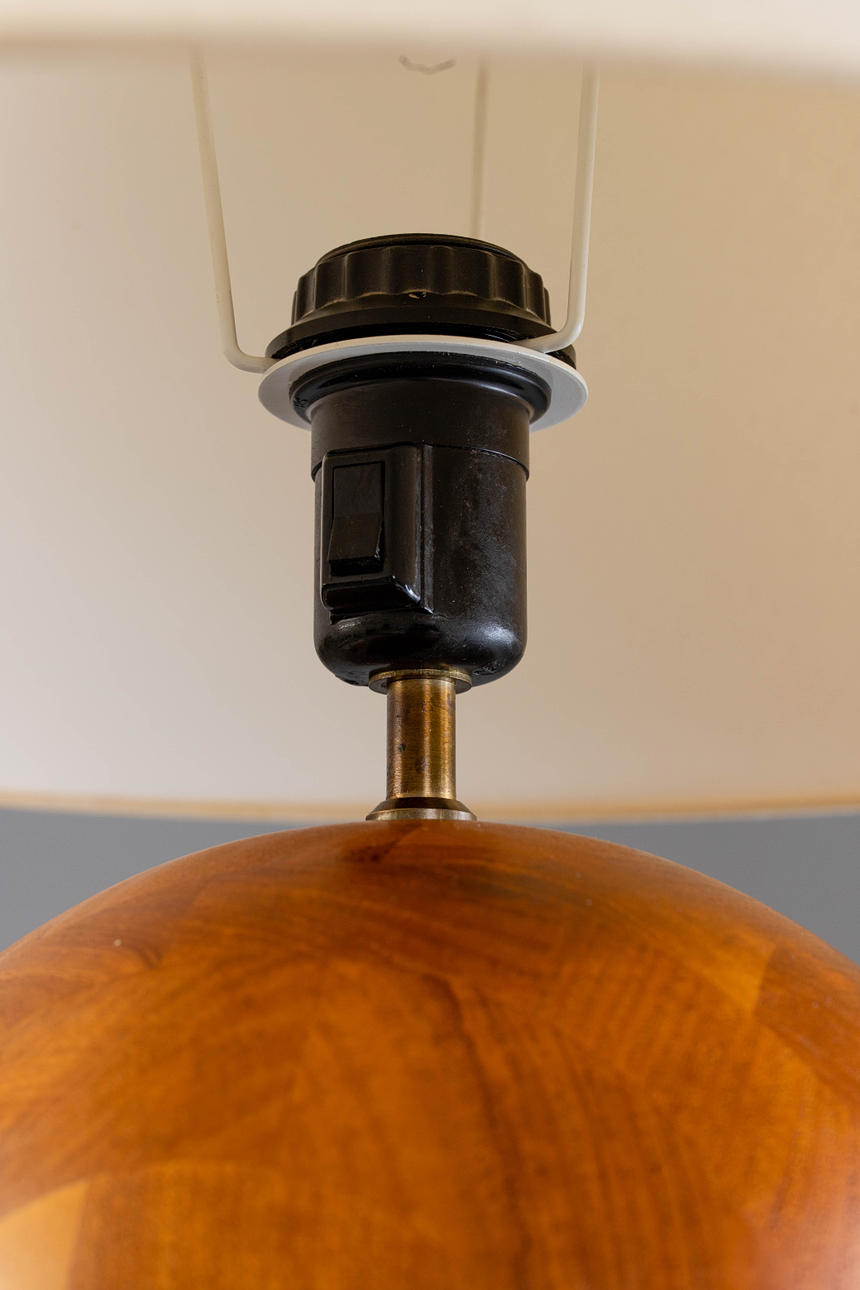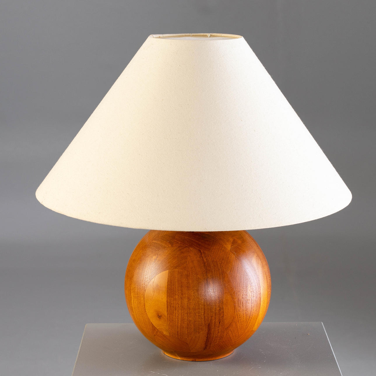 Denmark, 1960s. Teak wood. Beige lampshade. Marked with sticker. H. 50 cm, Ø 47.5 cm.