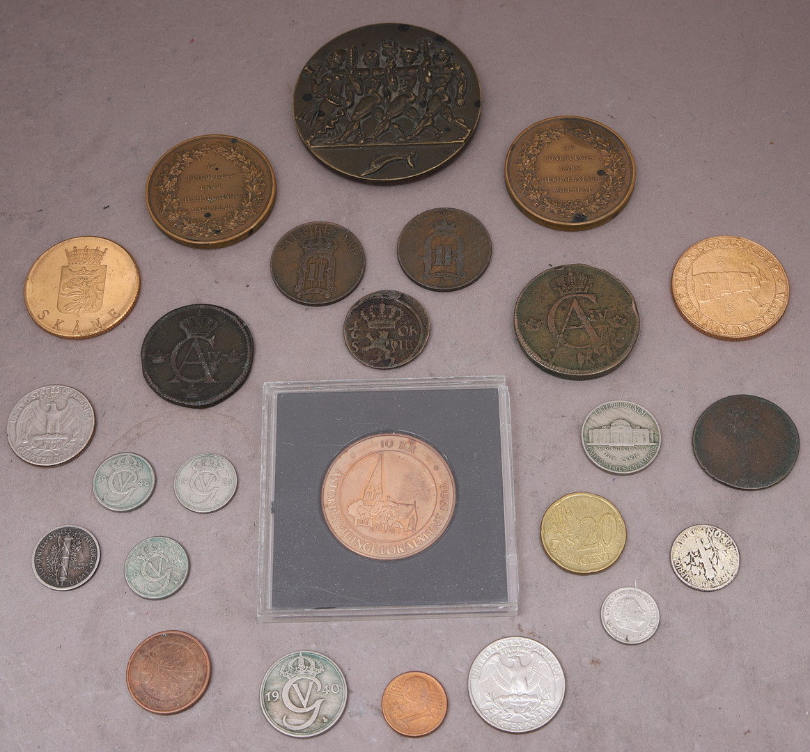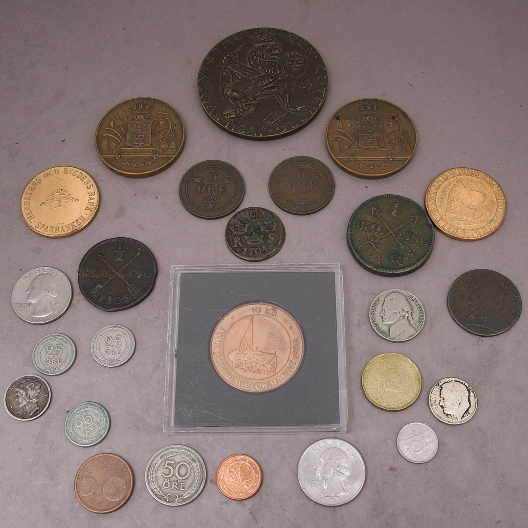 1965397. COINS & MEDALS, 24 pcs., i.a. shilling, local coin, commemorative coin Gothenburg exhibition 1923 and commemorative coin Regal ship Wasa.