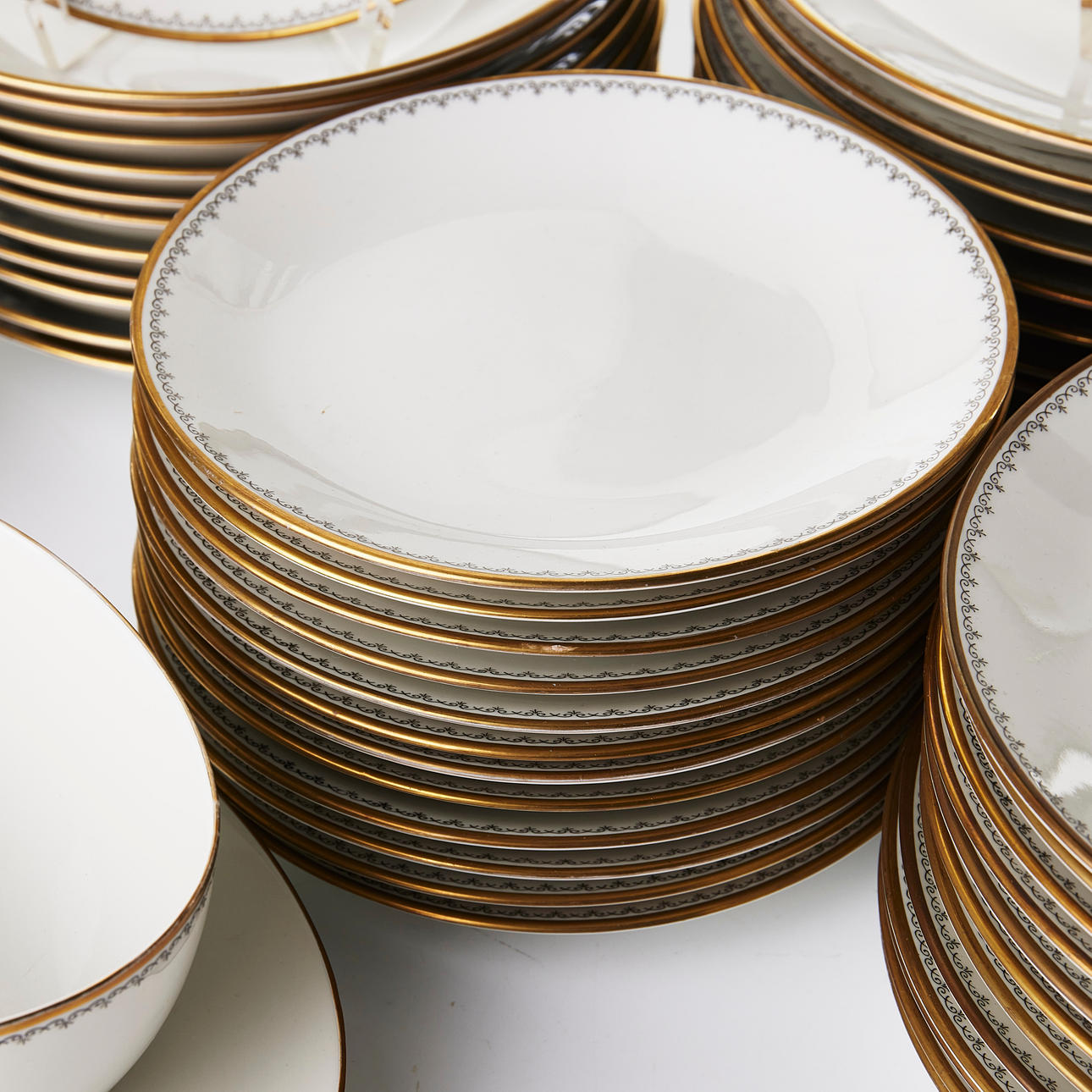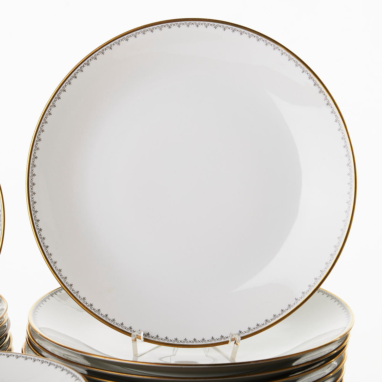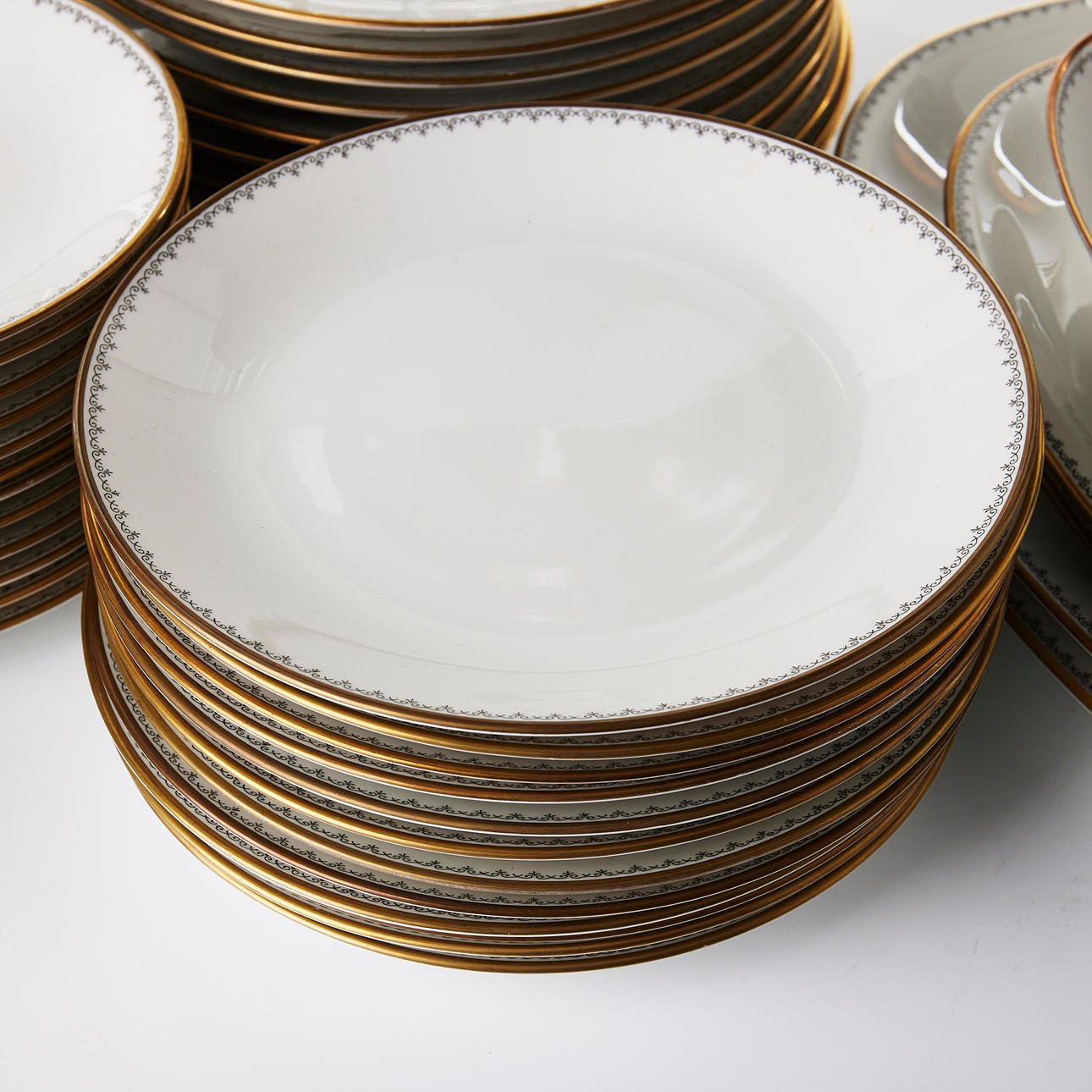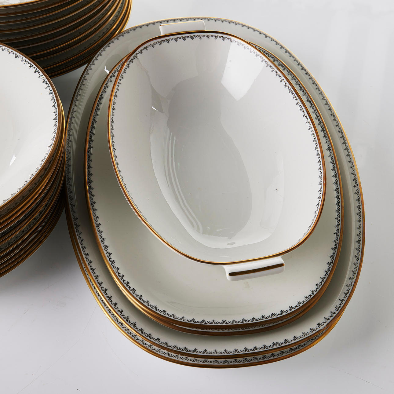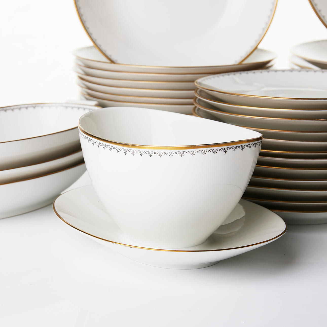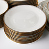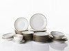 Collection consists of 12 dinner plates, 12 deep plates, 12 serving plates, 12 dessert plates, 2+1+3+1 serving platter, sauce bowl.