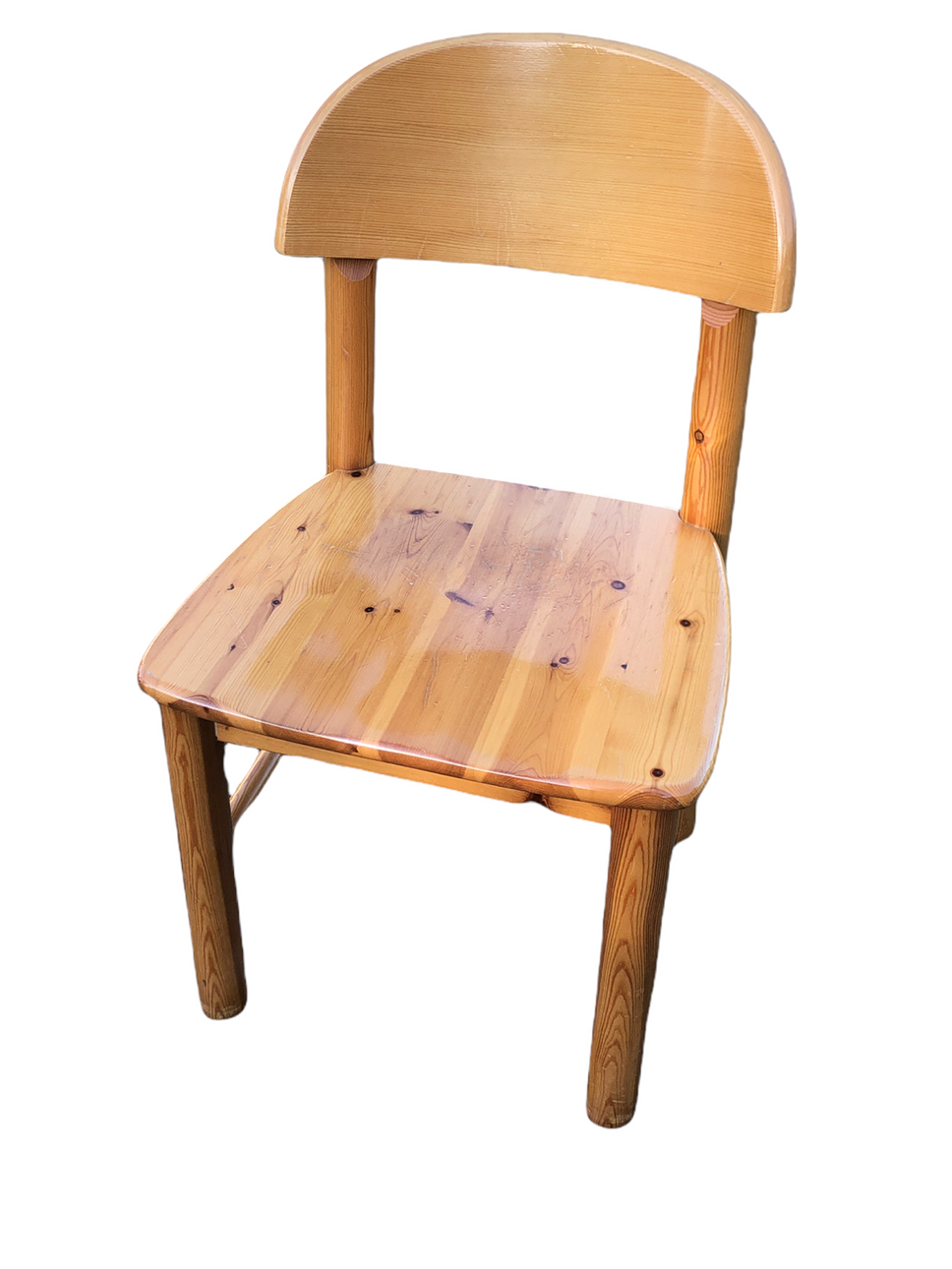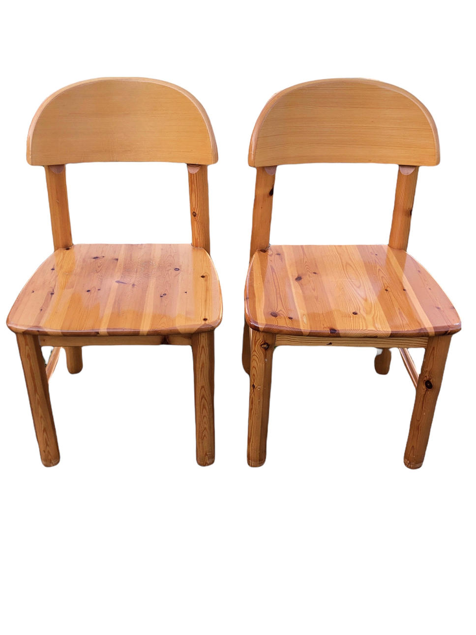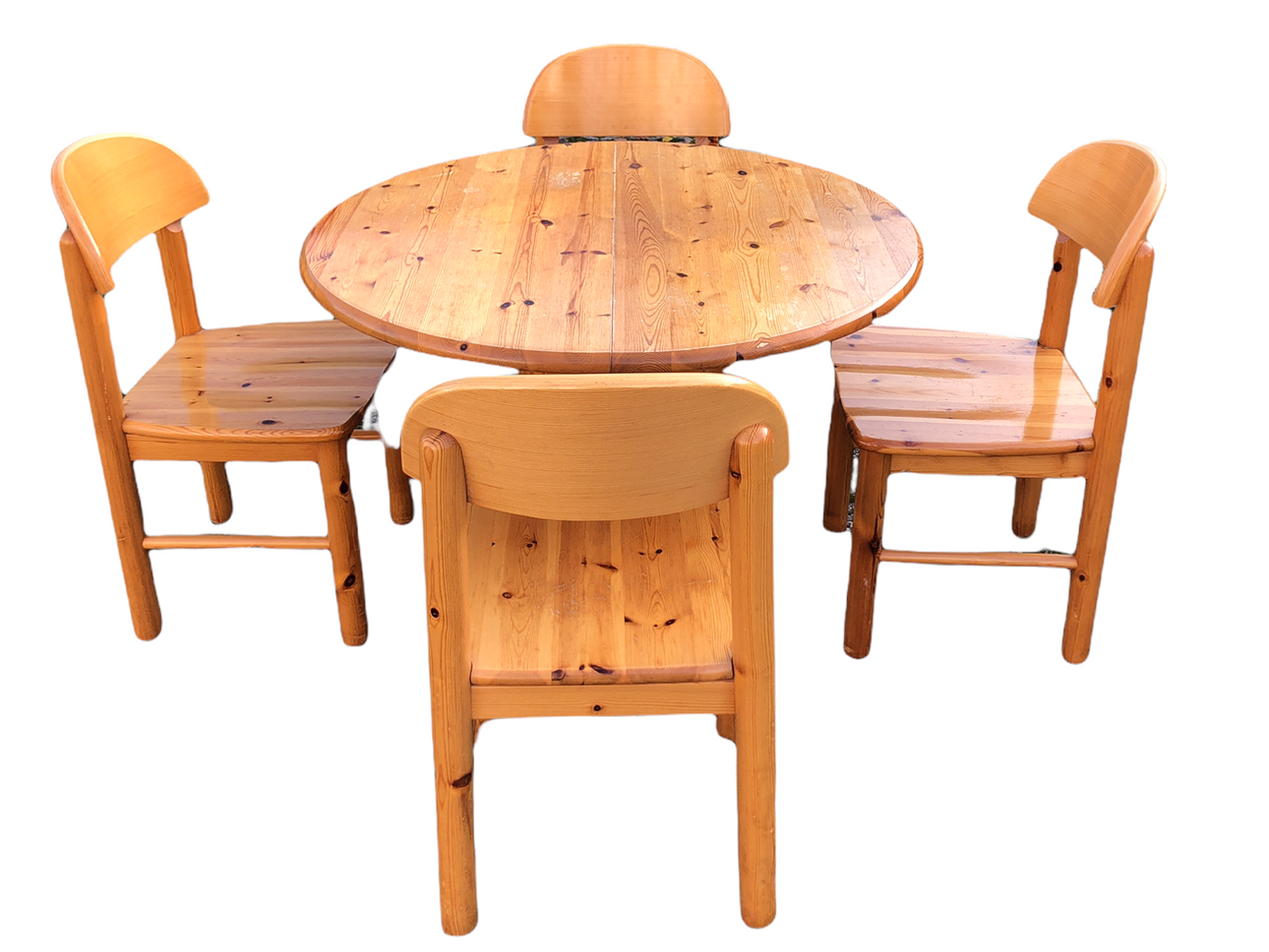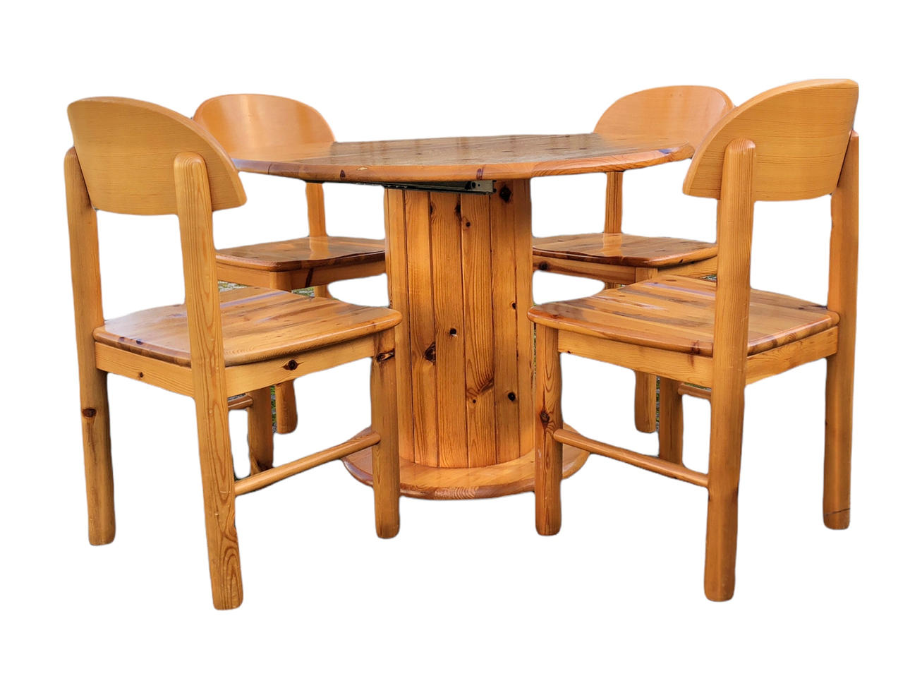 Chairs 1970s/80s, Danish design by Rainer Daumiller for Hirtshals Savværk. Construction made of solid pine wood with clear varnish and ergonomically designed seat. In addition round / oval dining table.