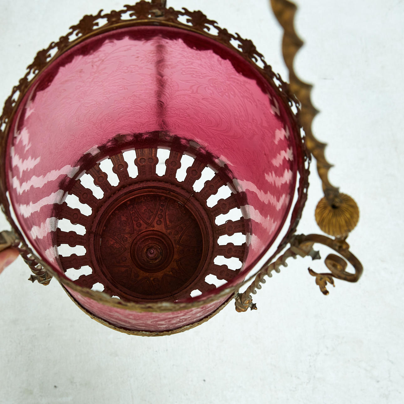 MOONLIGHT SAMPLE, circa 1900, cup in pink glass, brass.
