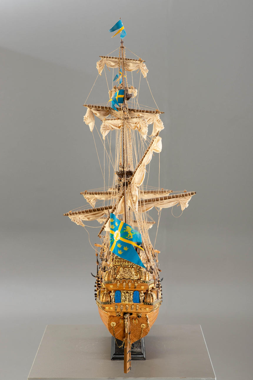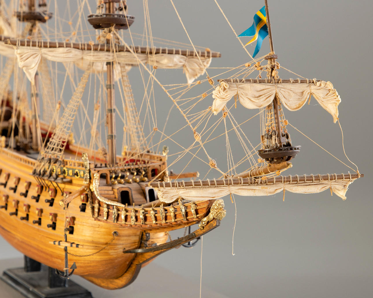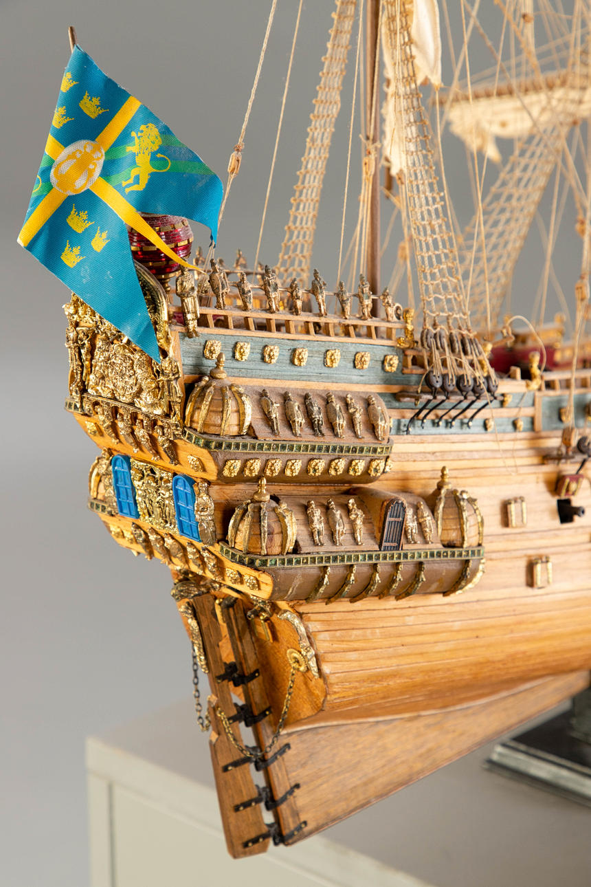 wood, partly colored painted/textile. Ship model of the three-masted galleon 'Wasa'. Commissioned by King Gustav II. Built by Adolf of Sweden in 1625 by the Skeppsgården shipyard. Equipped with 64 guns and a crew of 437 men, the ship was supposed to protect Sweden's religious and strategic interests towards Poland during the Thirty Years' War. On August 10, 1628, the ship capsized on its maiden voyage due to serious design errors and sank after about 1300 m. After being salvaged in 1961, the Wasa can now be seen restored in the Vasa Museum in Stockholm. HxW: approx. 76x91 cm.