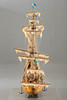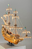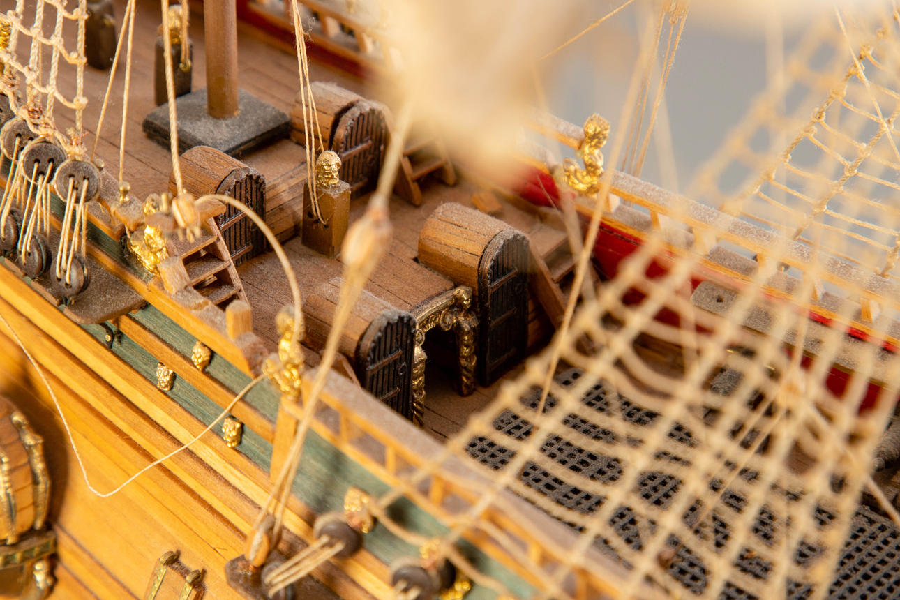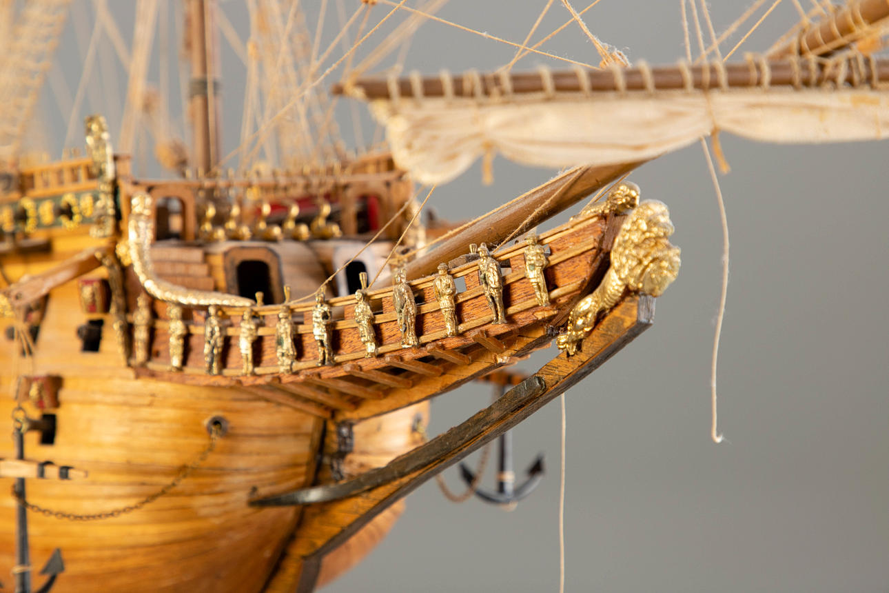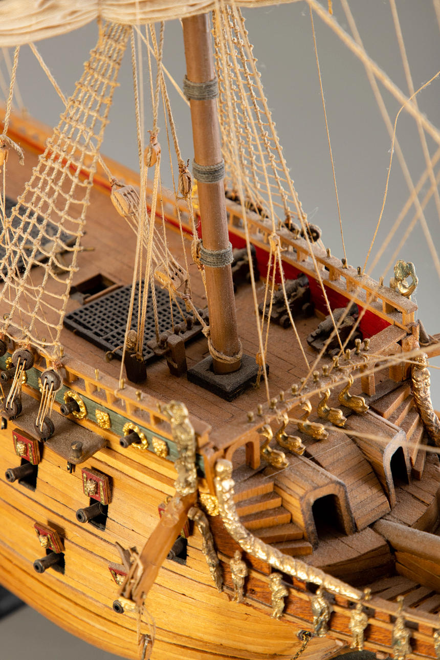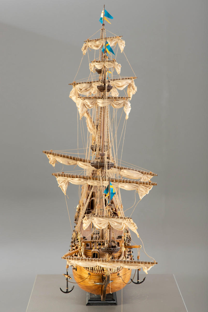 wood, partly colored painted/textile. Ship model of the three-masted galleon 'Wasa'. Commissioned by King Gustav II. Built by Adolf of Sweden in 1625 by the Skeppsgården shipyard. Equipped with 64 guns and a crew of 437 men, the ship was supposed to protect Sweden's religious and strategic interests towards Poland during the Thirty Years' War. On August 10, 1628, the ship capsized on its maiden voyage due to serious design errors and sank after about 1300 m. After being salvaged in 1961, the Wasa can now be seen restored in the Vasa Museum in Stockholm. HxW: approx. 76x91 cm.