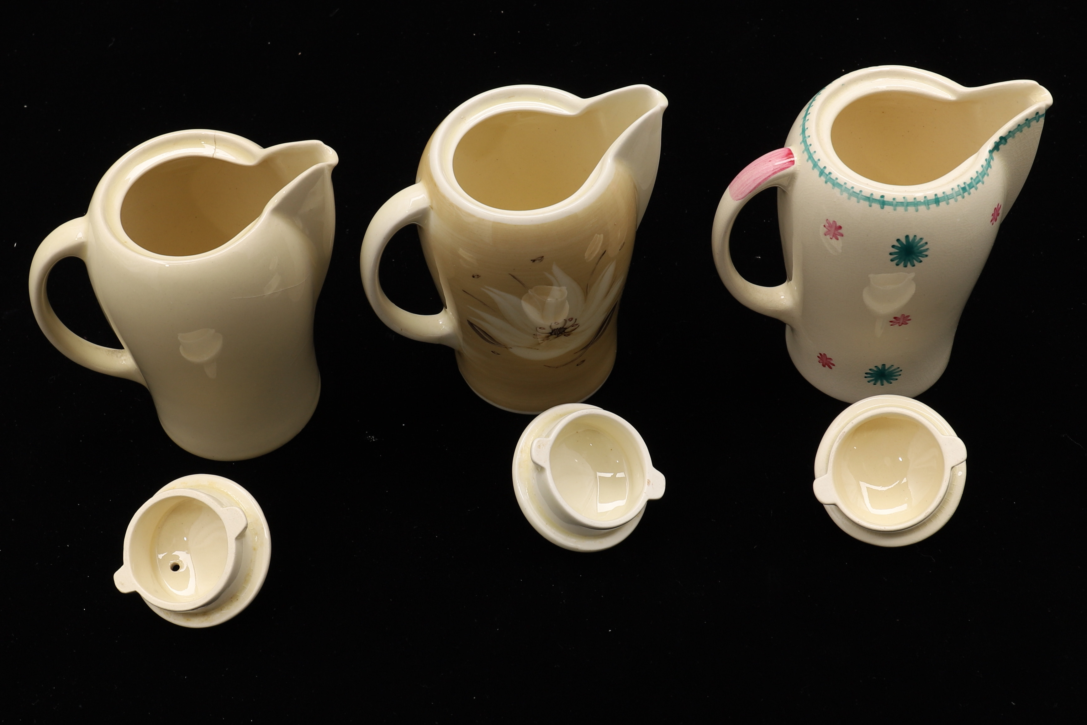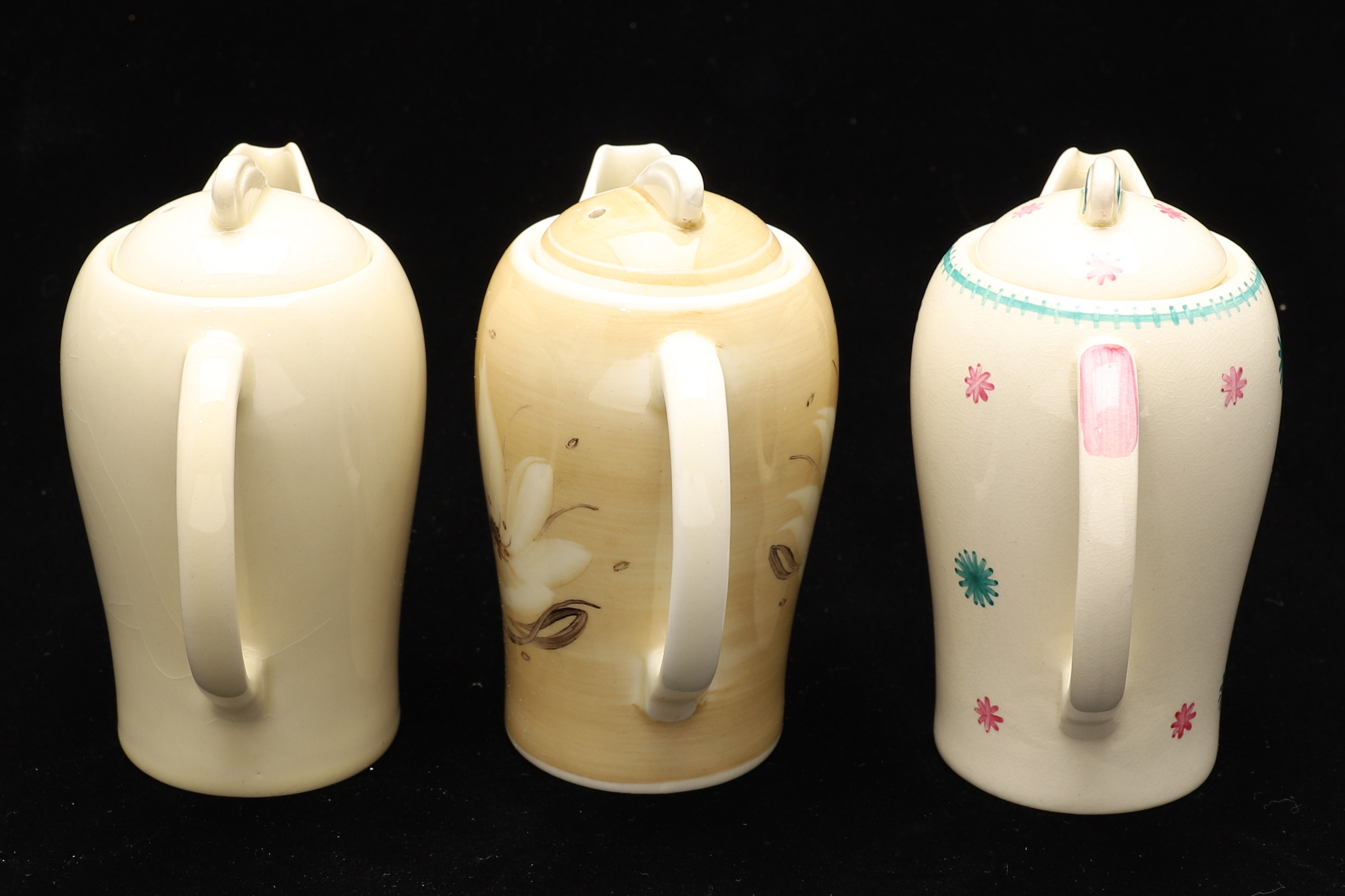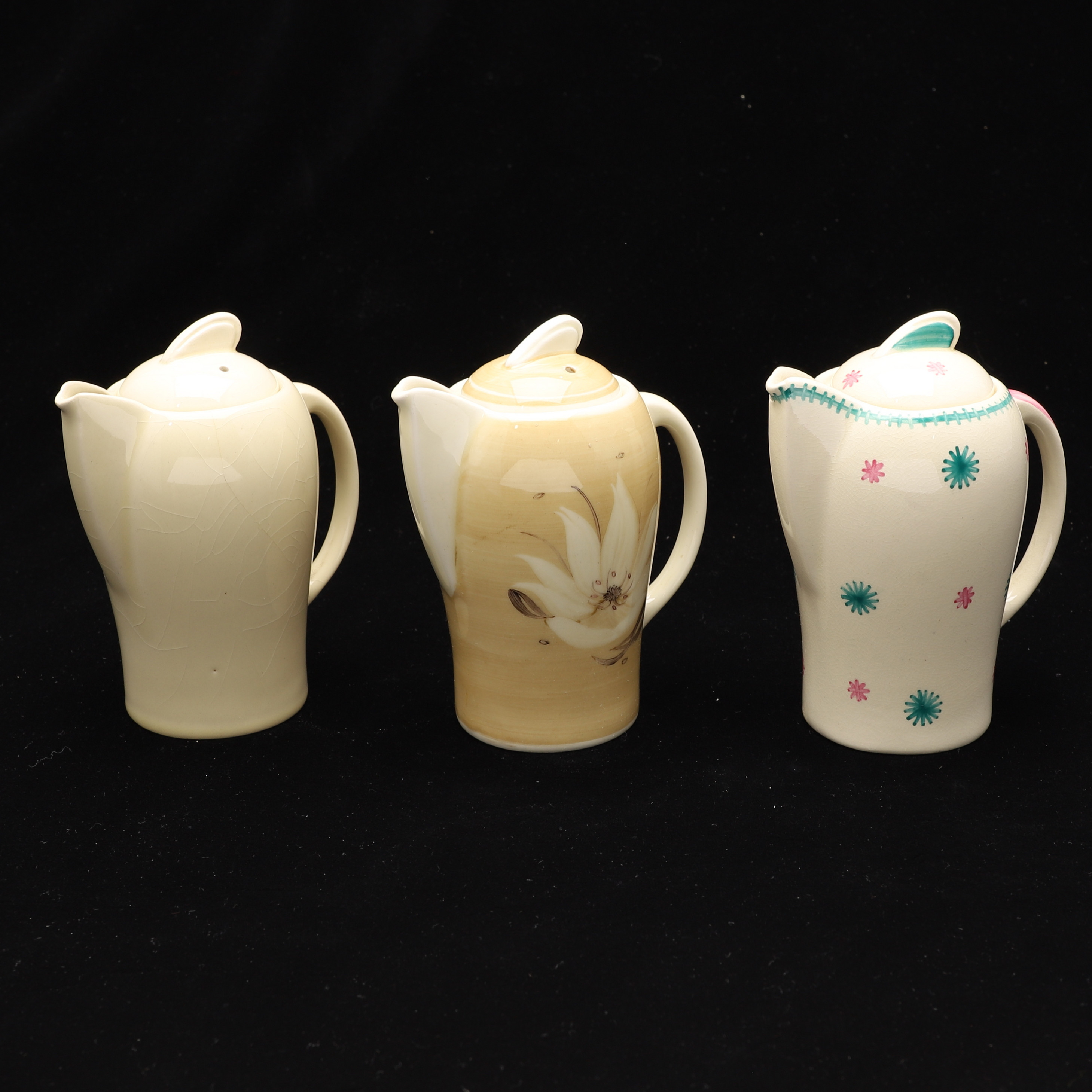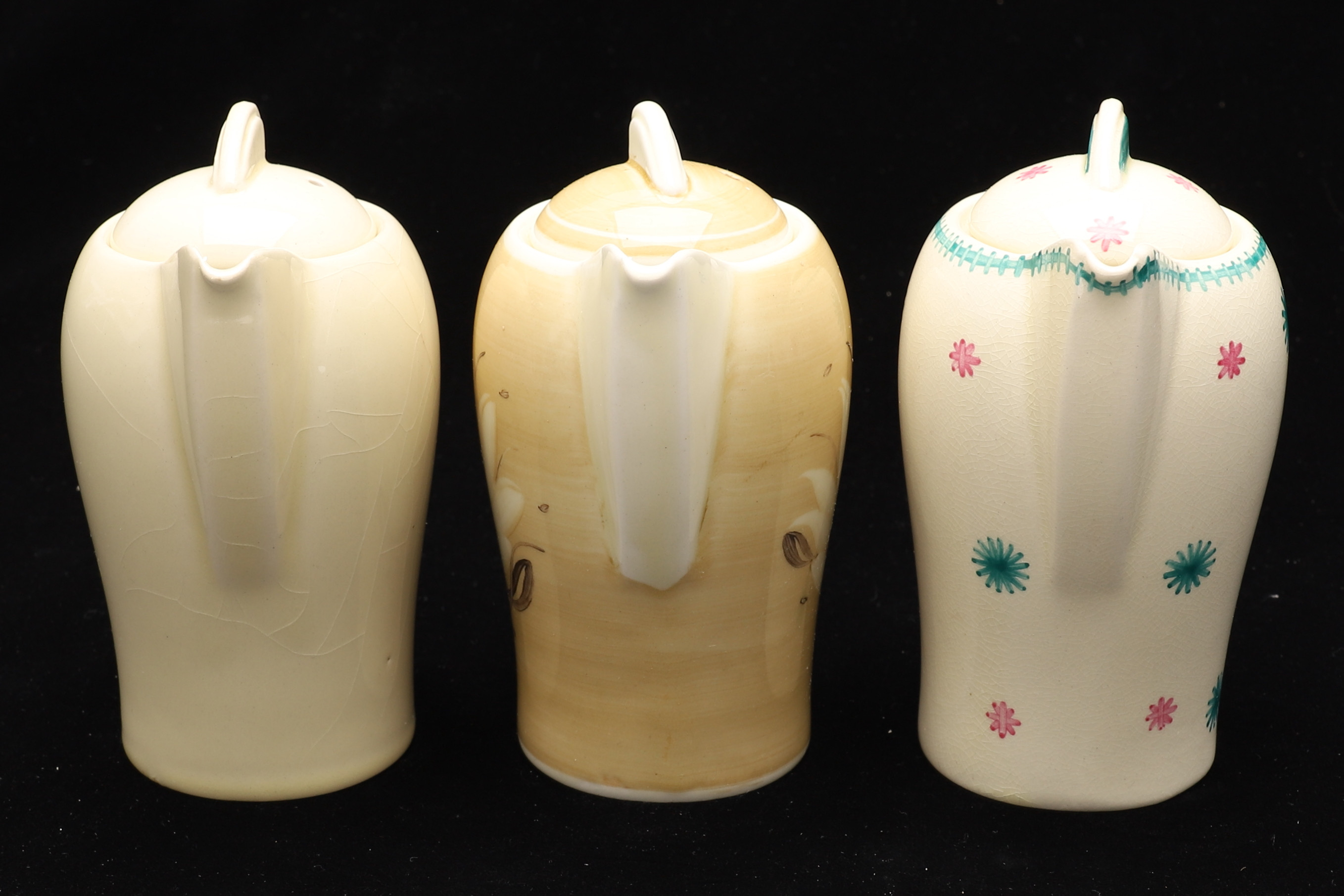 1986181. SUSIE COOPER FOR CROWN WORKS BURSLEM. THREE KESTREL SHAPE SINGLE COFFEE POTS AND COVERS.