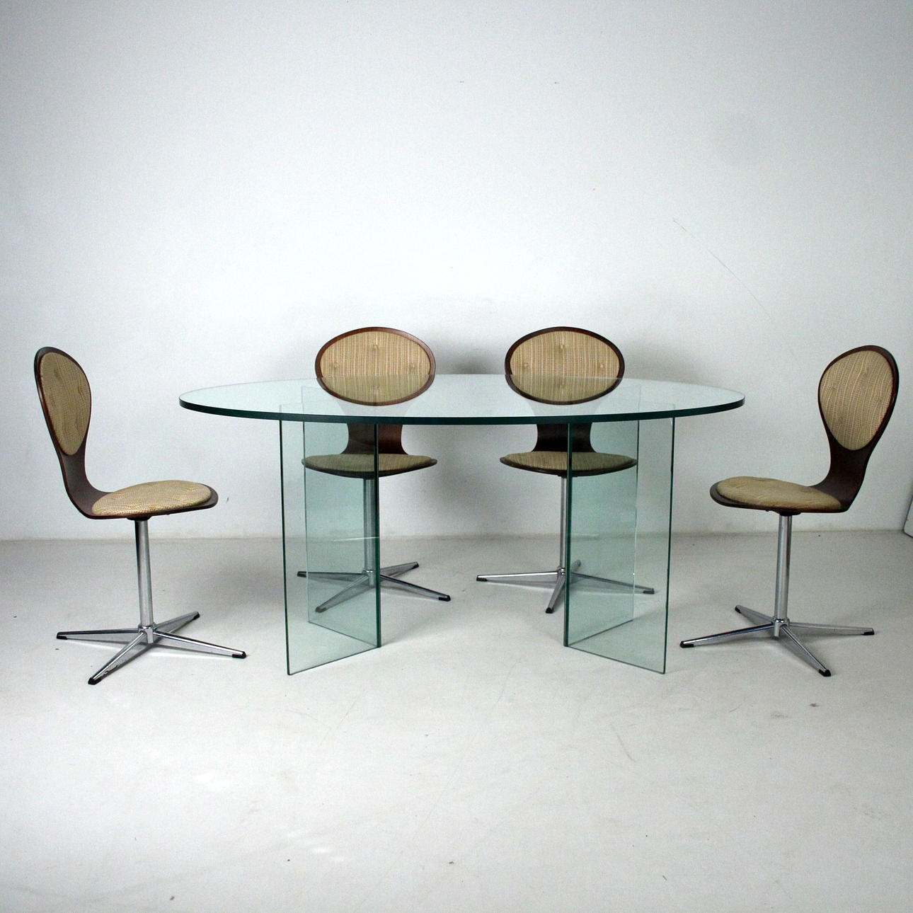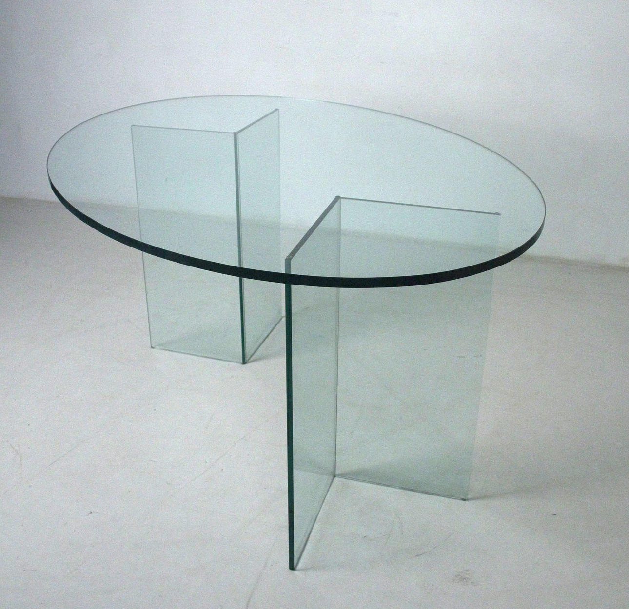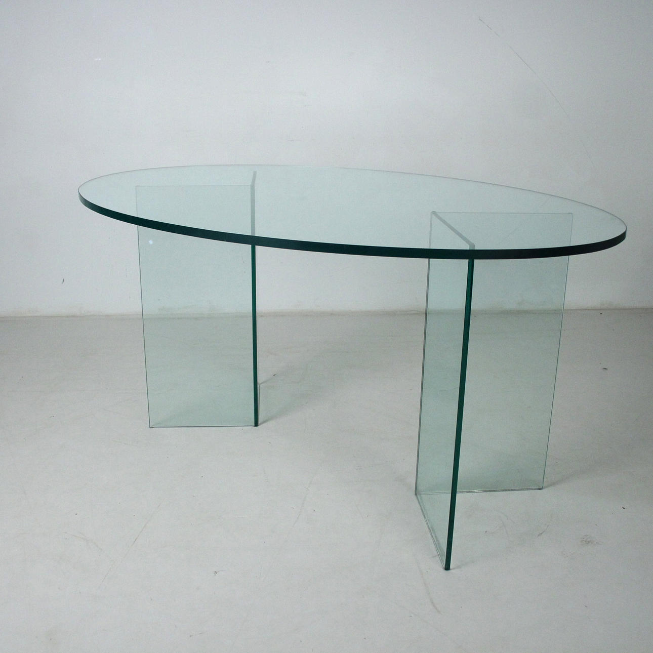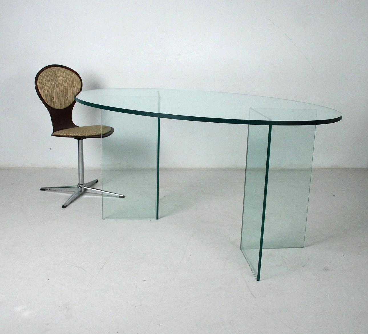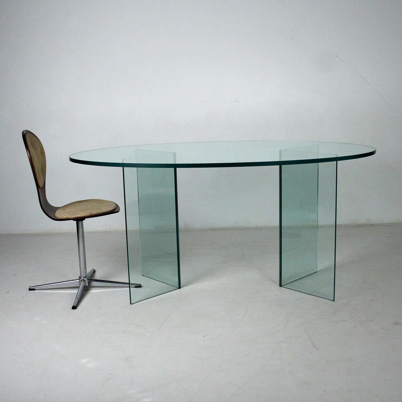 Glass table dining table from the 1970s/80s. V-shaped table frames with loose, oval glass top. Height: 76.5 cm, width: 160 cm, depth: 110 cm. The chairs shown are for size comparison only and are not part of the auction.